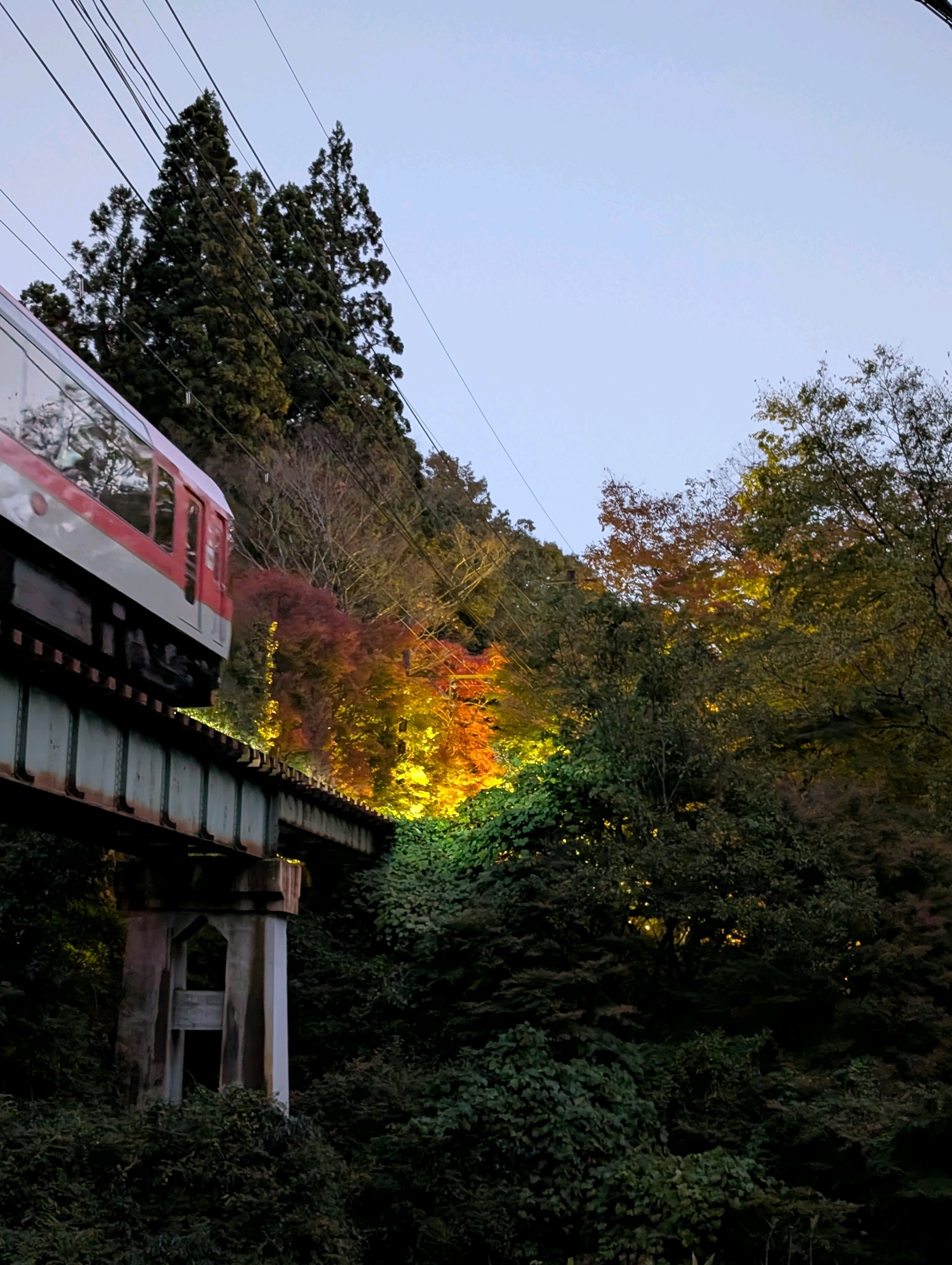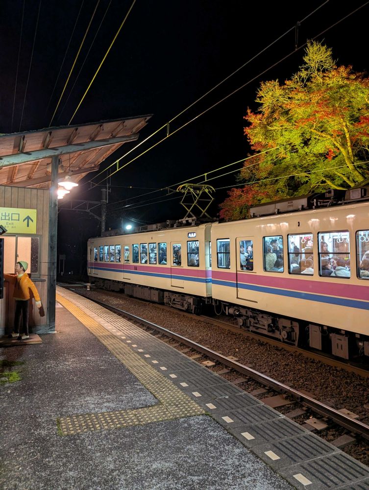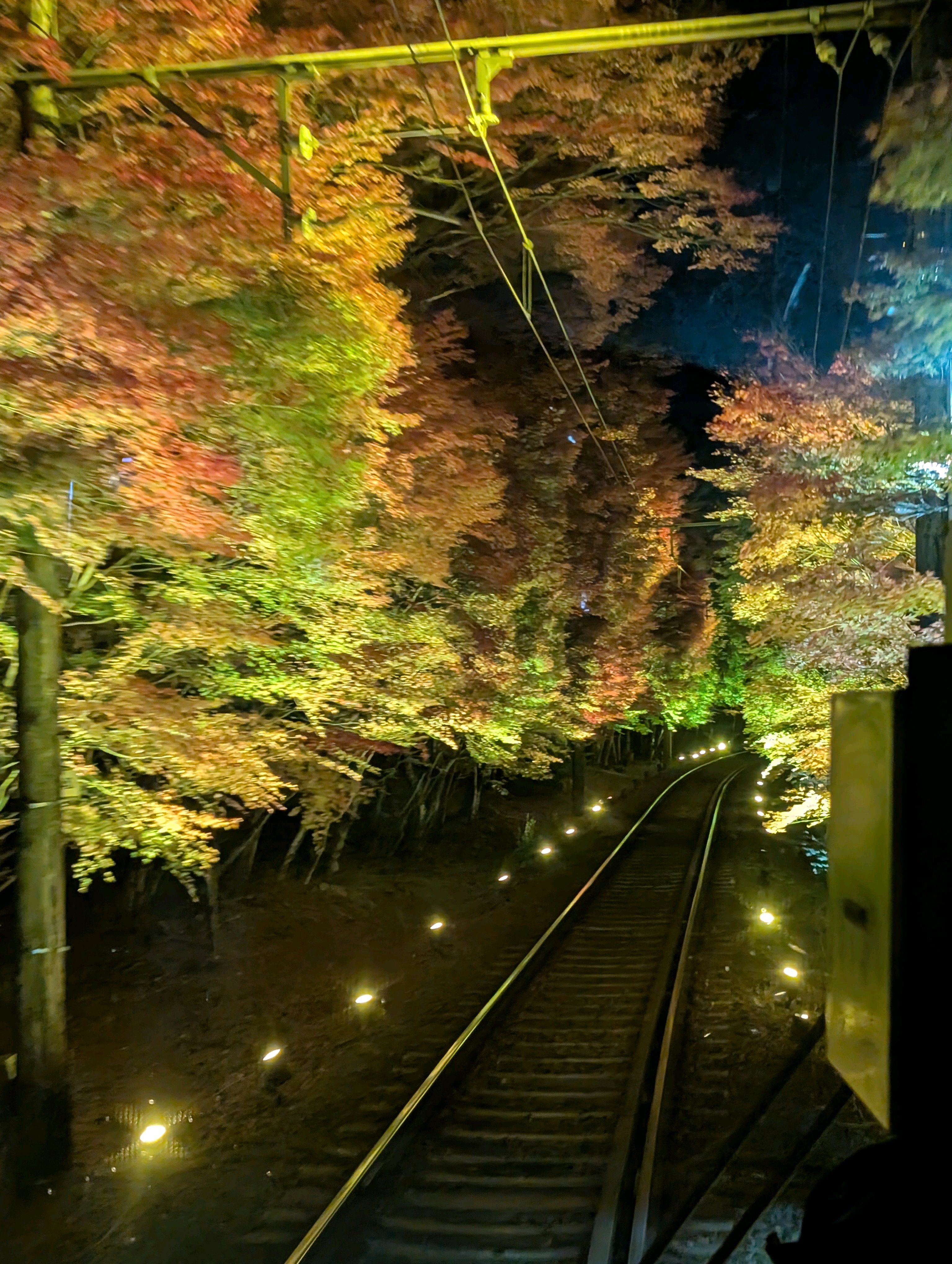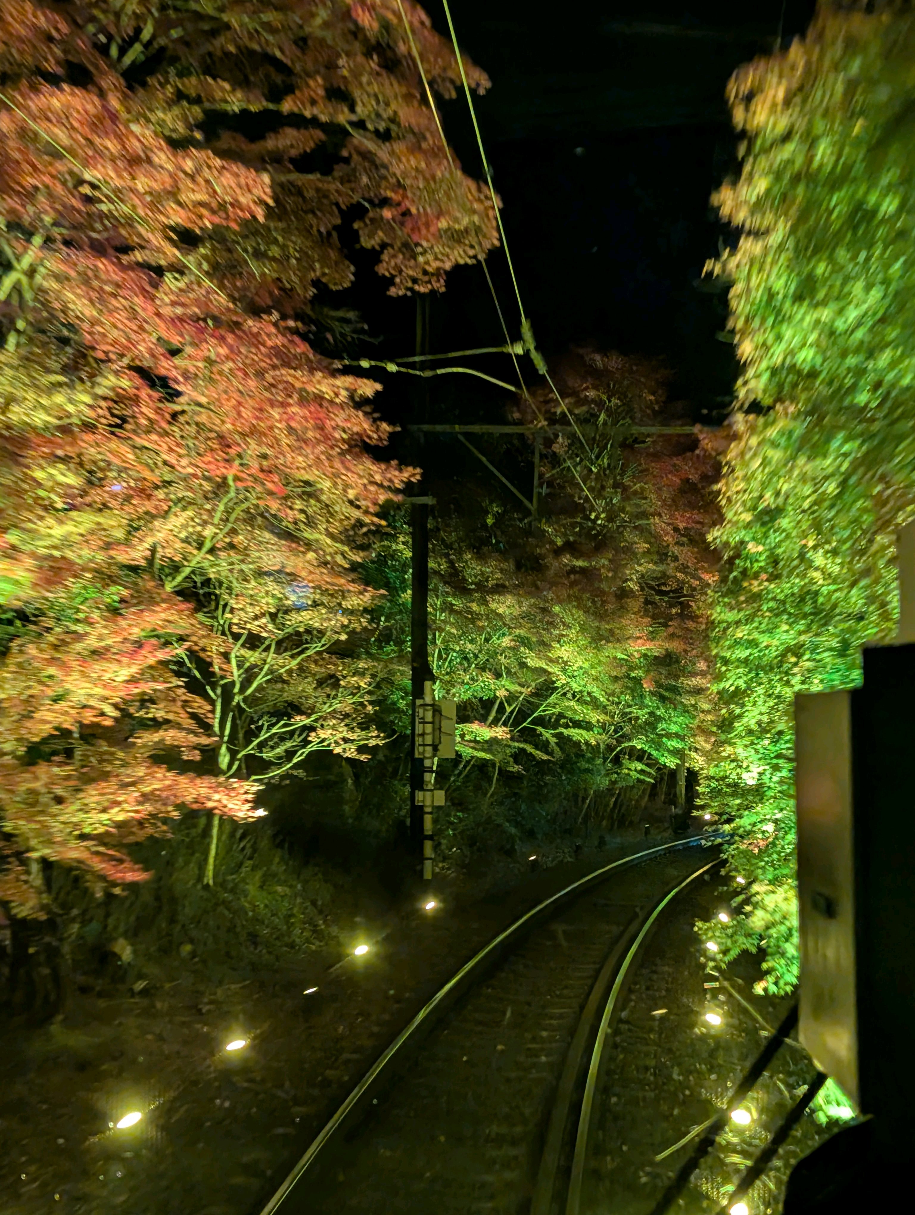 夜間に楽しめる叡山(えいざん)電車の車窓からの紅葉(こうよう)を紹介します