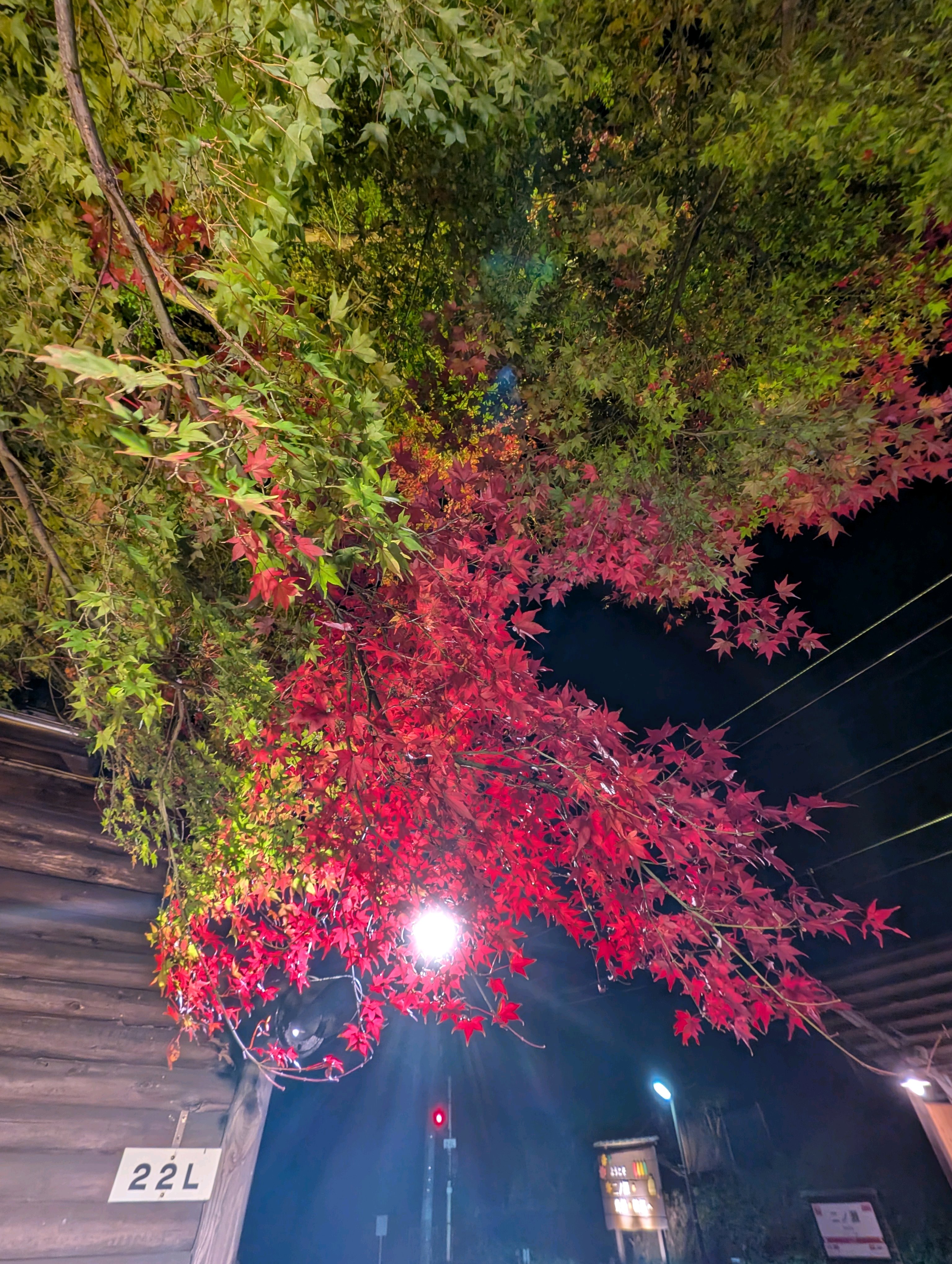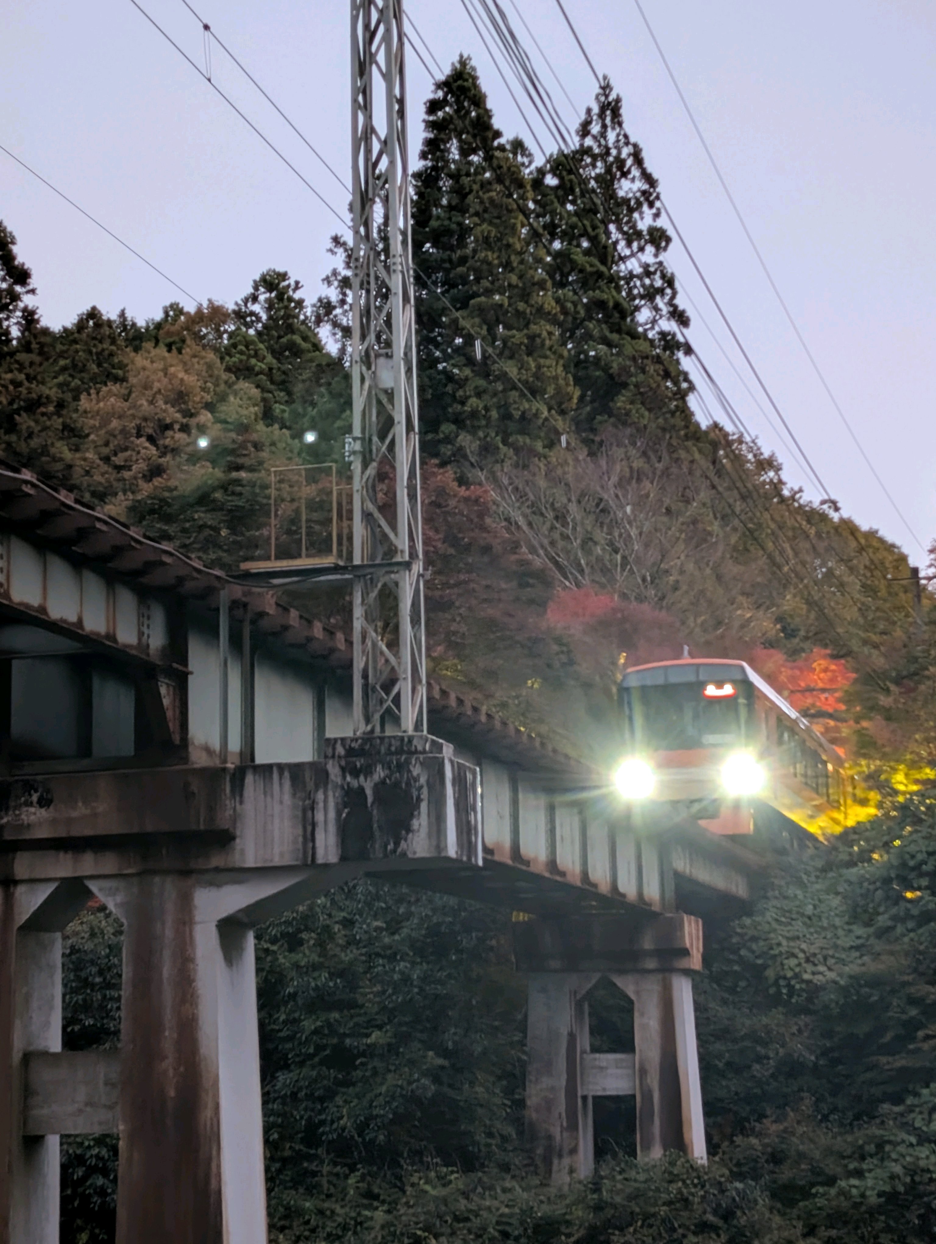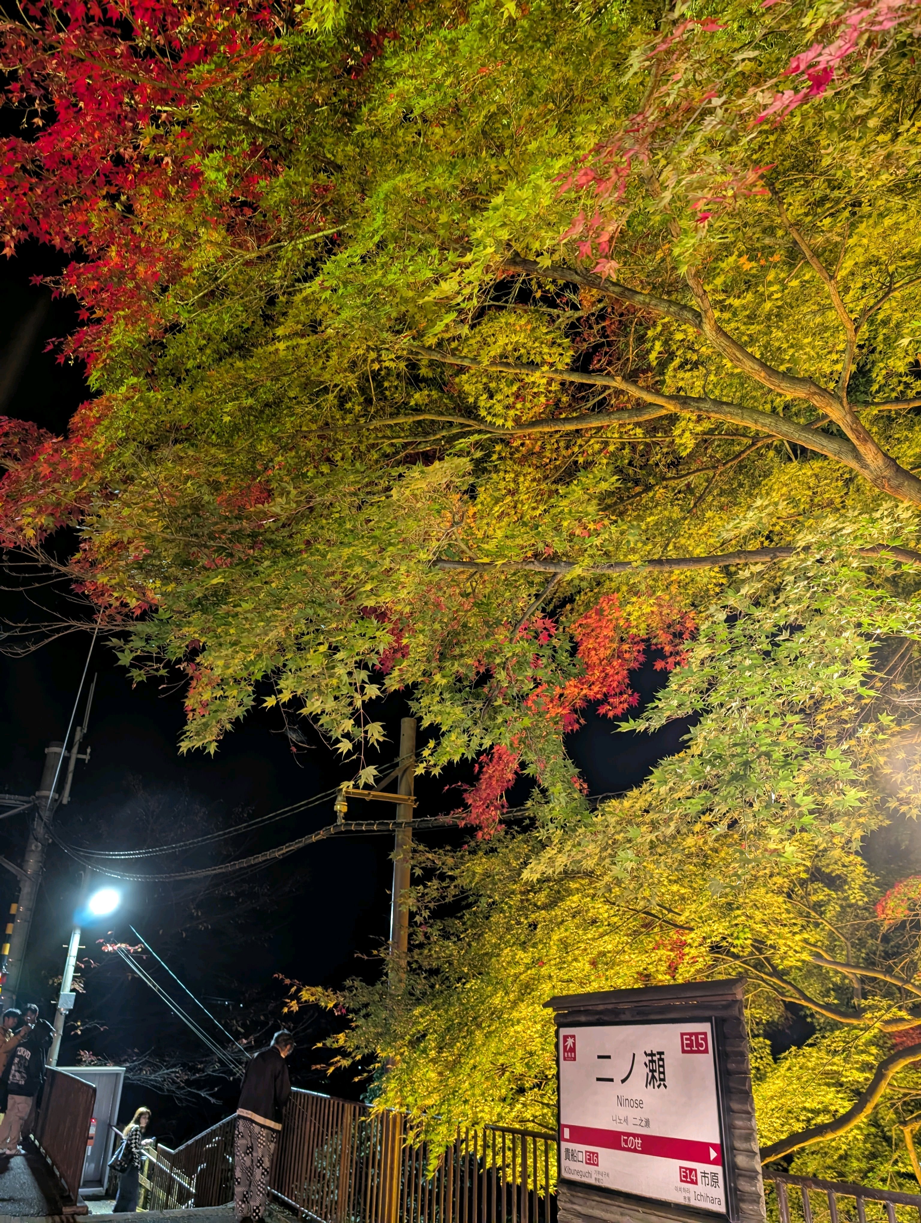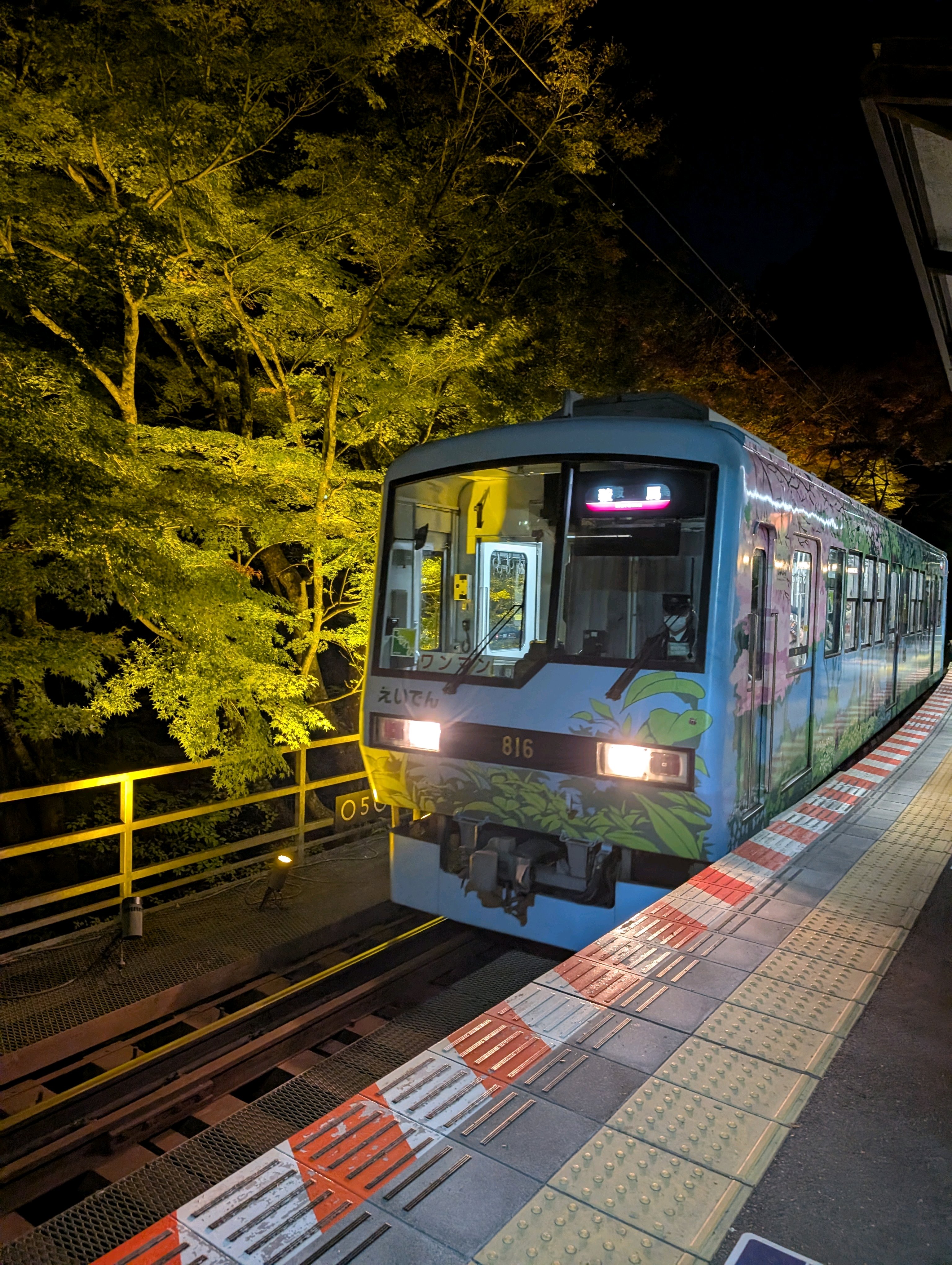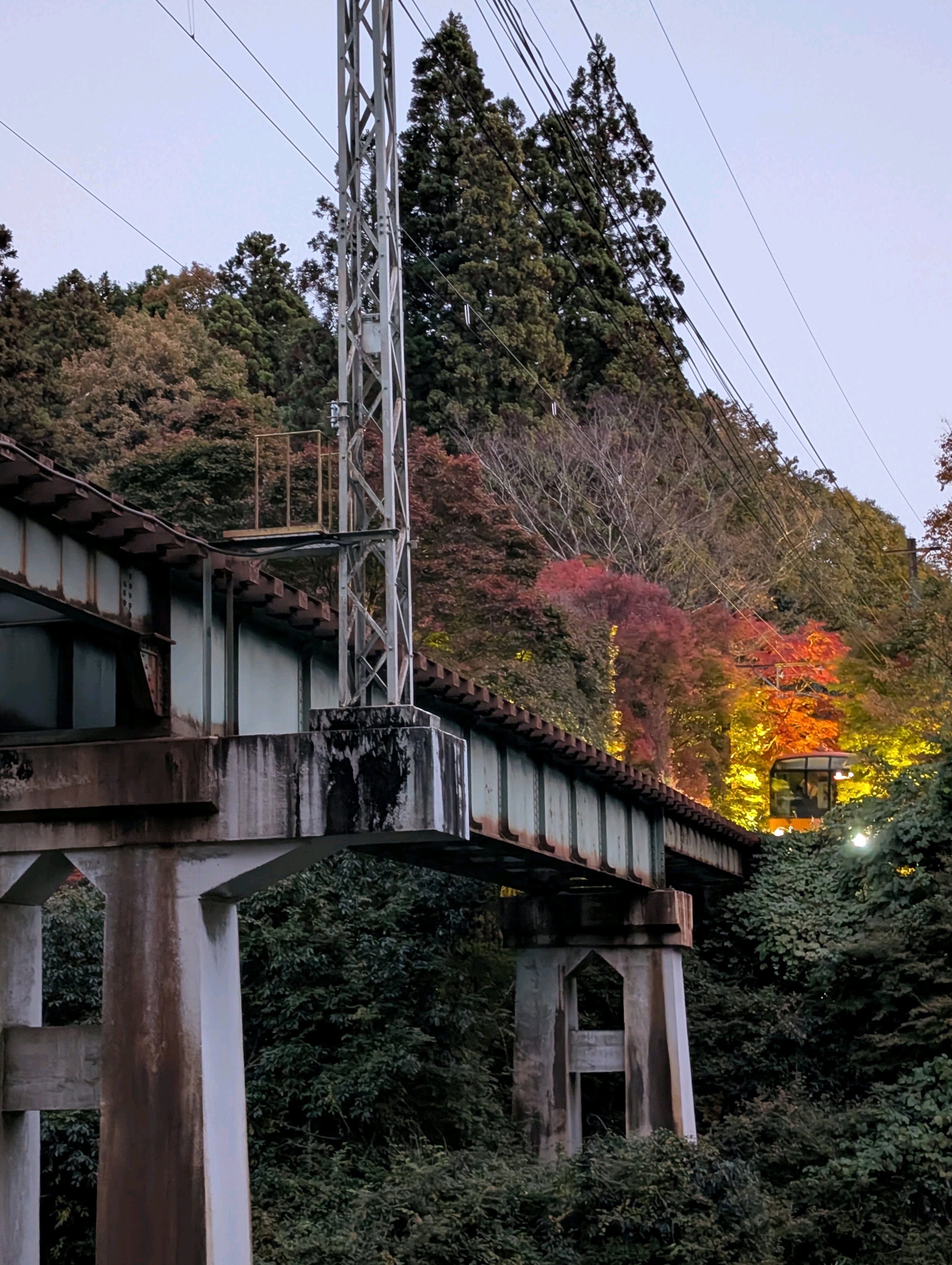 夜間に楽しめる叡山(えいざん)電車の車窓からの紅葉(こうよう)を紹介します