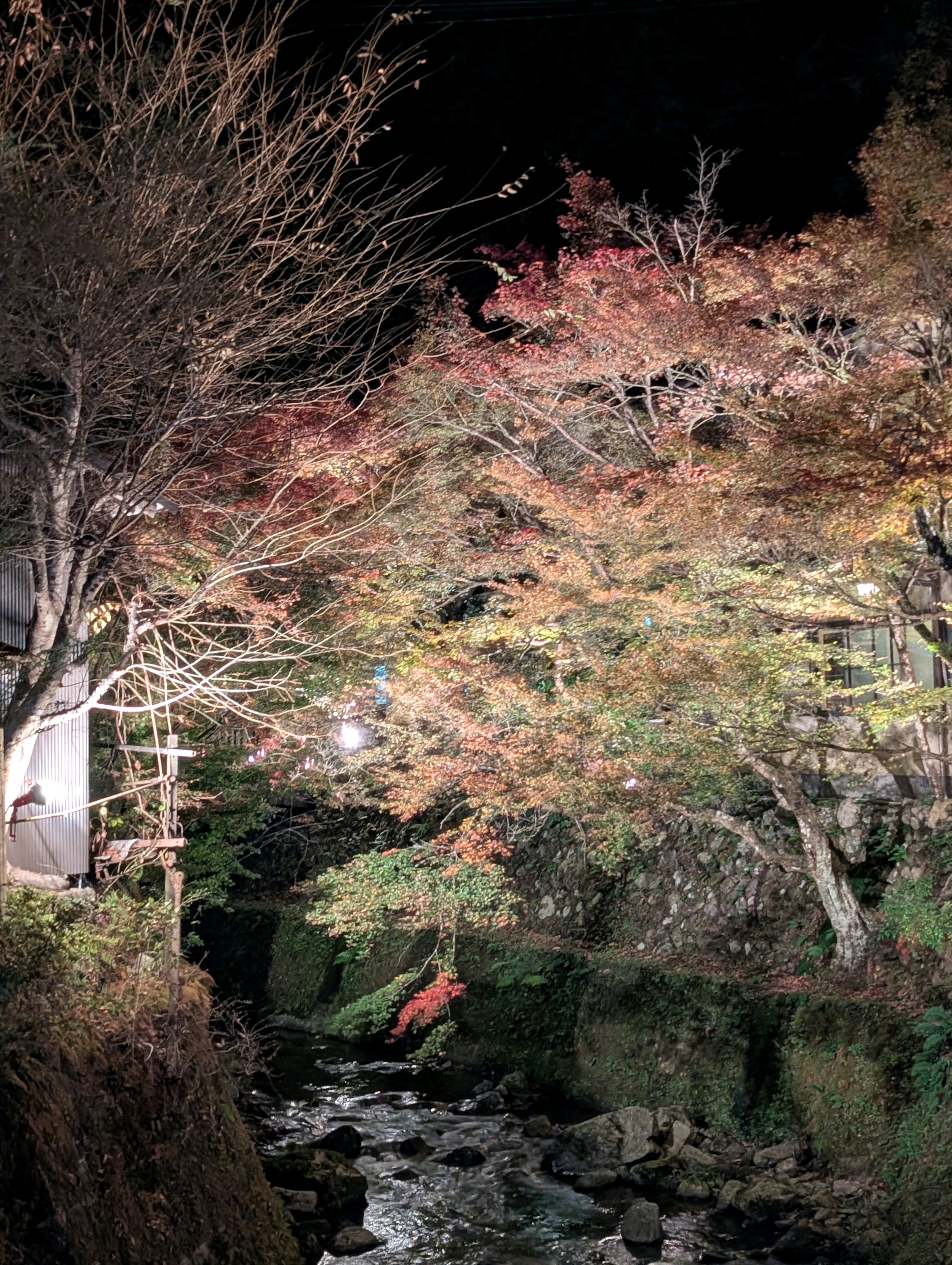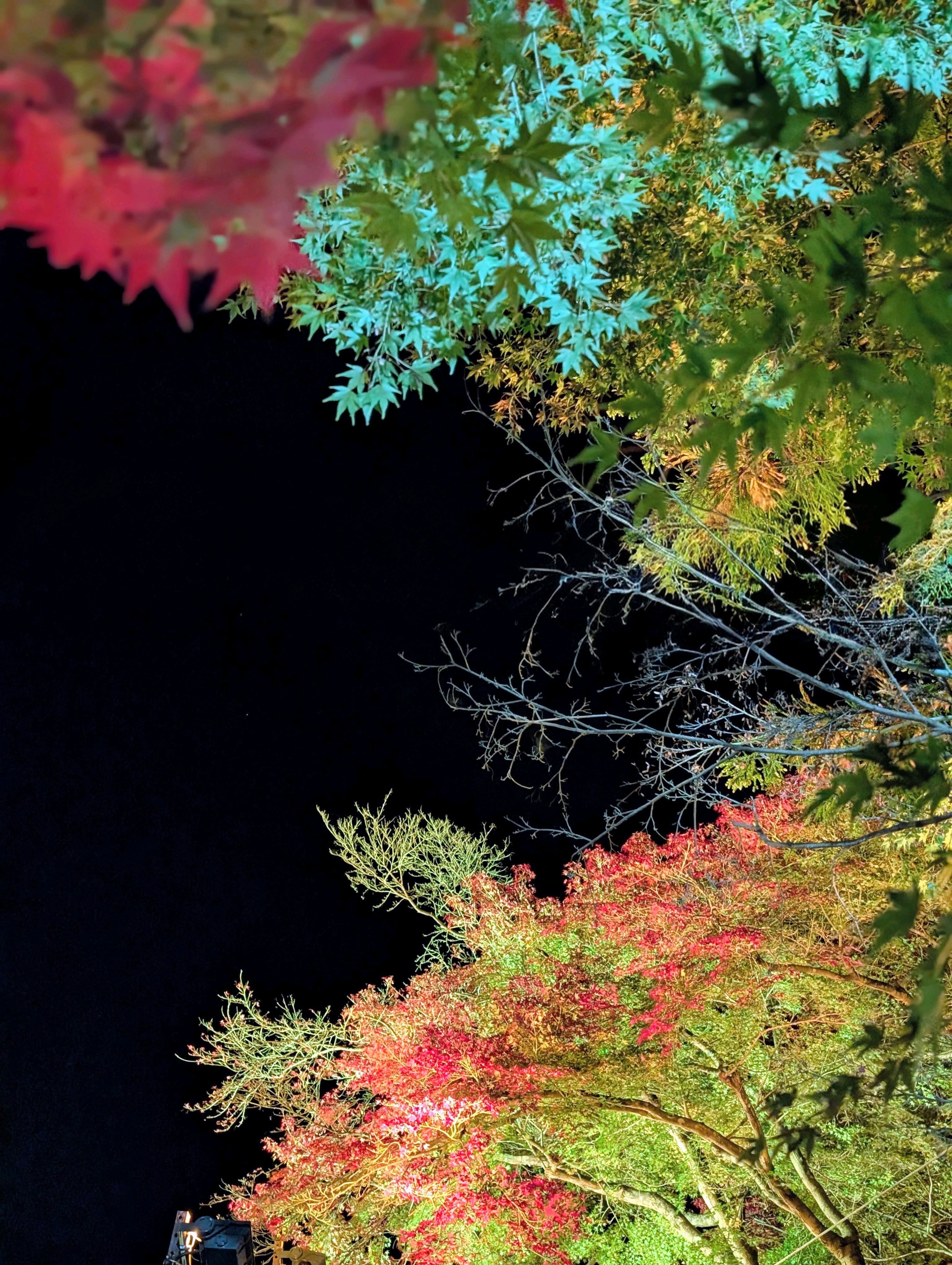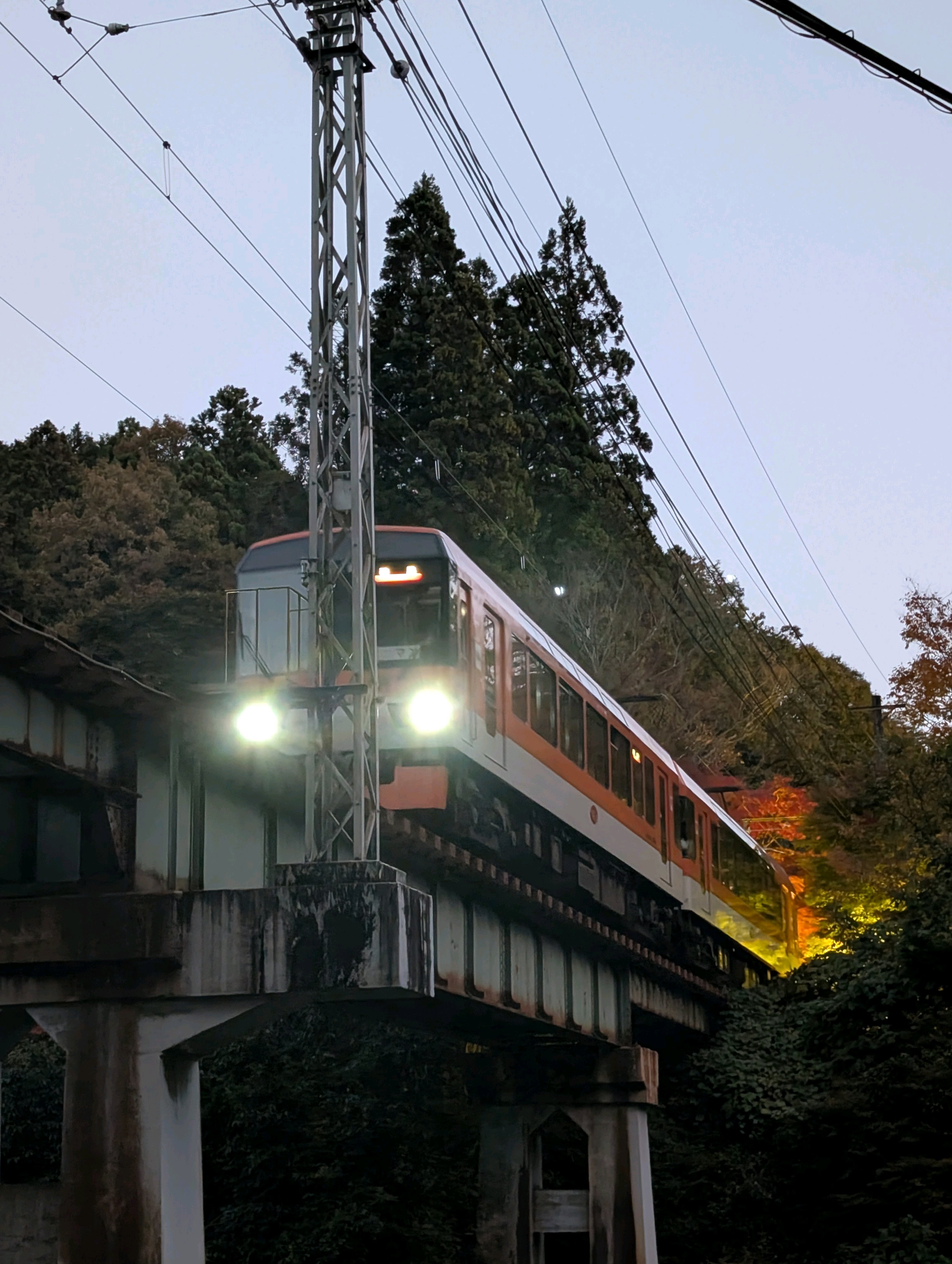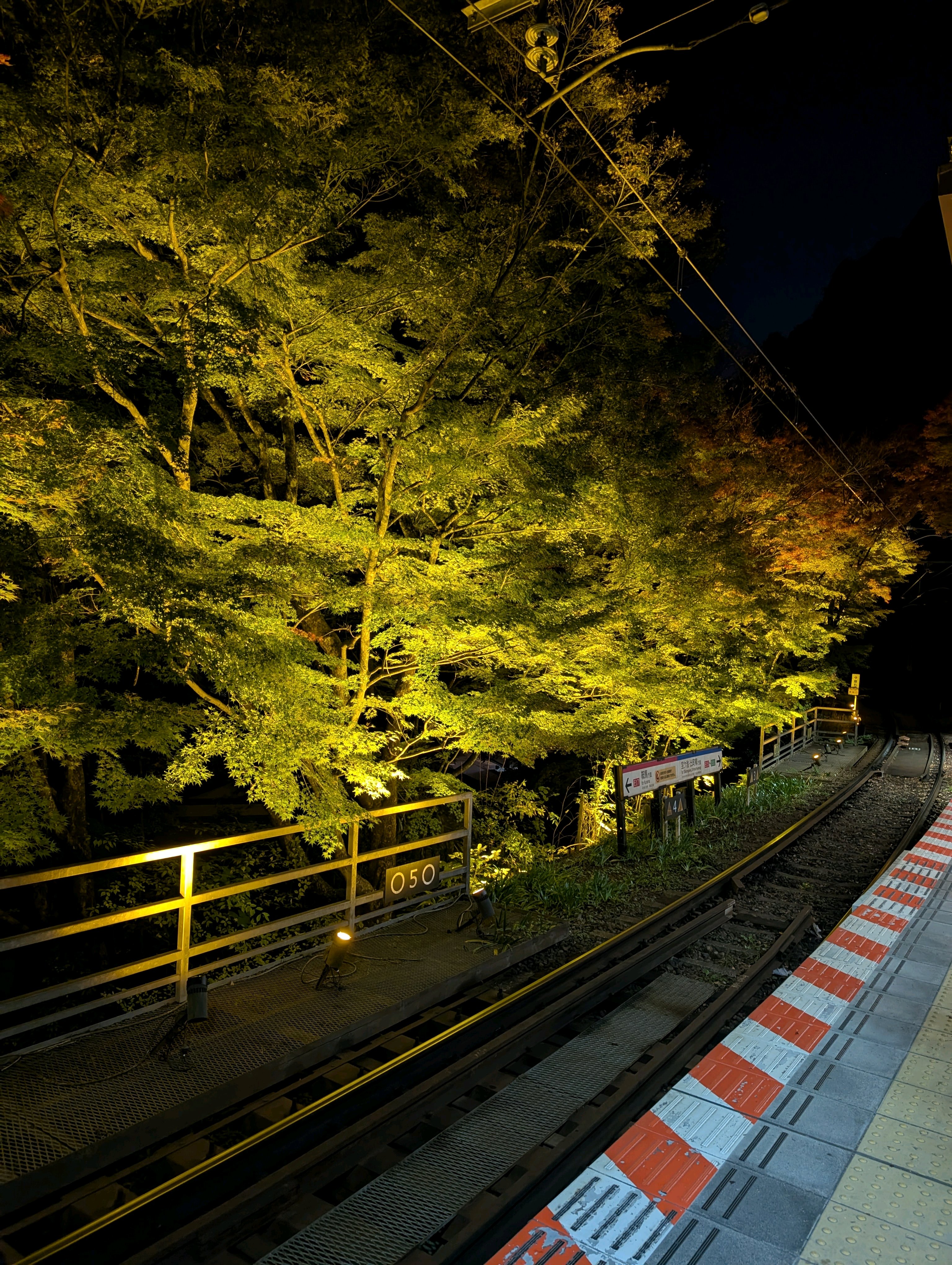 夜間に楽しめる叡山(えいざん)電車の車窓からの紅葉(こうよう)を紹介します