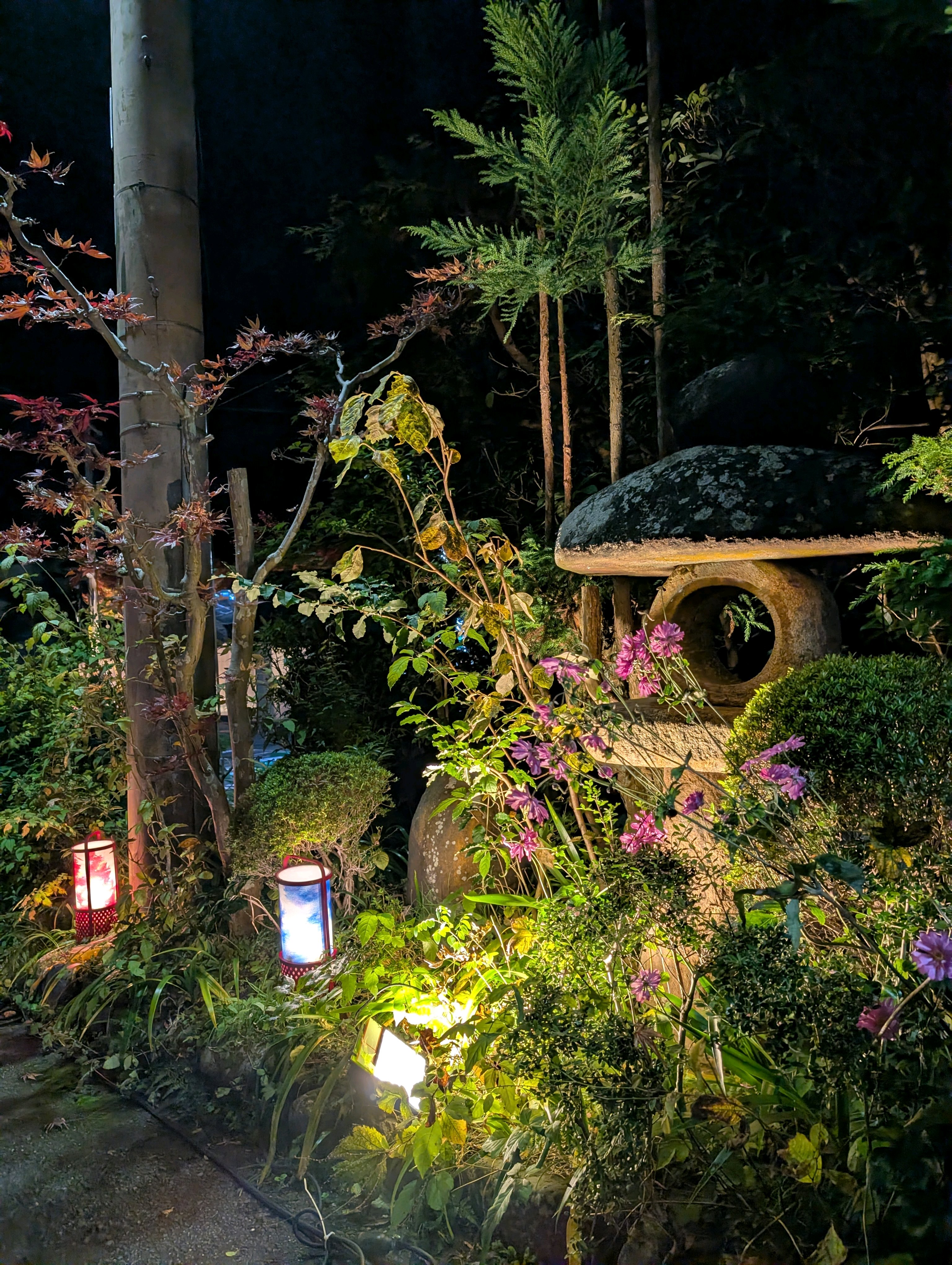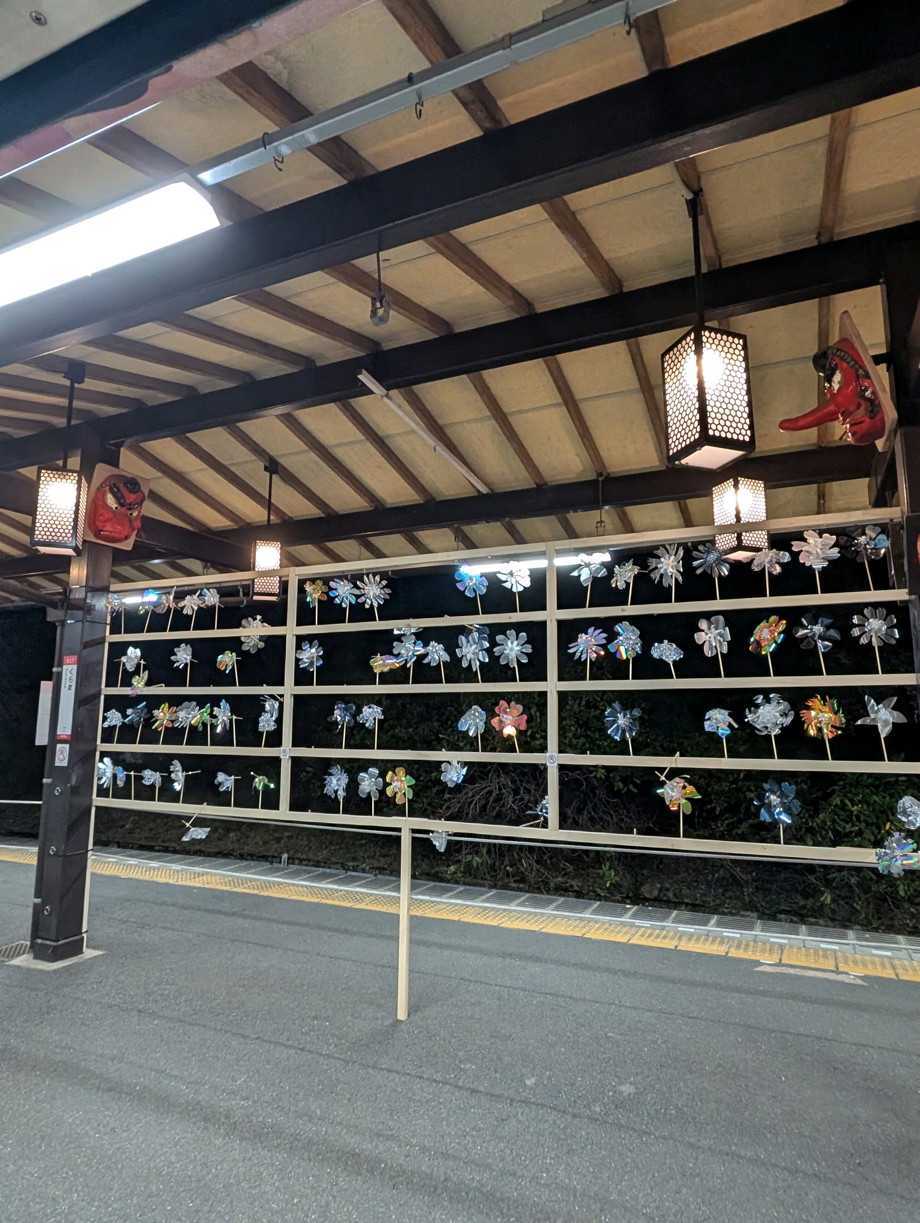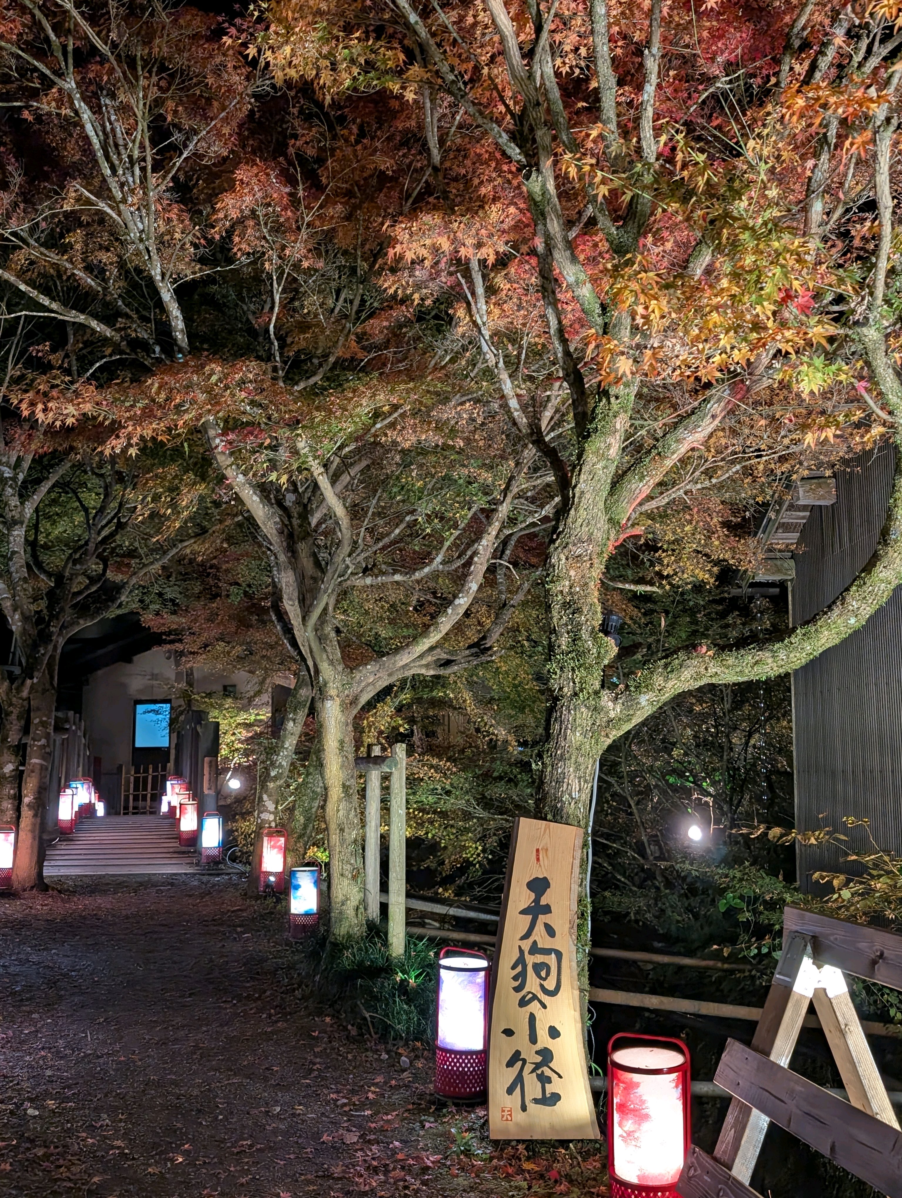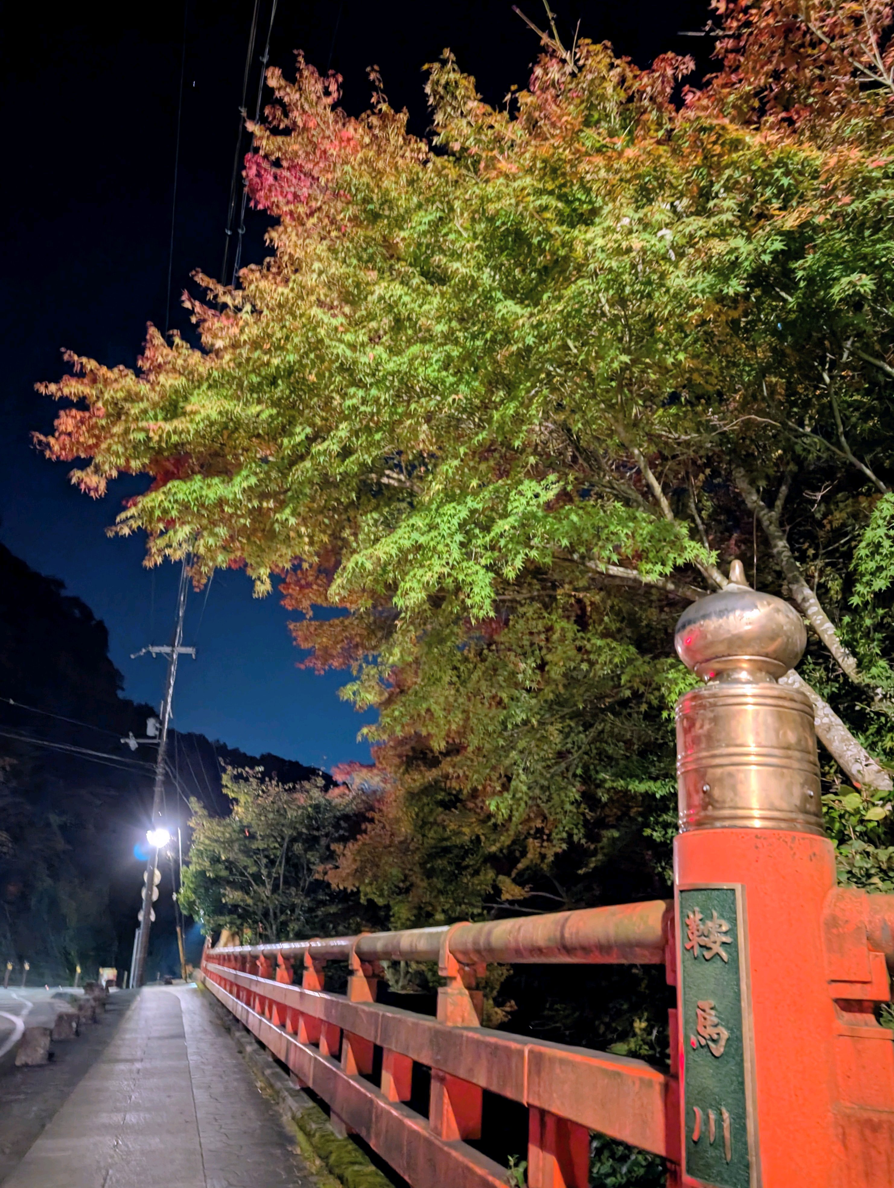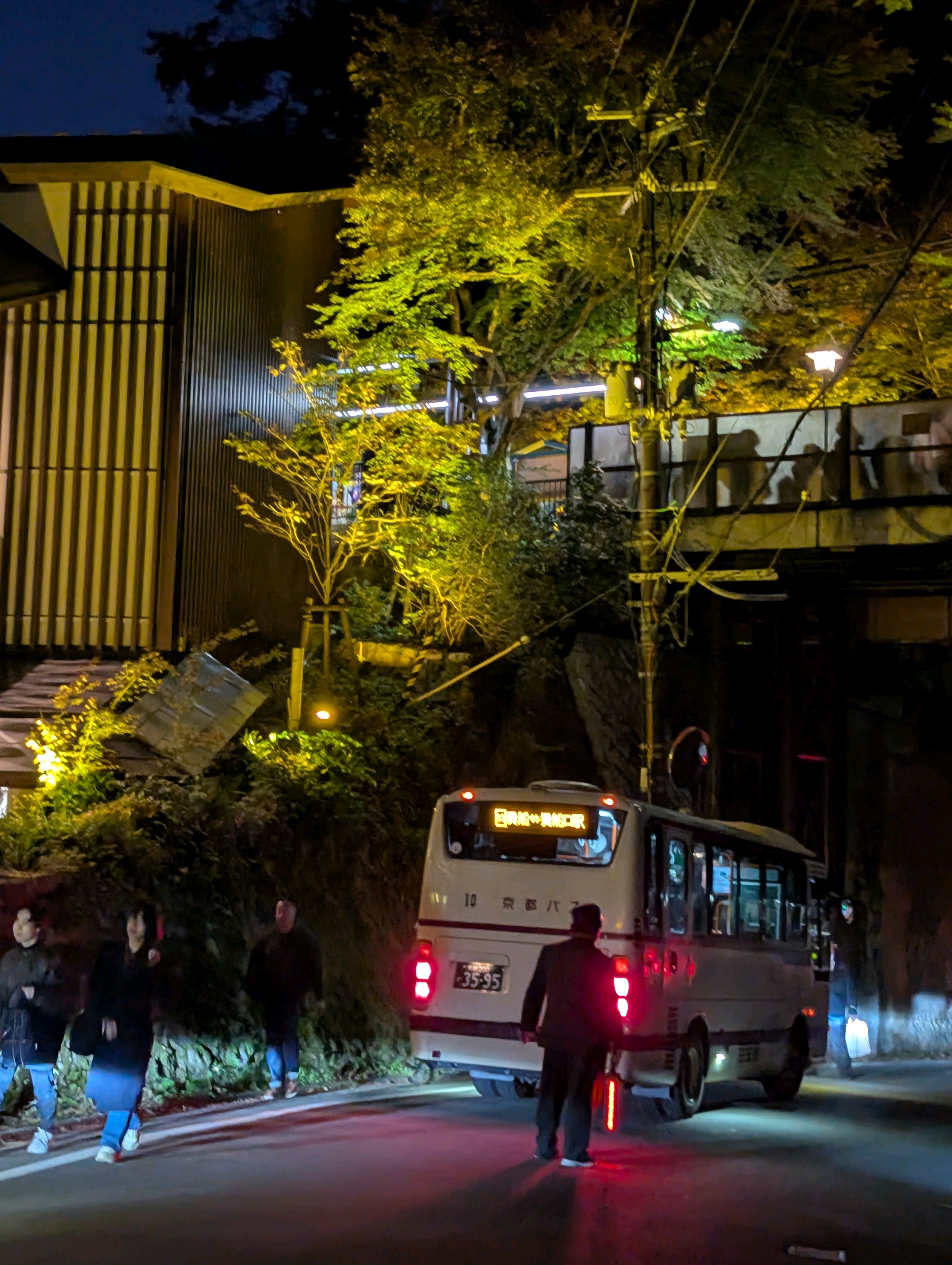 夜間に楽しめる叡山(えいざん)電車の車窓からの紅葉(こうよう)を紹介します