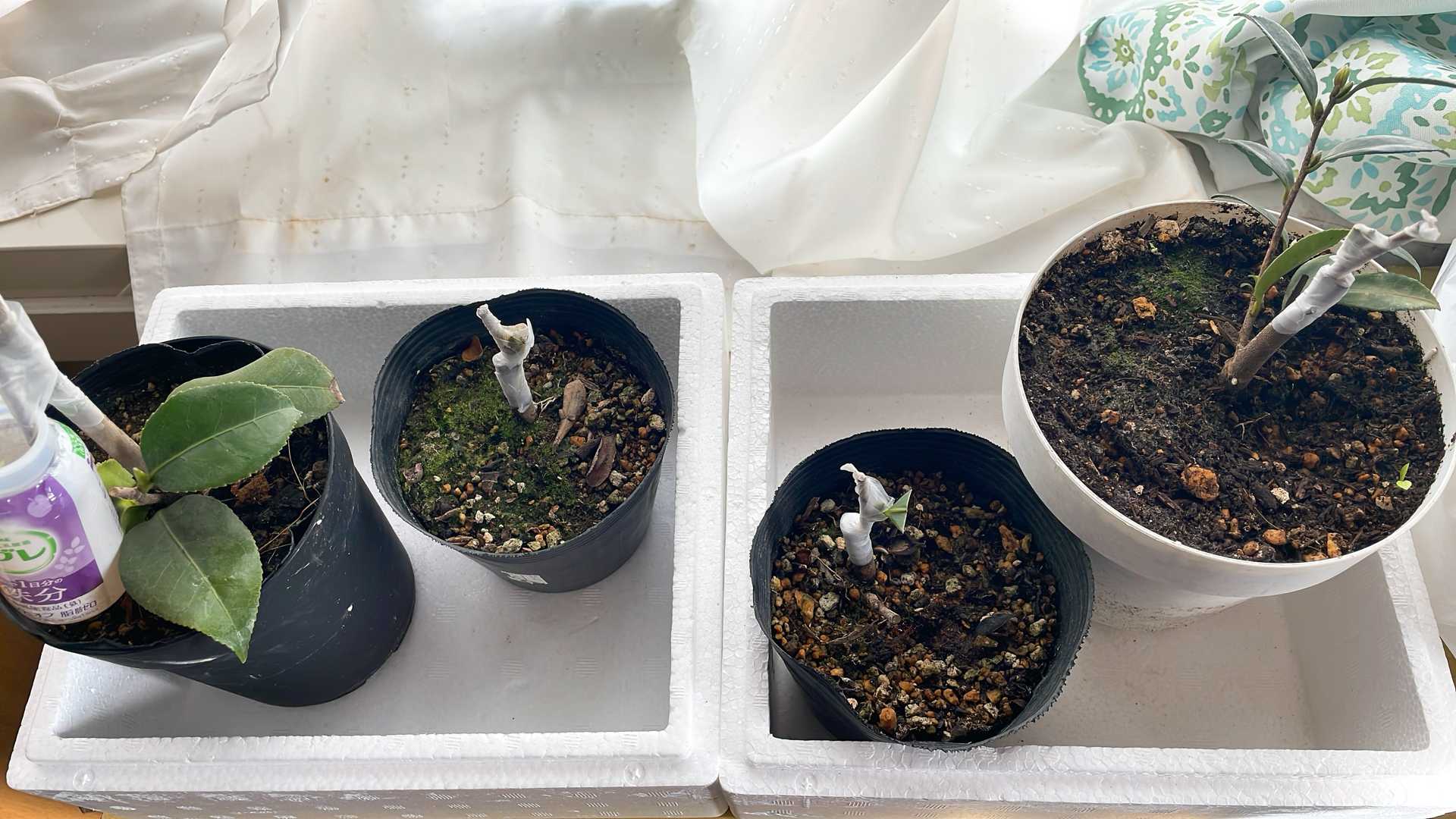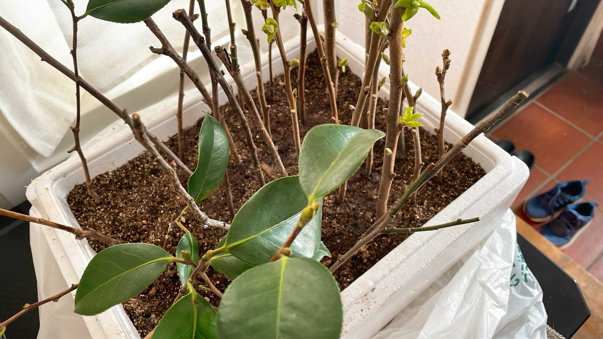 こちらは2月末に植木屋さん(?)が色々挿してくれたトロ箱。柿は枝のエネルギーで早々に芽吹いた🌱梅と柿は野菜室に休眠枝があるからそのうち接木もしてみる予定🪵