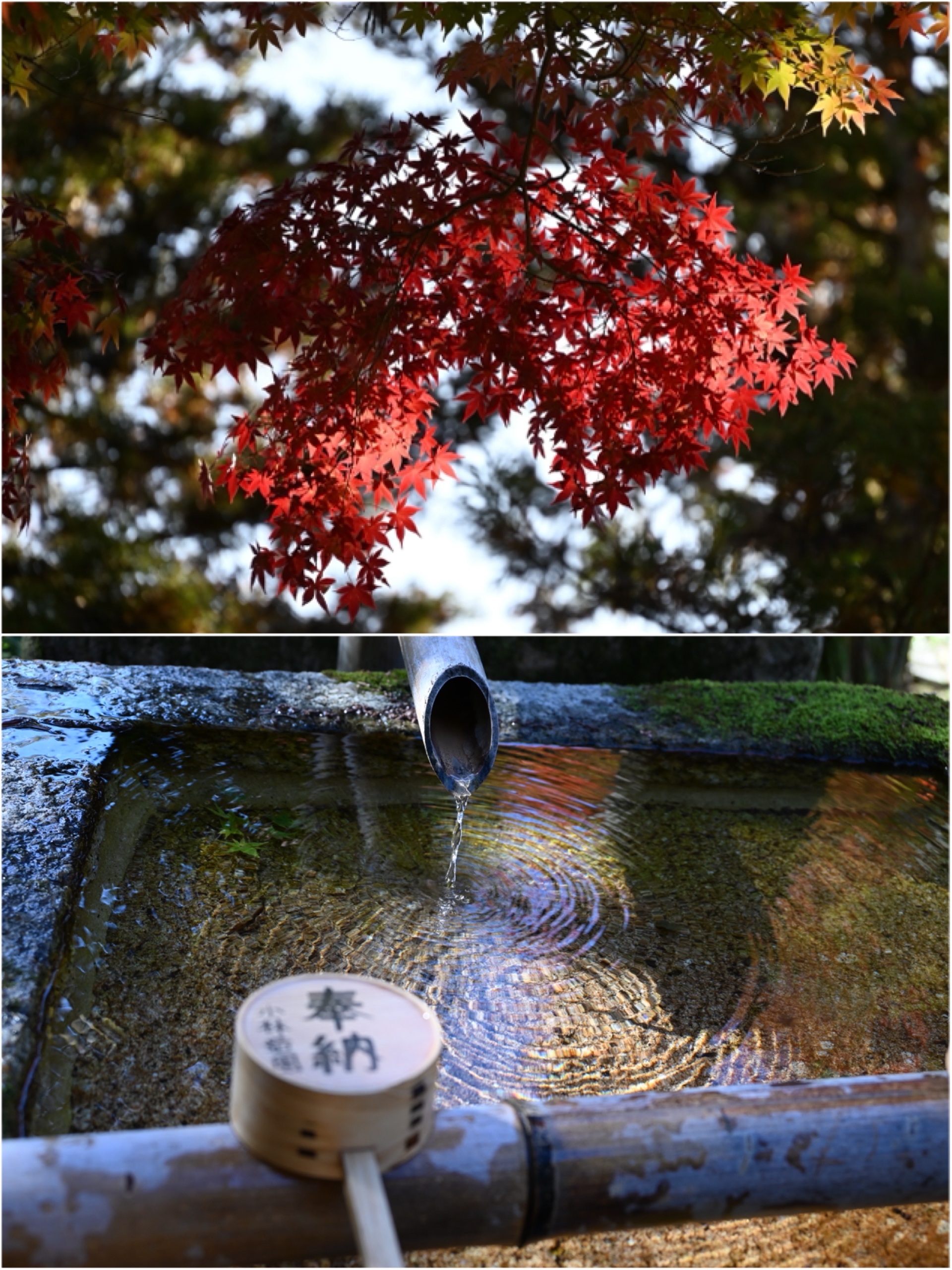 まだ落ち葉は殆どなく、竹筒から清めの水の波紋と、手水舎の水鏡にうっすら映る紅葉に風情と静けさを感じました🍁
