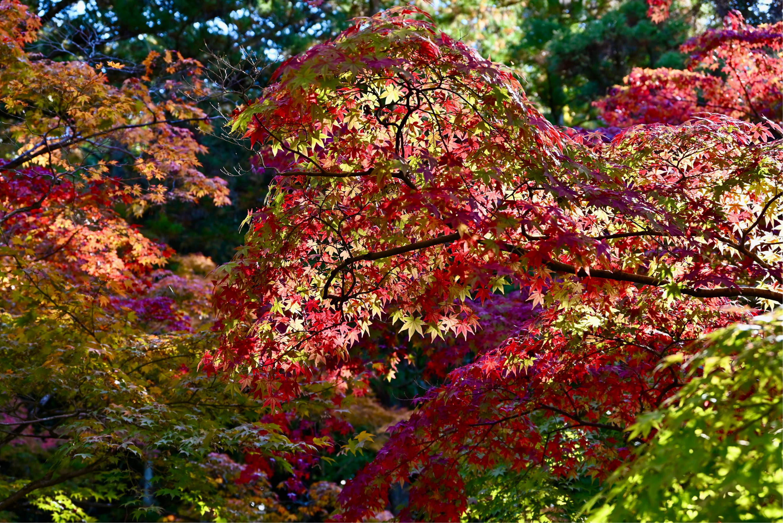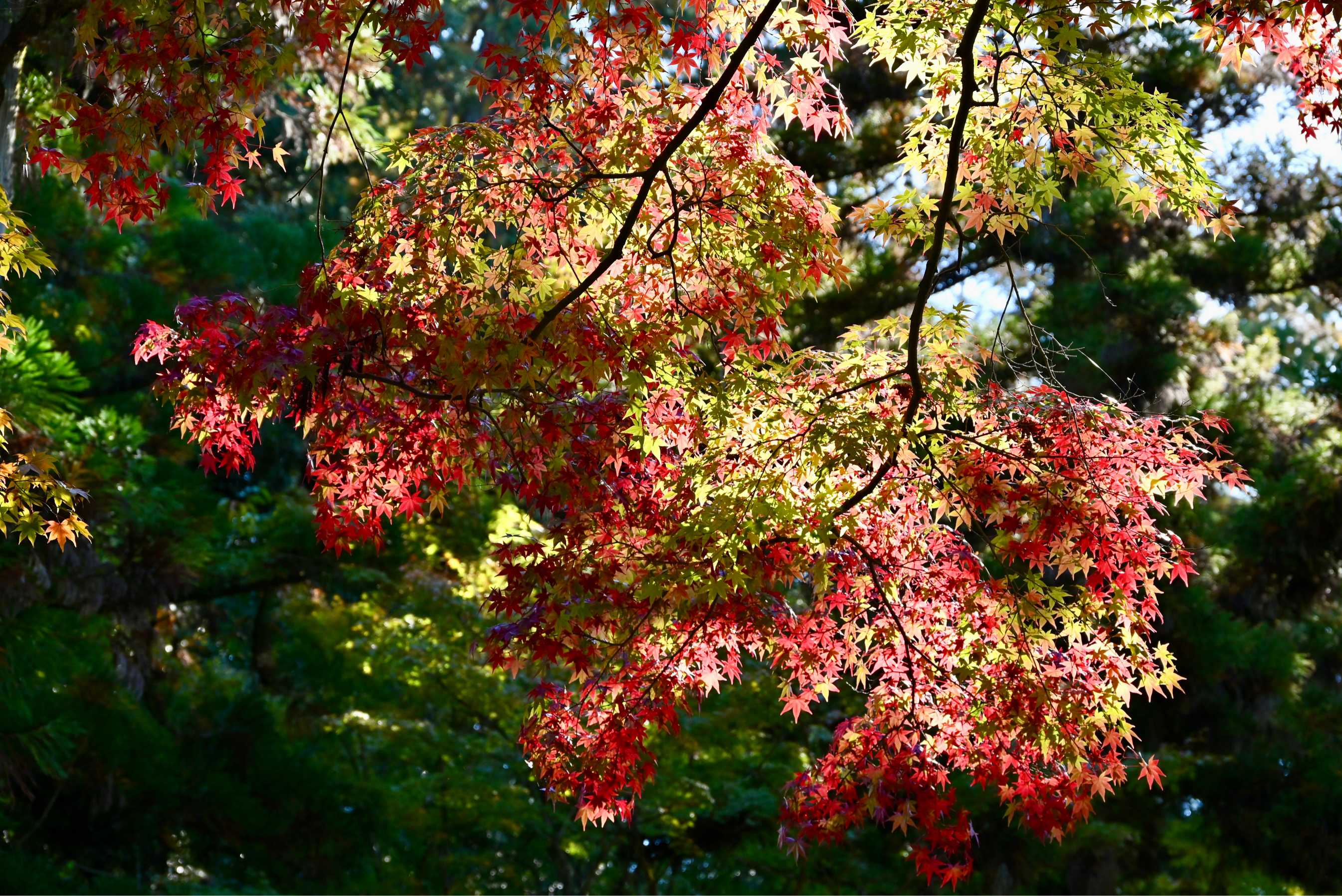 陽の光に輝く色とりどりの紅葉が、背景の緑に引き立ちとても綺麗です🍁🍁🍁✨️✨️