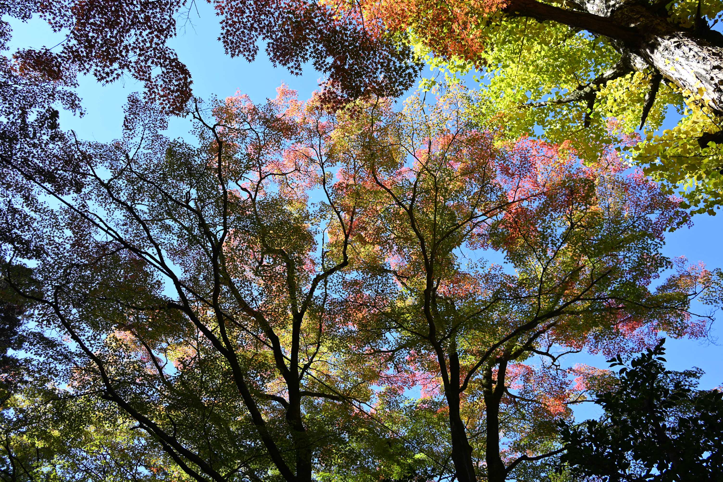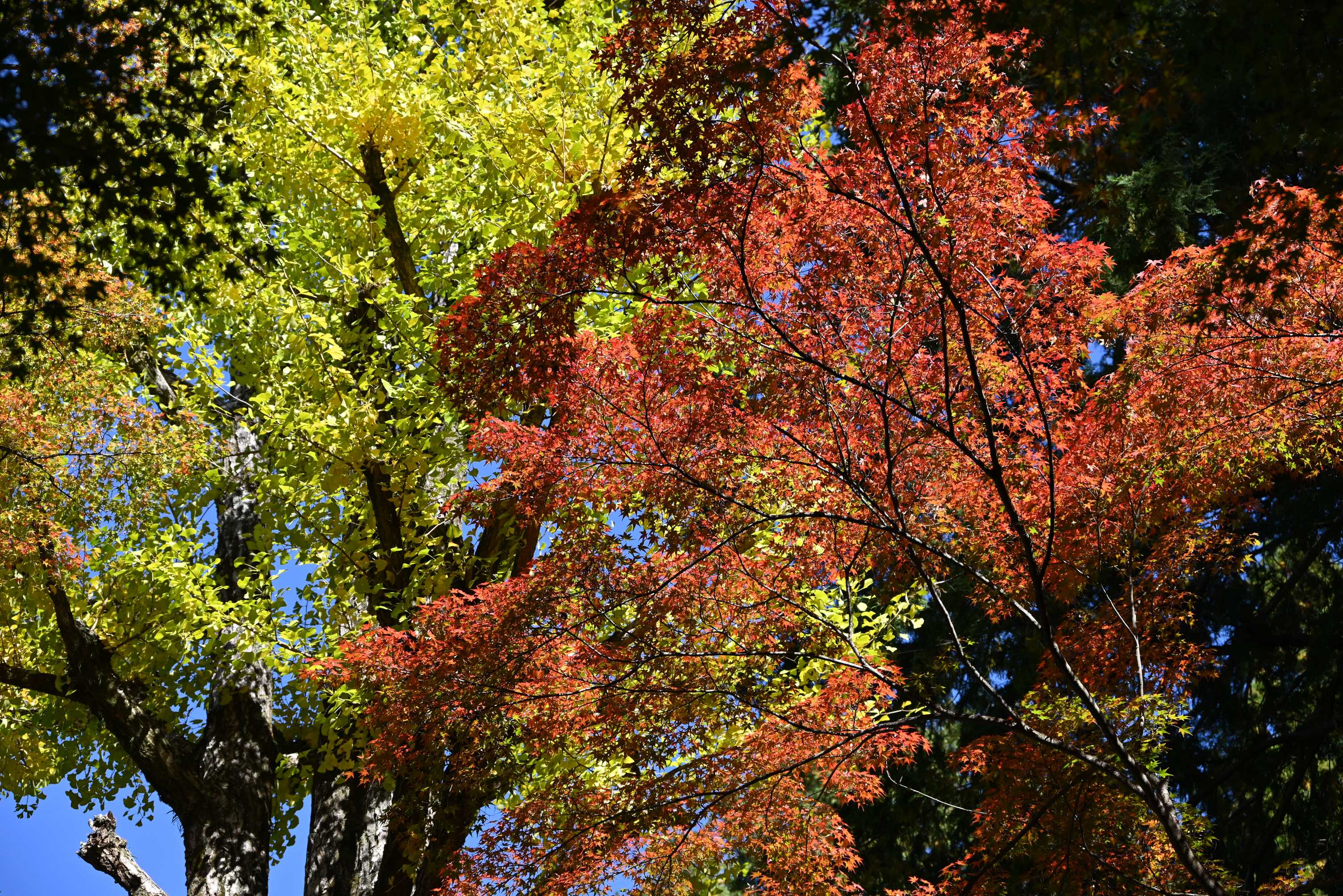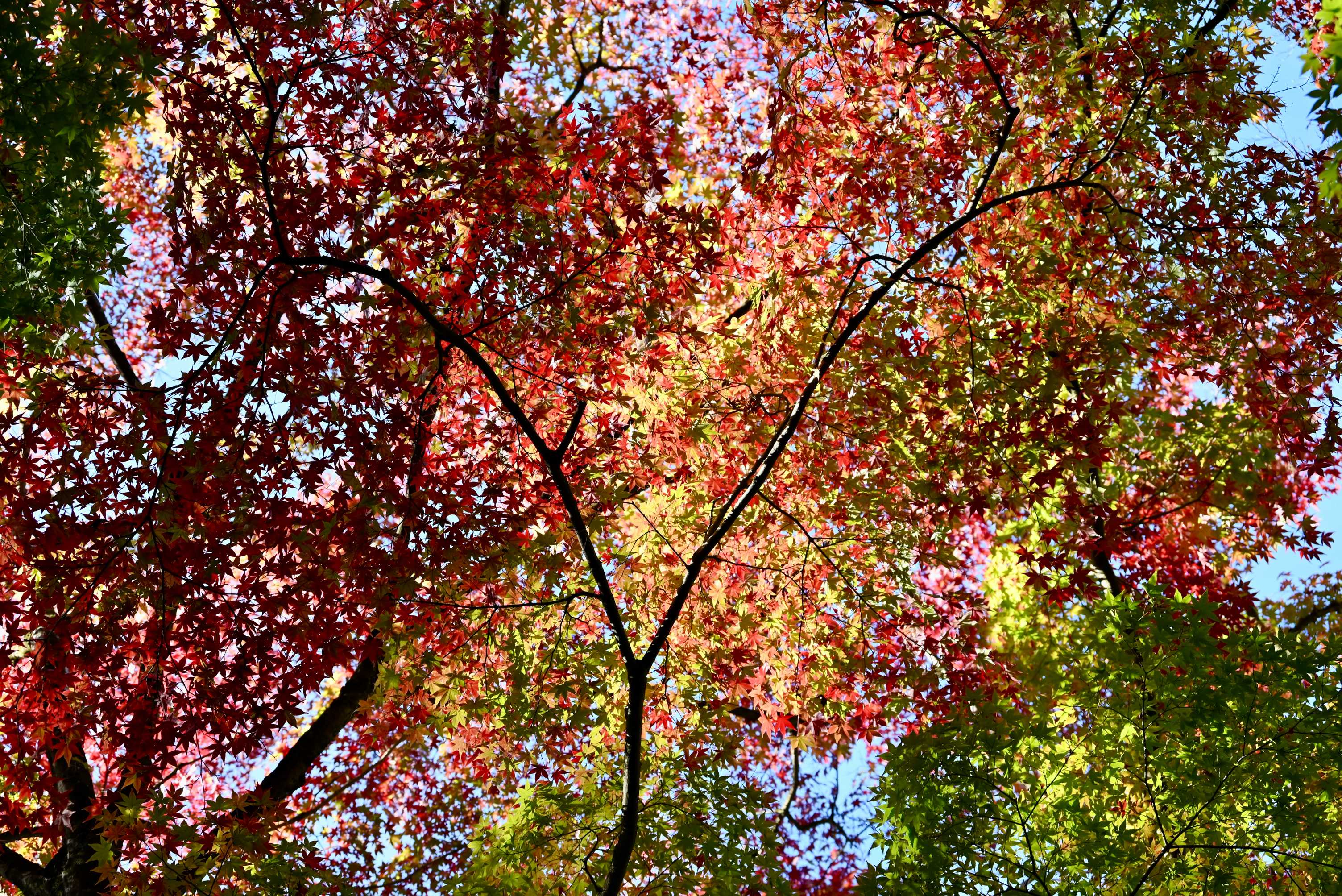 天を仰ぐと青空に広がる綺麗な紅葉🍁