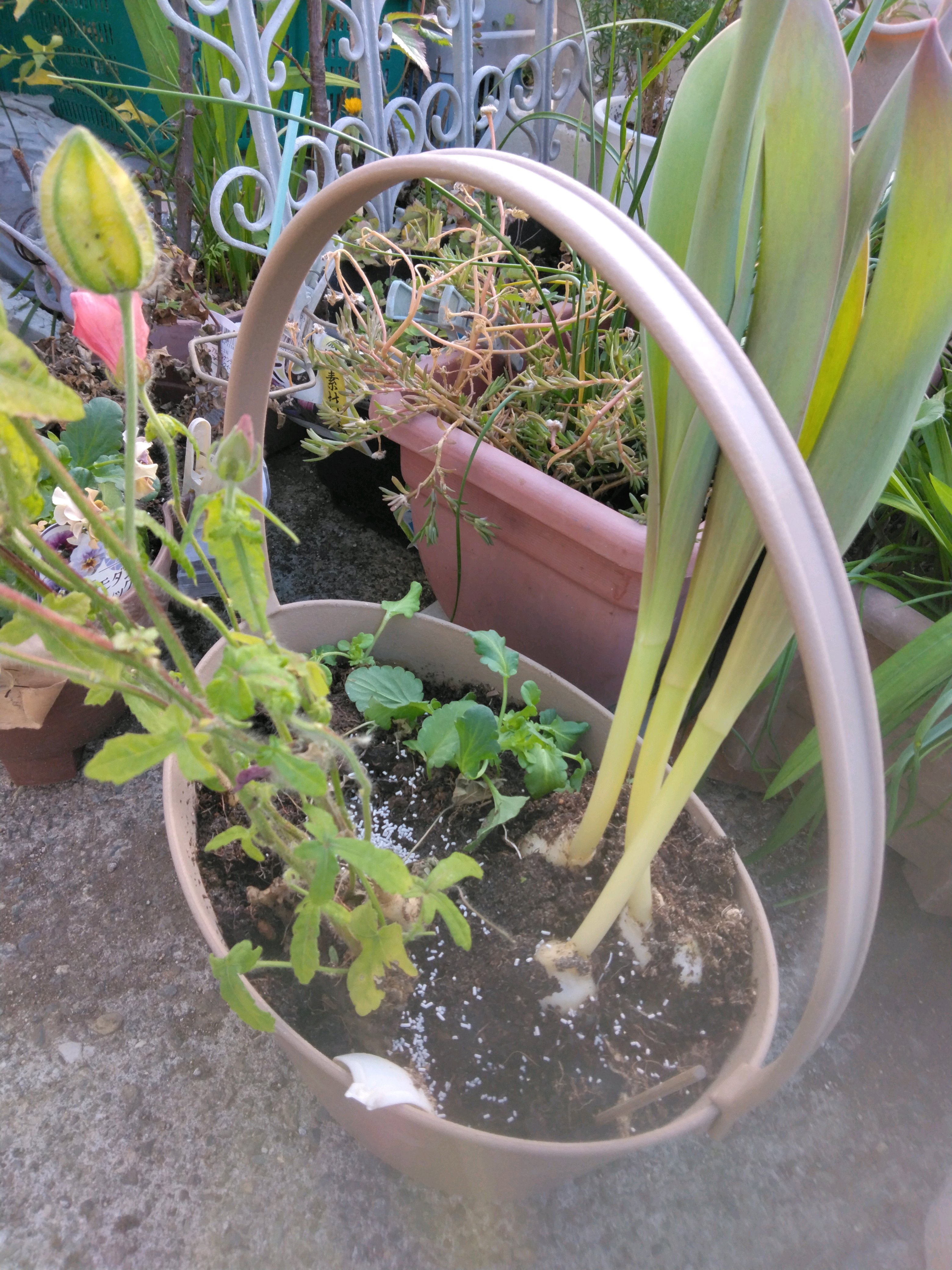 芽出し済み球根チューリップは葉の長さが長く、長ネギみたいに見えた