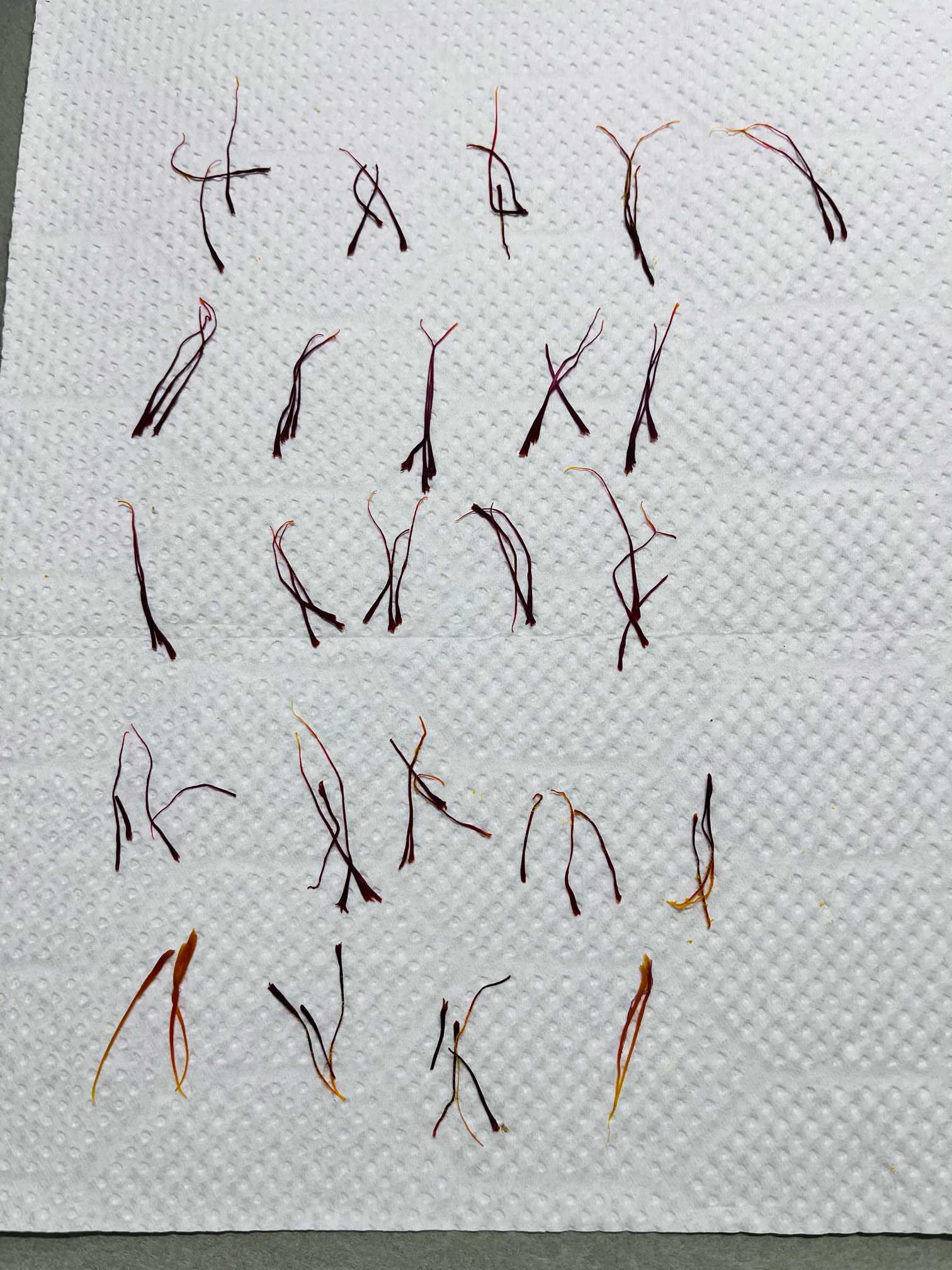 開花したサフランの花から、3分裂した雌しべを抜きとり、乾燥させたものをスパイスとして利用します。外観は濃い赤色~赤褐色の糸状で、強い特有の芳香があります。水に浸すと黄色成分クロシンがにじみ出て、水を鮮明な黄色に染めます。