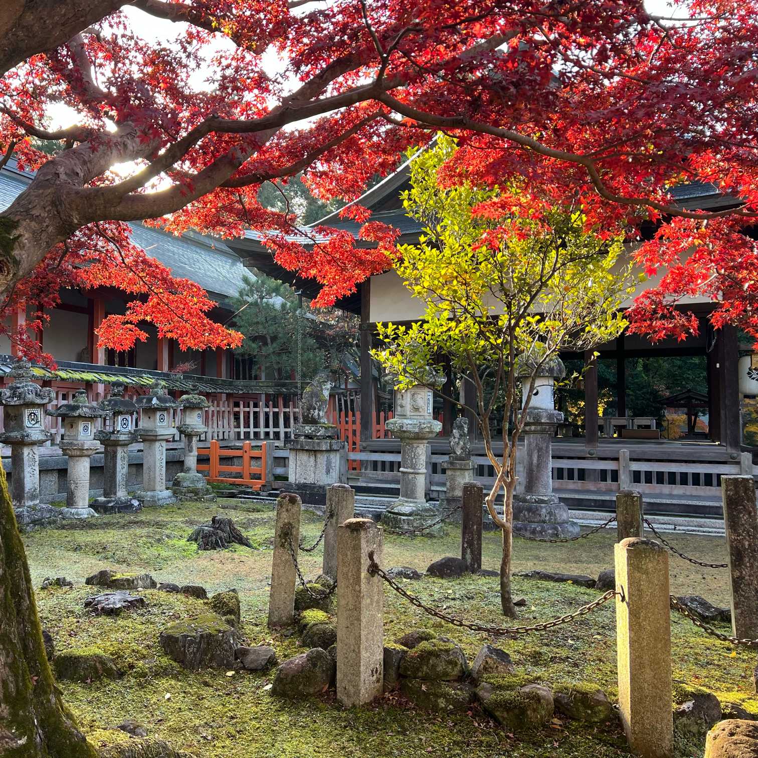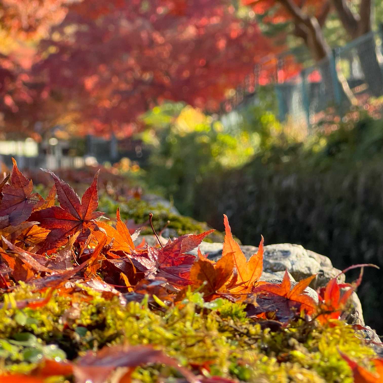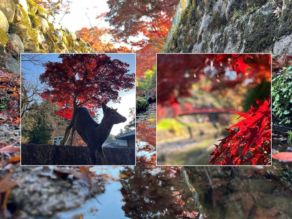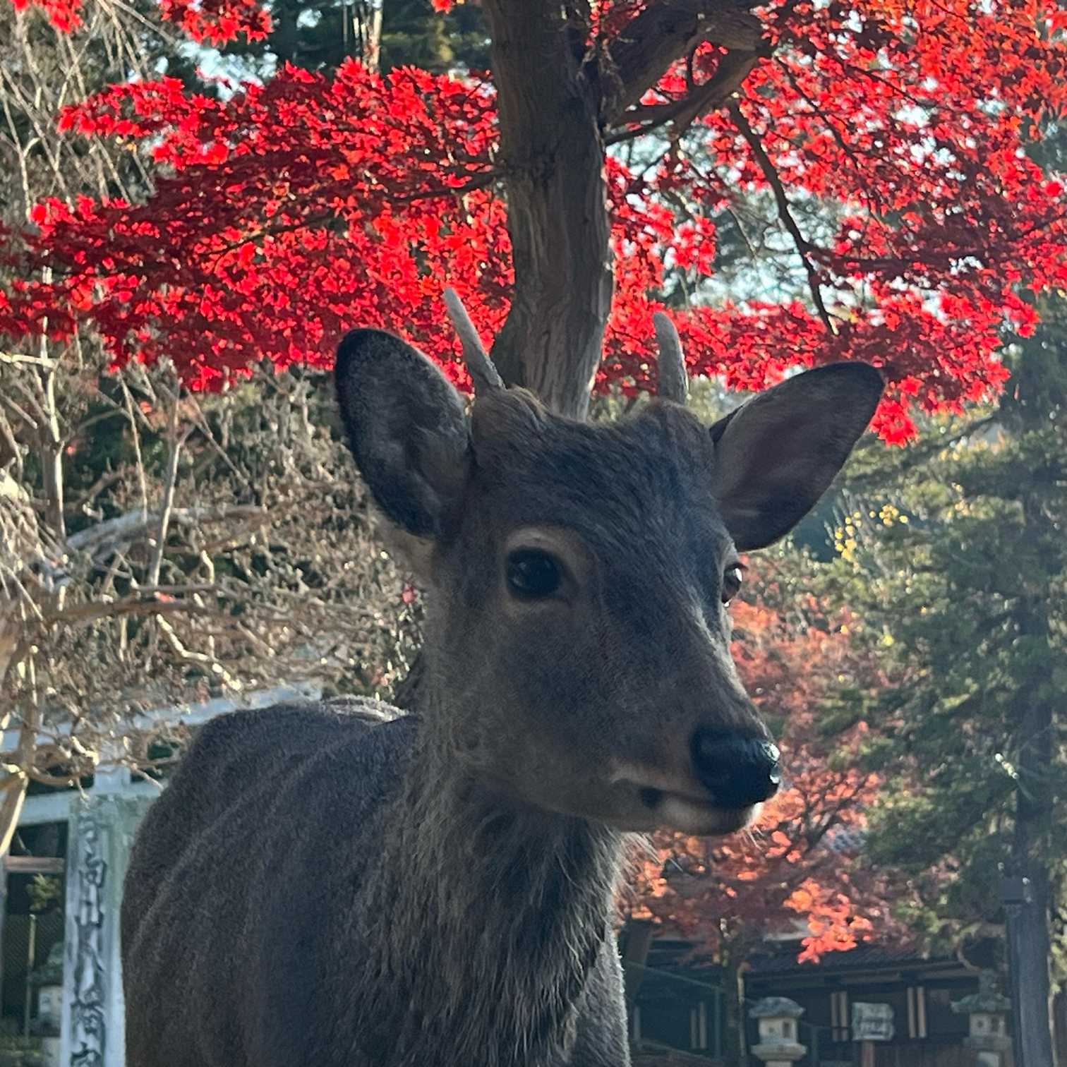 久しぶりの投稿、真っ赤な紅葉🍁と鹿🦌、苔の上の散り紅葉🍁、良い雰囲気ですね✨️