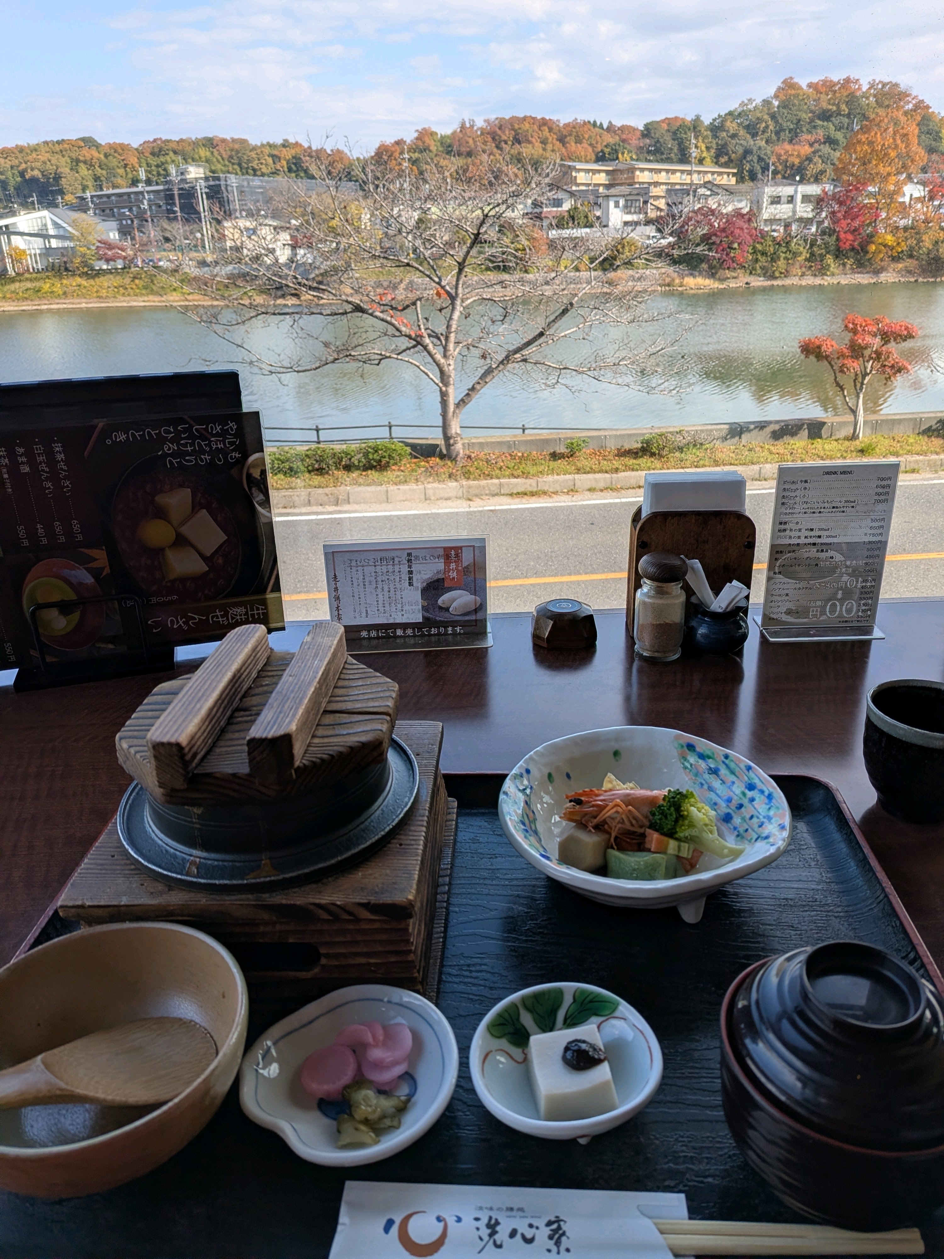 瀬田川沿いを見渡せるランチ。シジミの炊き込みご飯🍚やみそ汁、湯葉、お麩、お豆腐。美味しかった!