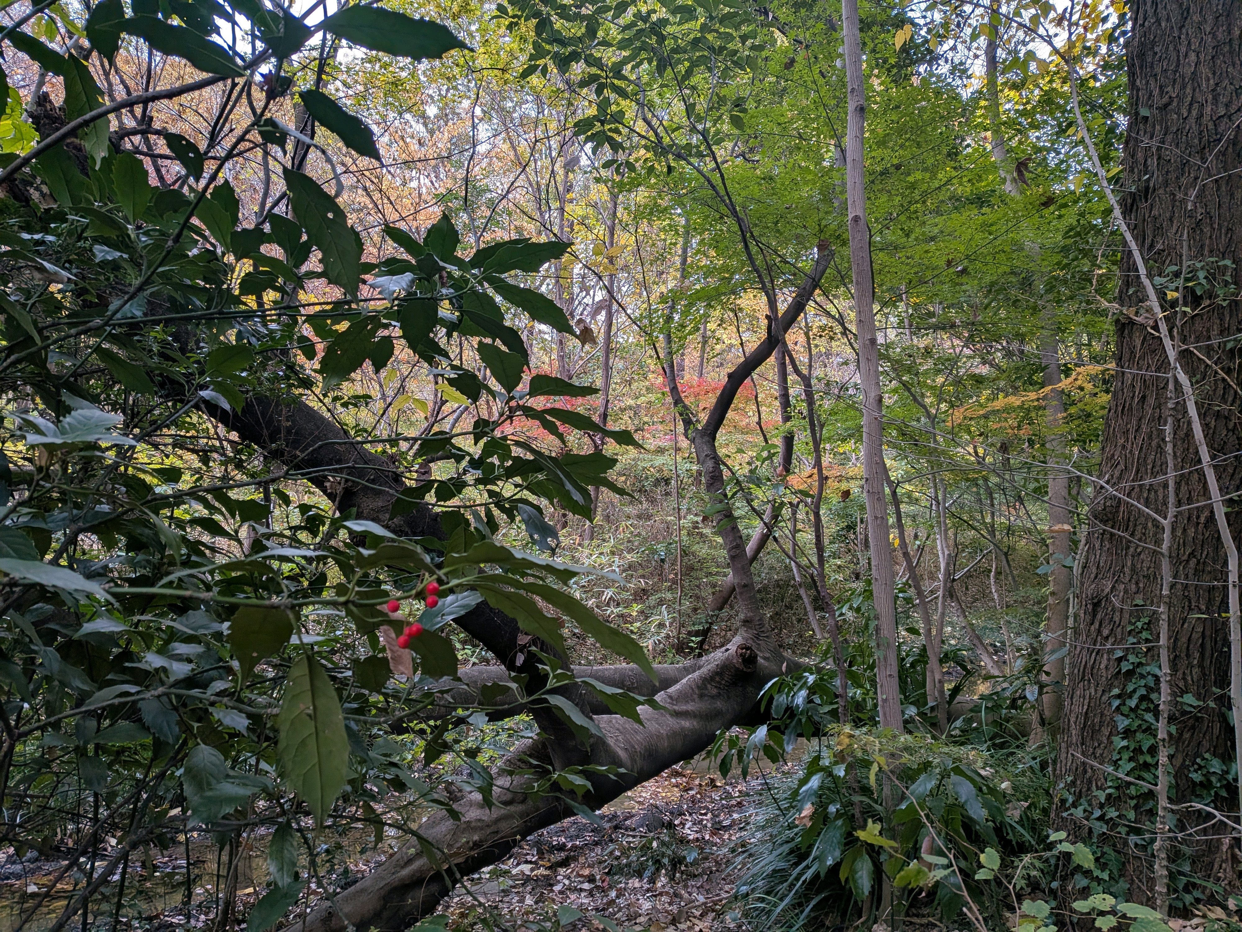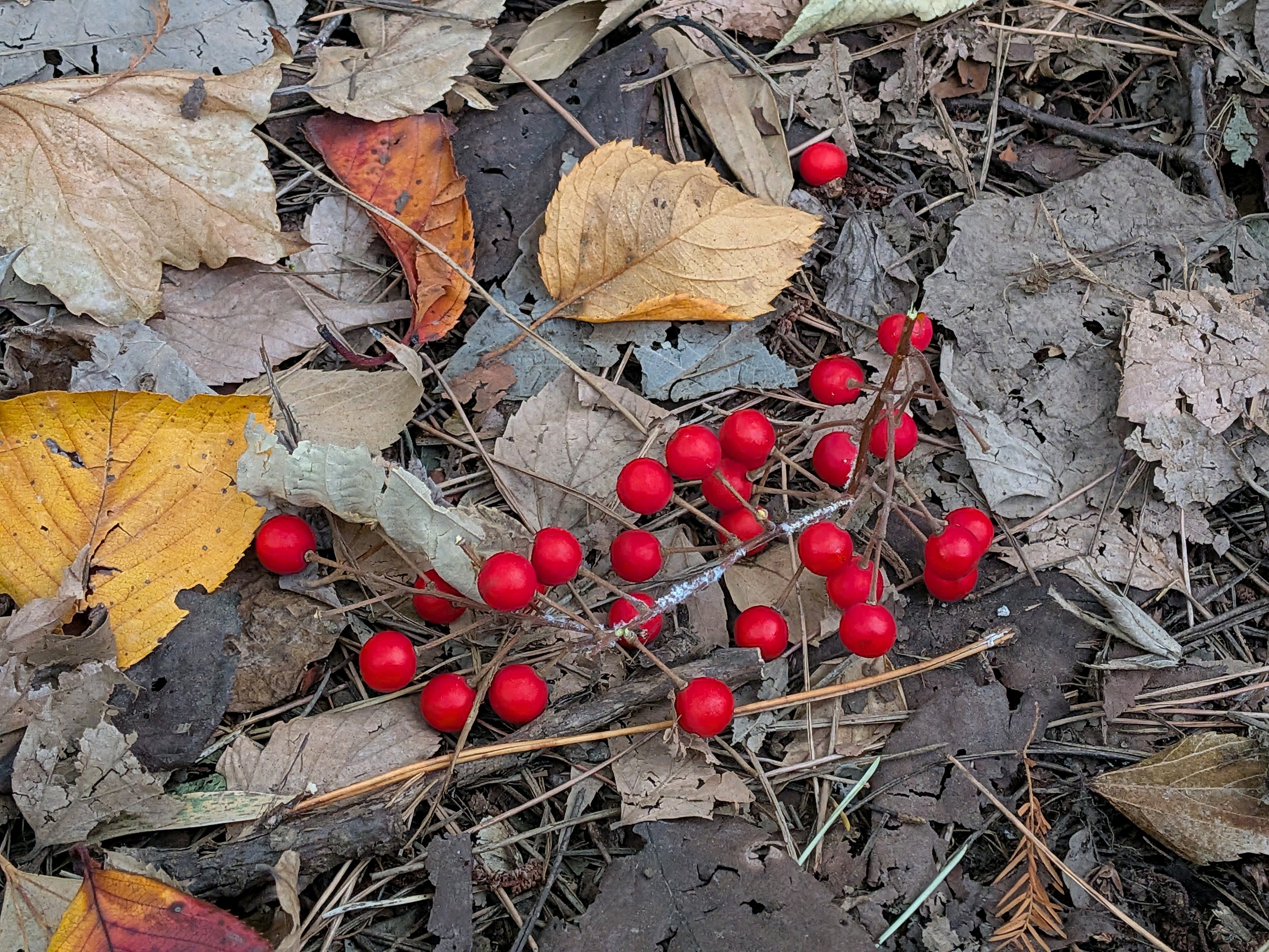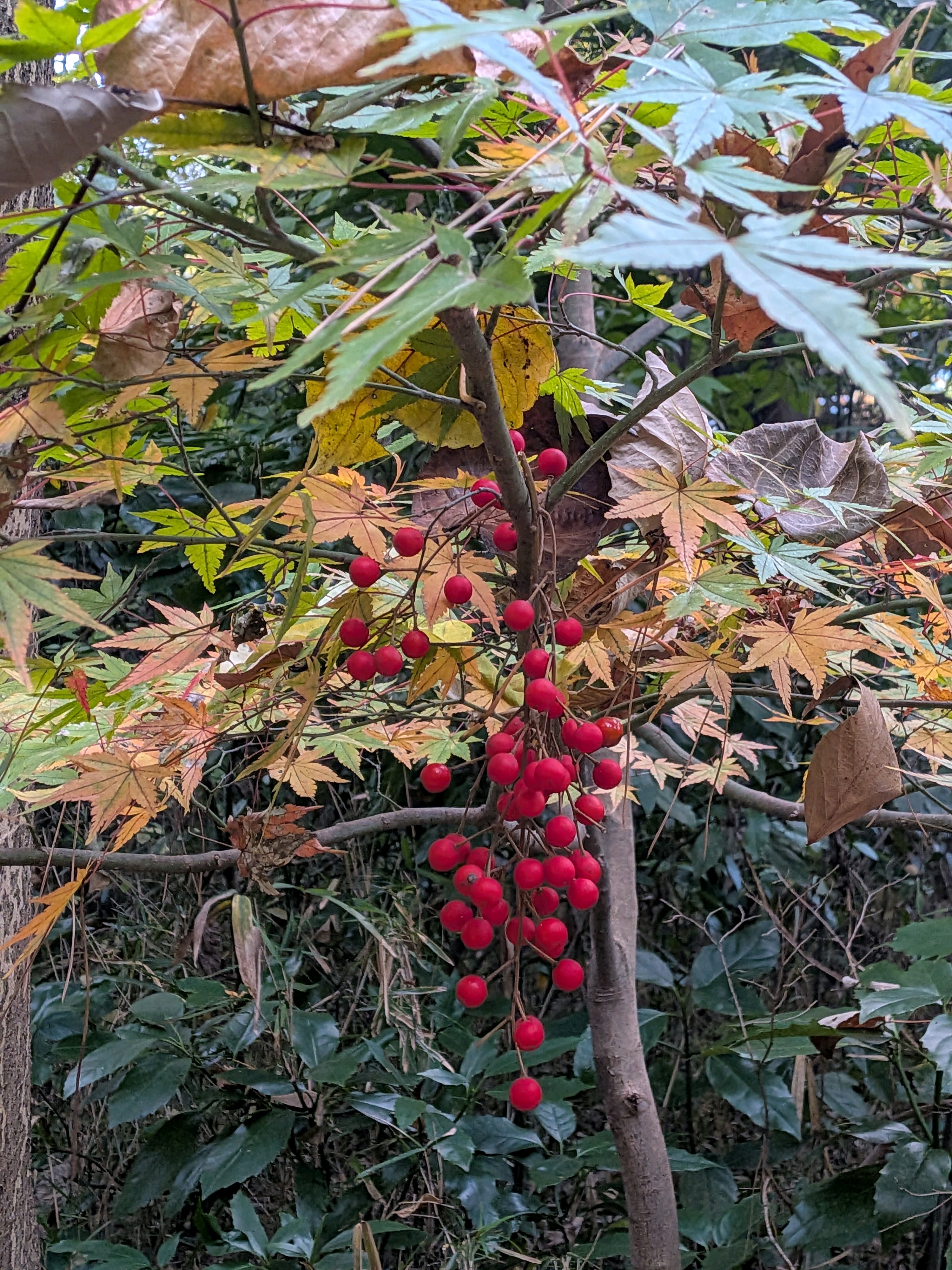 イイギリの実が、木の真下のカエデの枝に引っかかっていた。