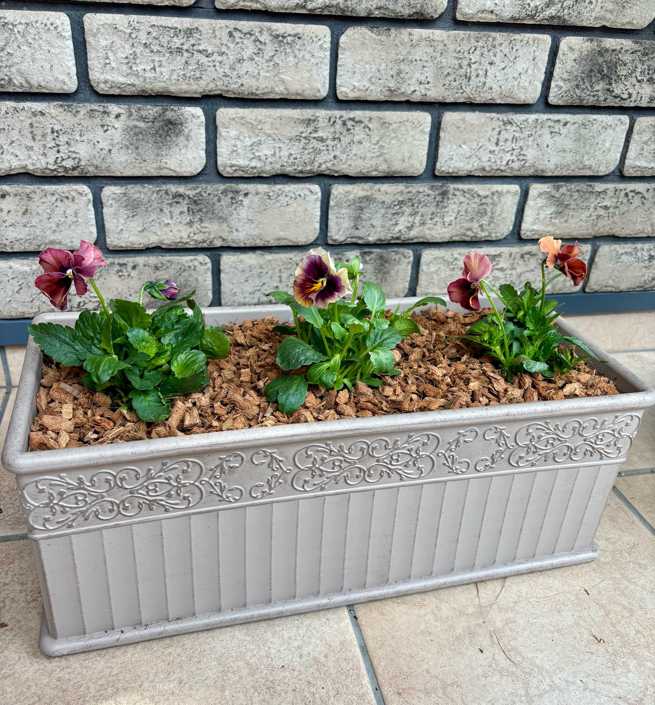 アンティークカラーのフロステッドチョコレートを。アリッサムもホワイトカラー(所々パープル)とシルバーレースで、色を抑えた寄せ植えにしました。
