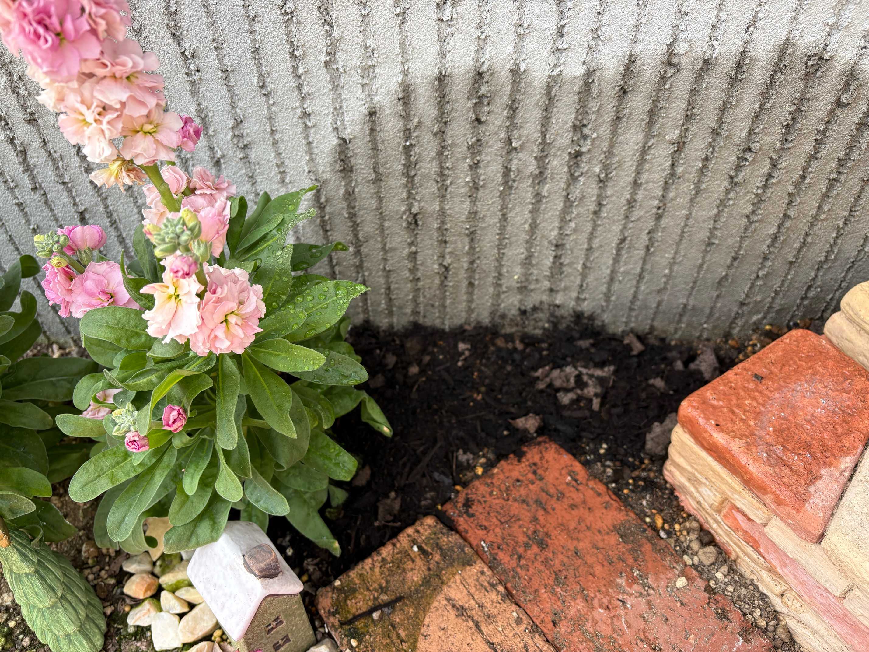 単独の鉢植えにしようかとも思いましたが、花壇の縁から枝垂れる感じも素敵だなと思い、こちらに植えることに。