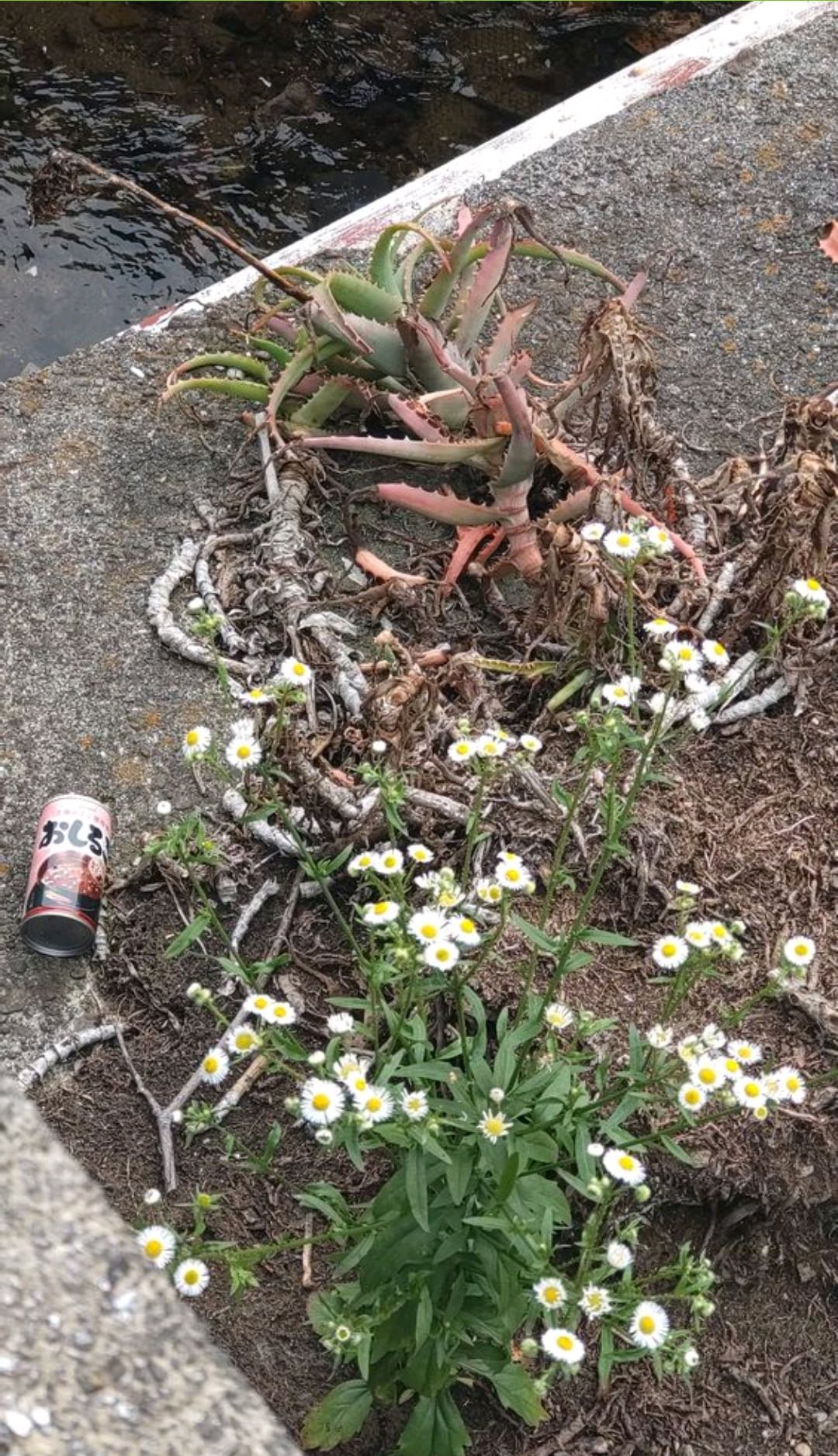 おしるこの缶はいらんけど、ハルジオン(?)が勝手に住み着いてました。