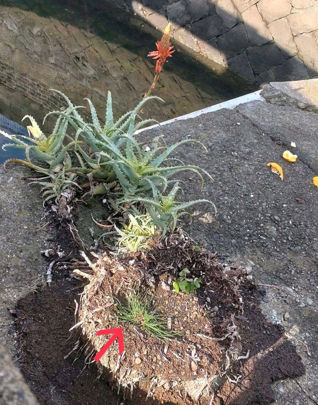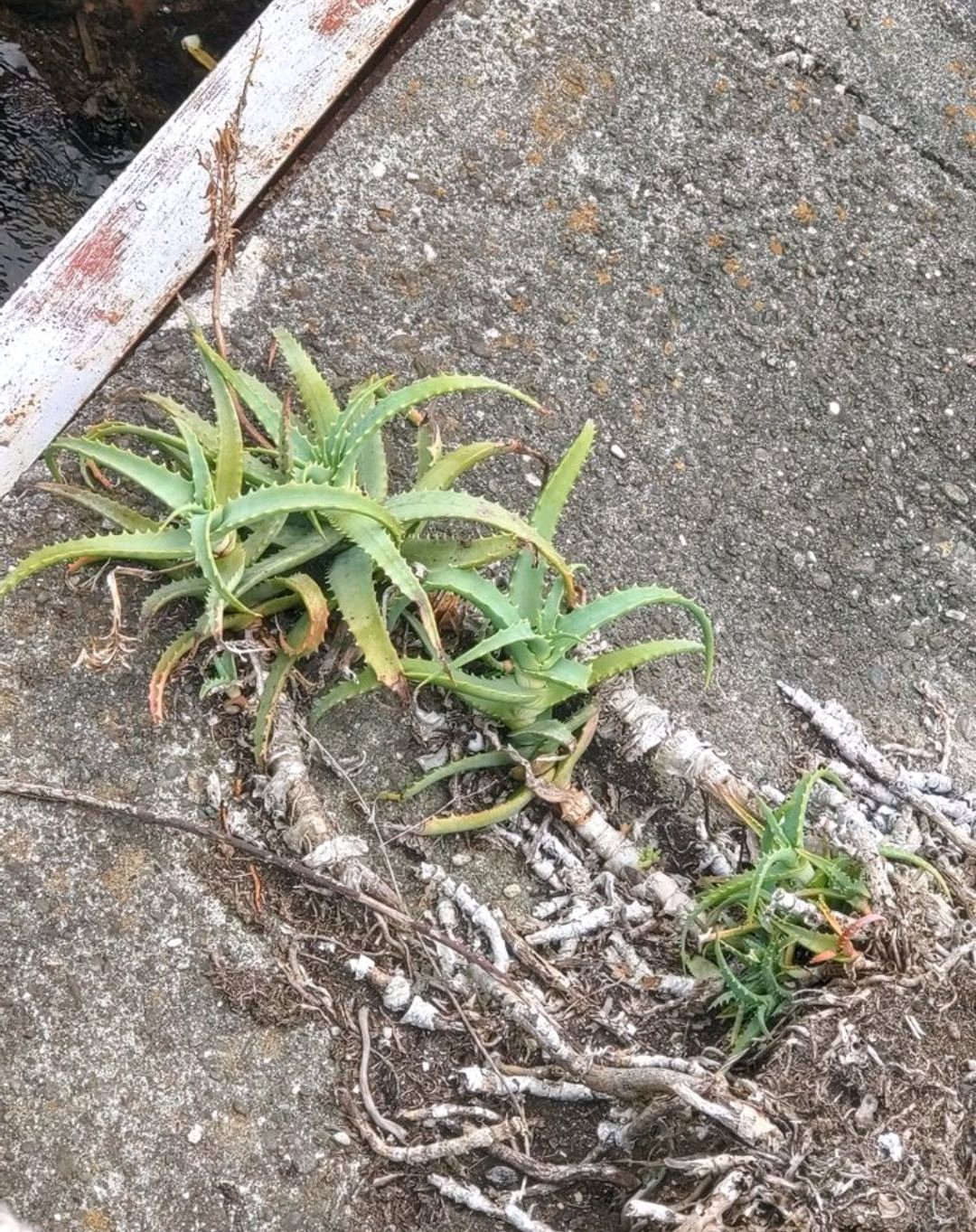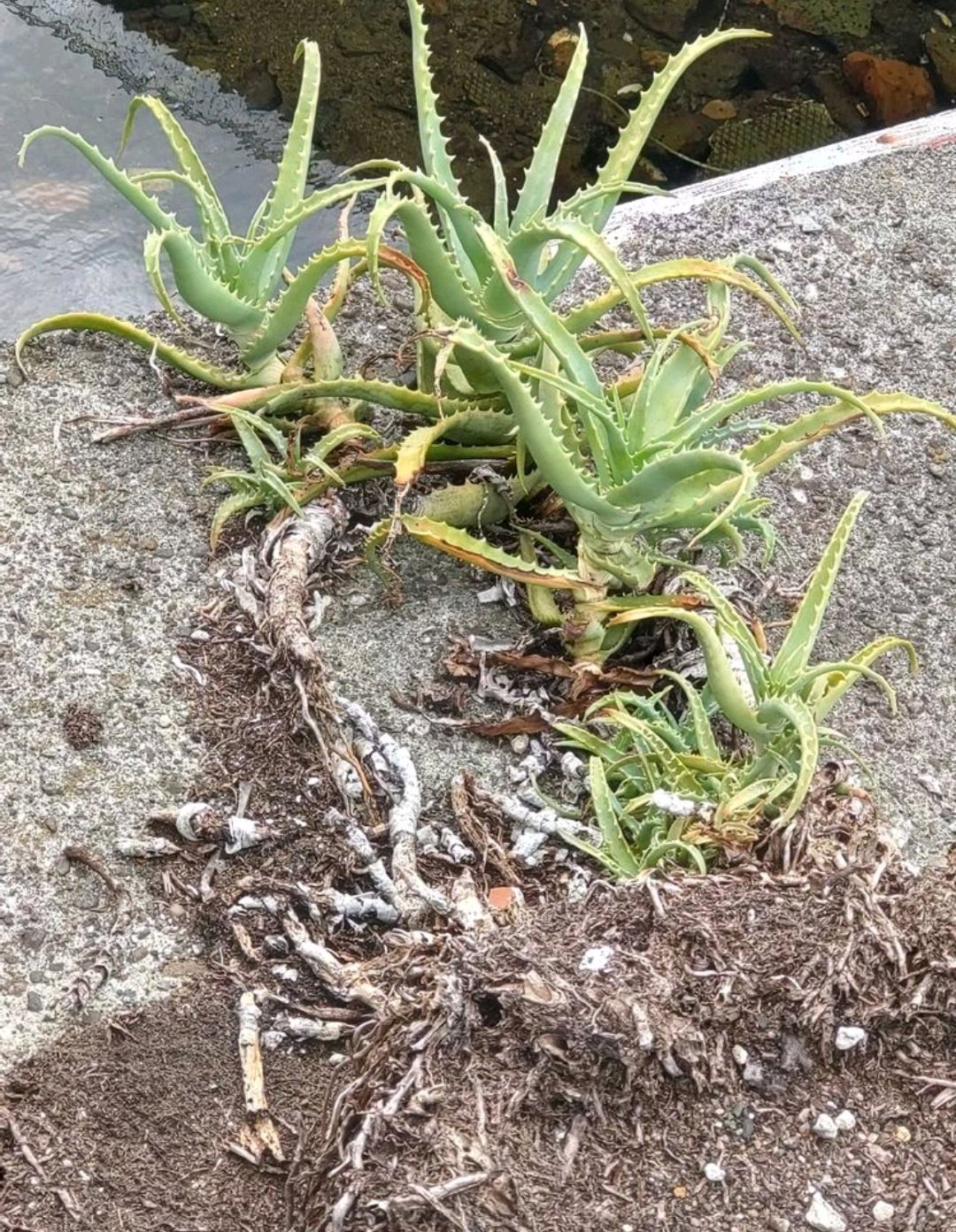 強風後のこと。鉢から抜け出て飛んだのか、鉢から引っこ抜かれて投げ落とされたのか、分からないアロエを路上で発見しました。アロエの生命力を記録します。
