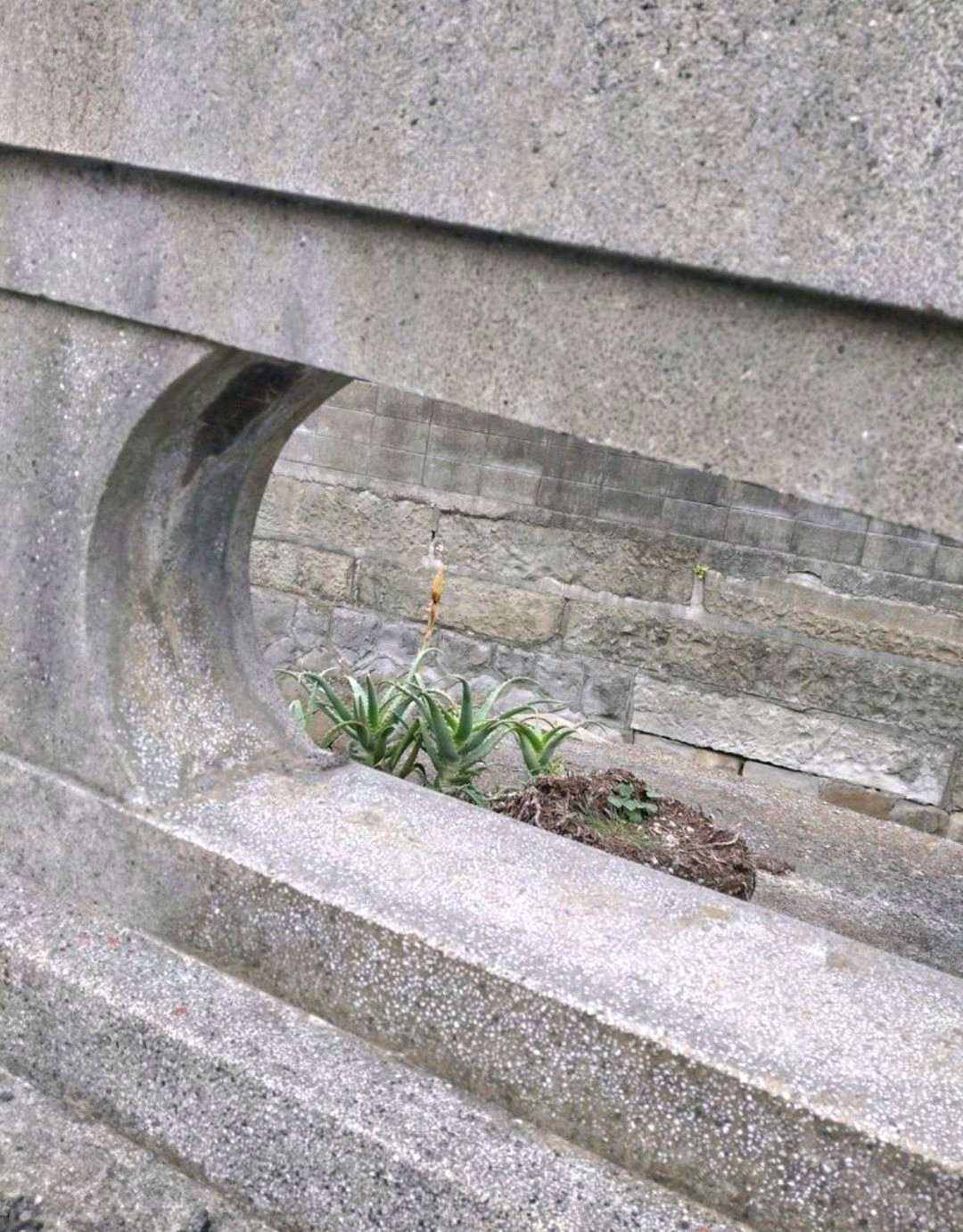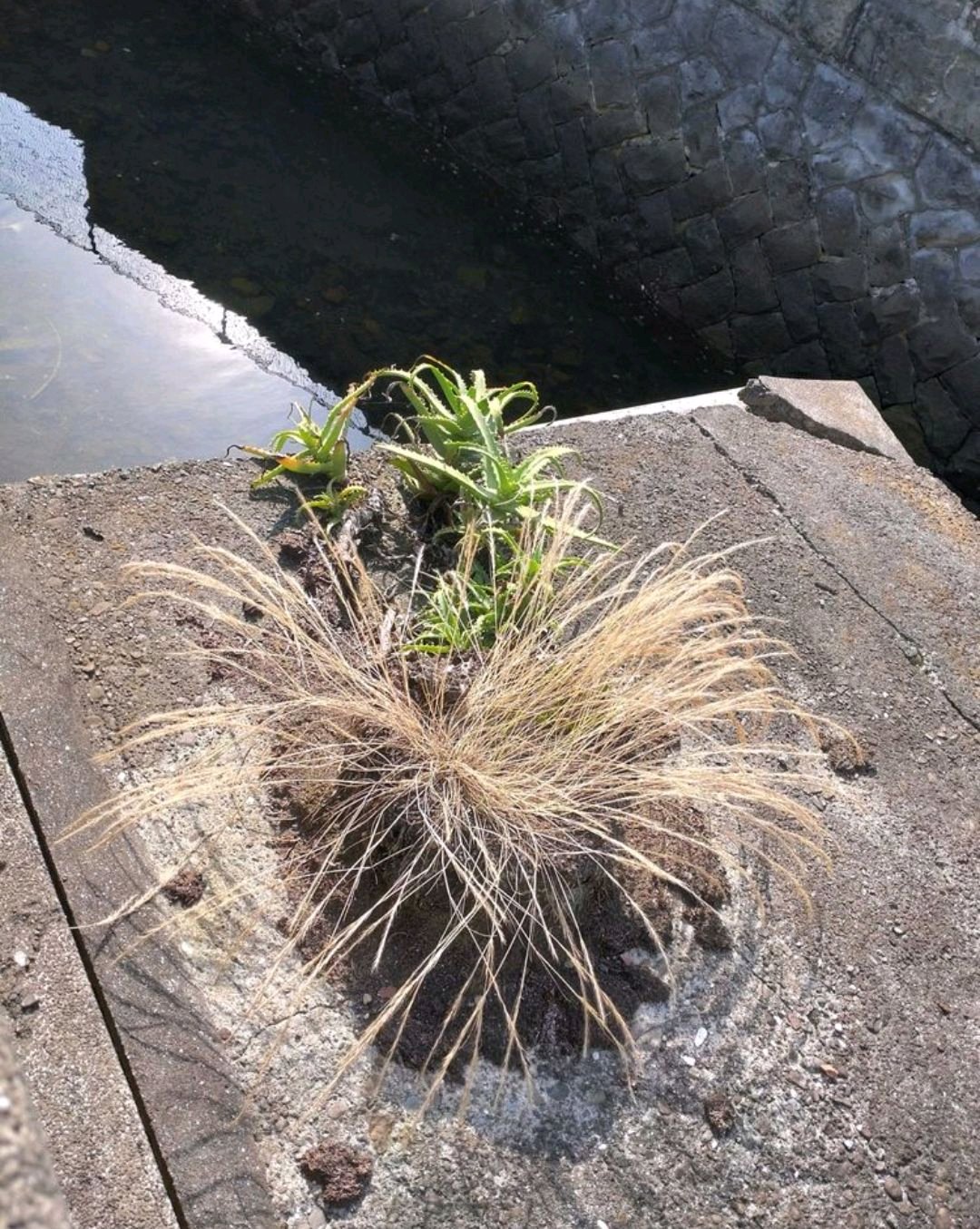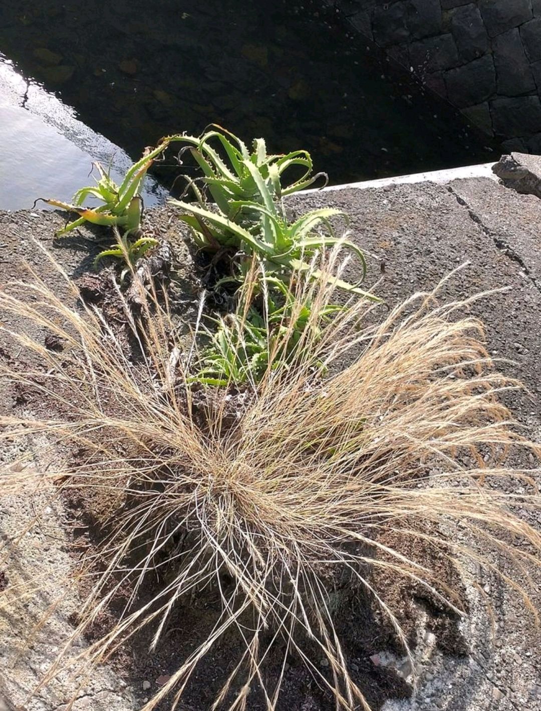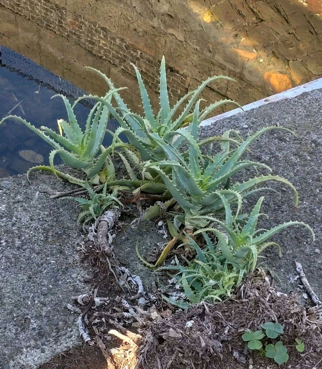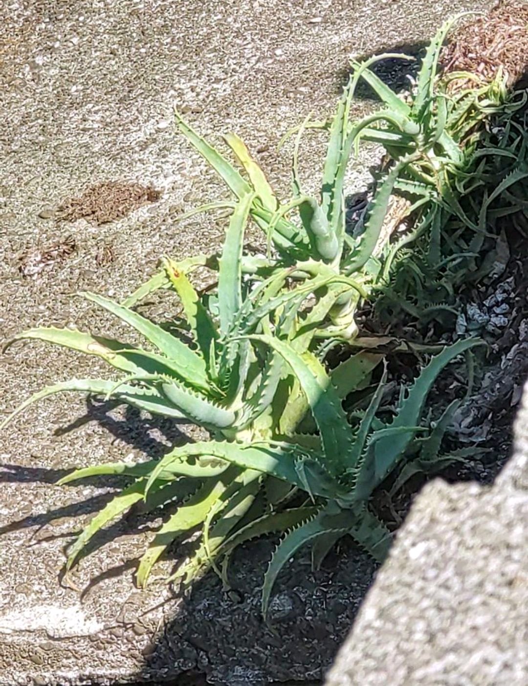 アロエは歩道の向こう側に住んでいます。人間より、鳥とか猫の方がこのアロエに気付いているかもしれません。