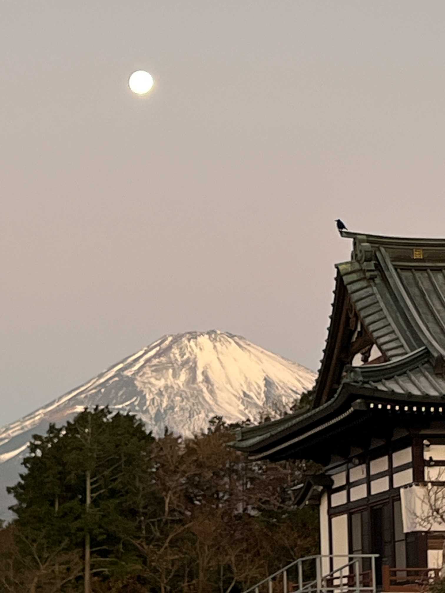 お寺の屋根に一話のカラスが富士山眺めてる⁉️