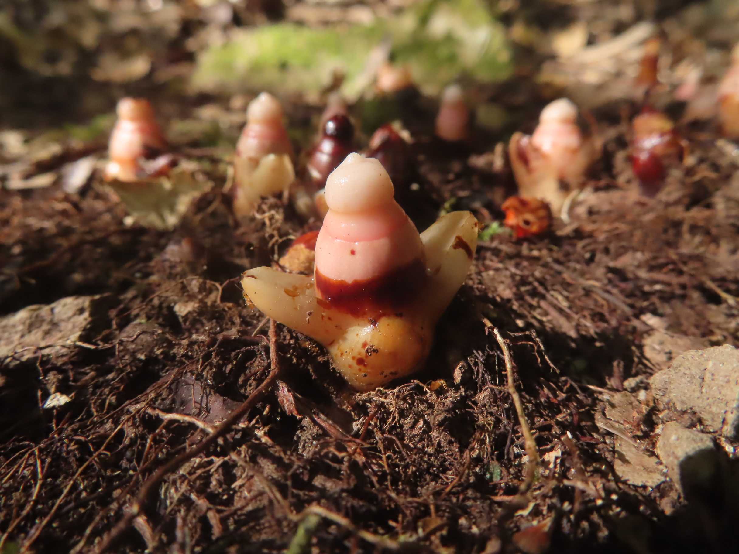 ヤッコソウは、日本固有の珍しい寄生植物で、四国・九州南部から沖縄にかけての暖帯林に分布し、特に徳島県が北限とされています。スダジイやツブラジイ(シイ属)の根に寄生し、晩秋に「奴(やっこ)」のような姿の花を咲かせ、各地で国の天然記念物に指定されている群生地もあります。