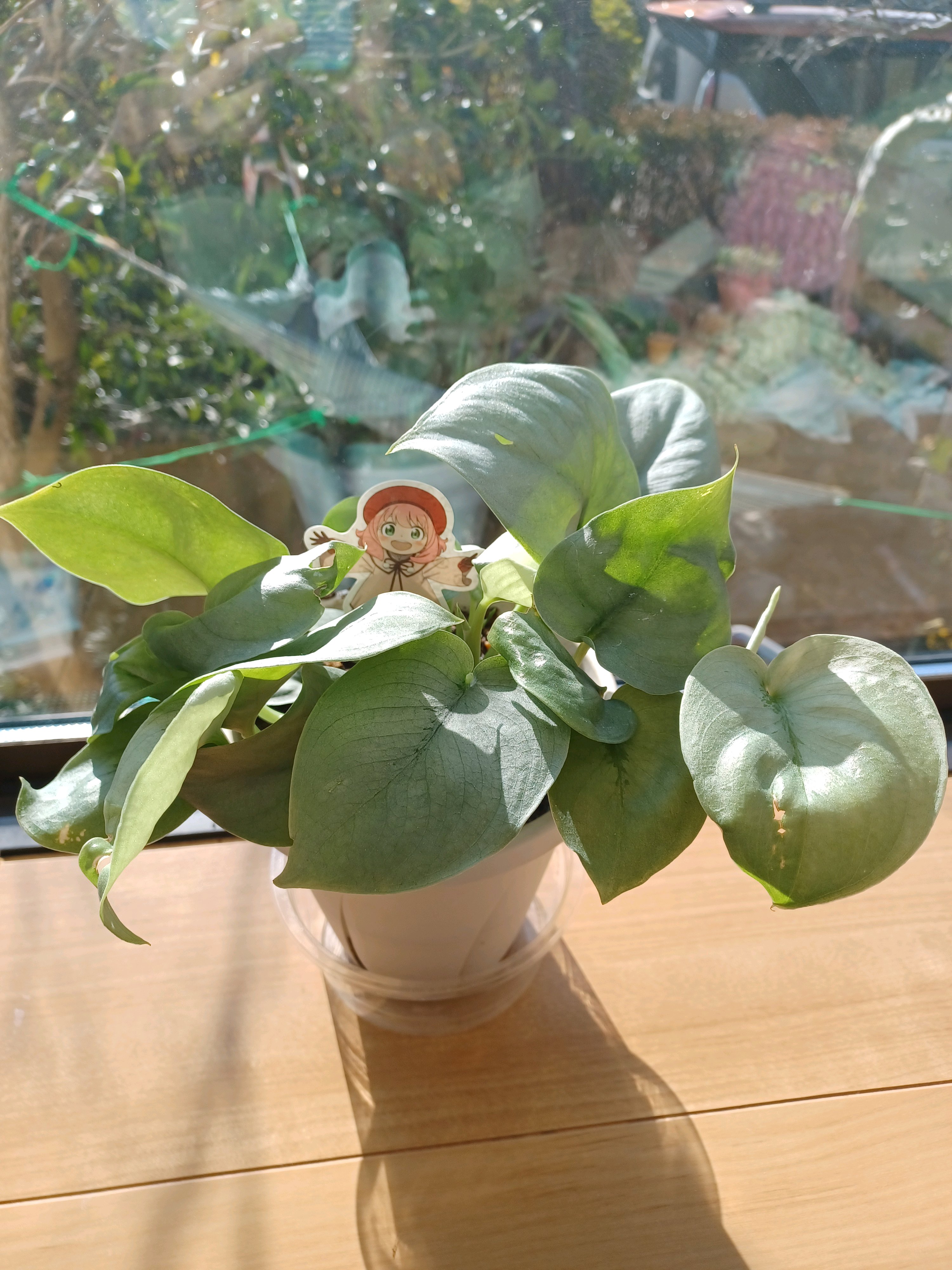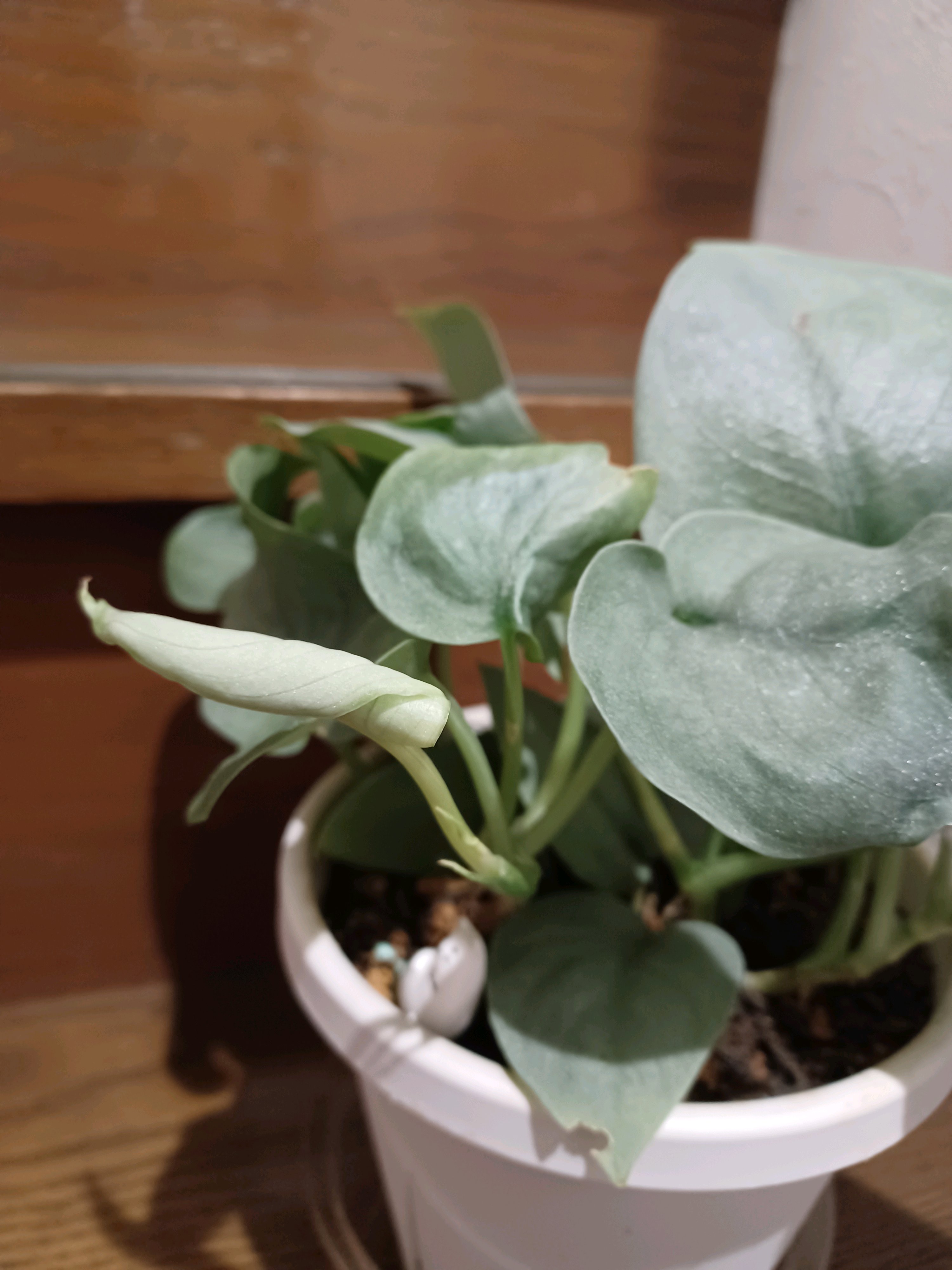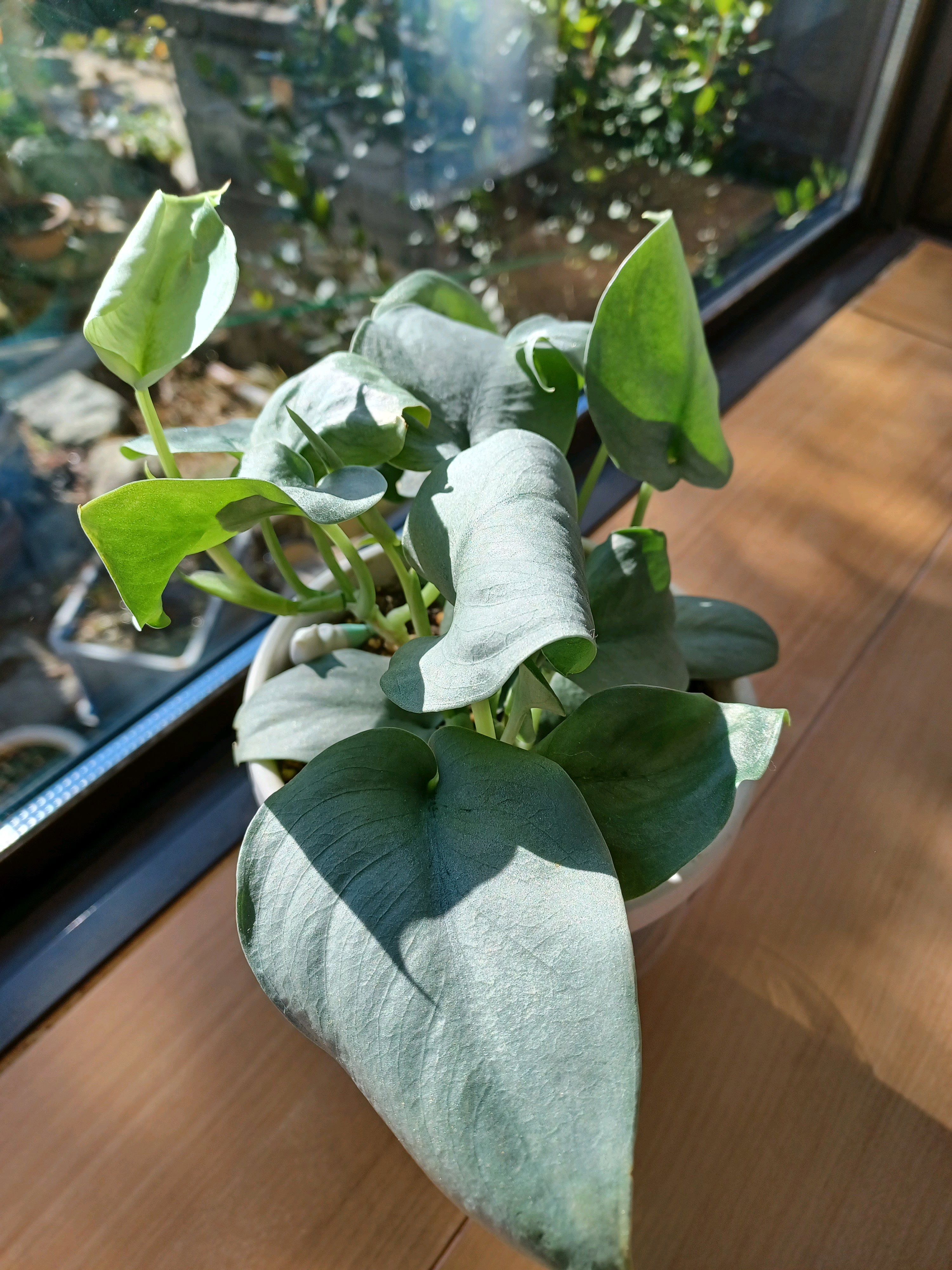 新芽の色が薄かったので、窓辺に置いてみました。葉っぱの表面がキラキラ✨太陽光の方がより実力が発揮されるのかも。写真ではいまいち伝わらないかも~💦