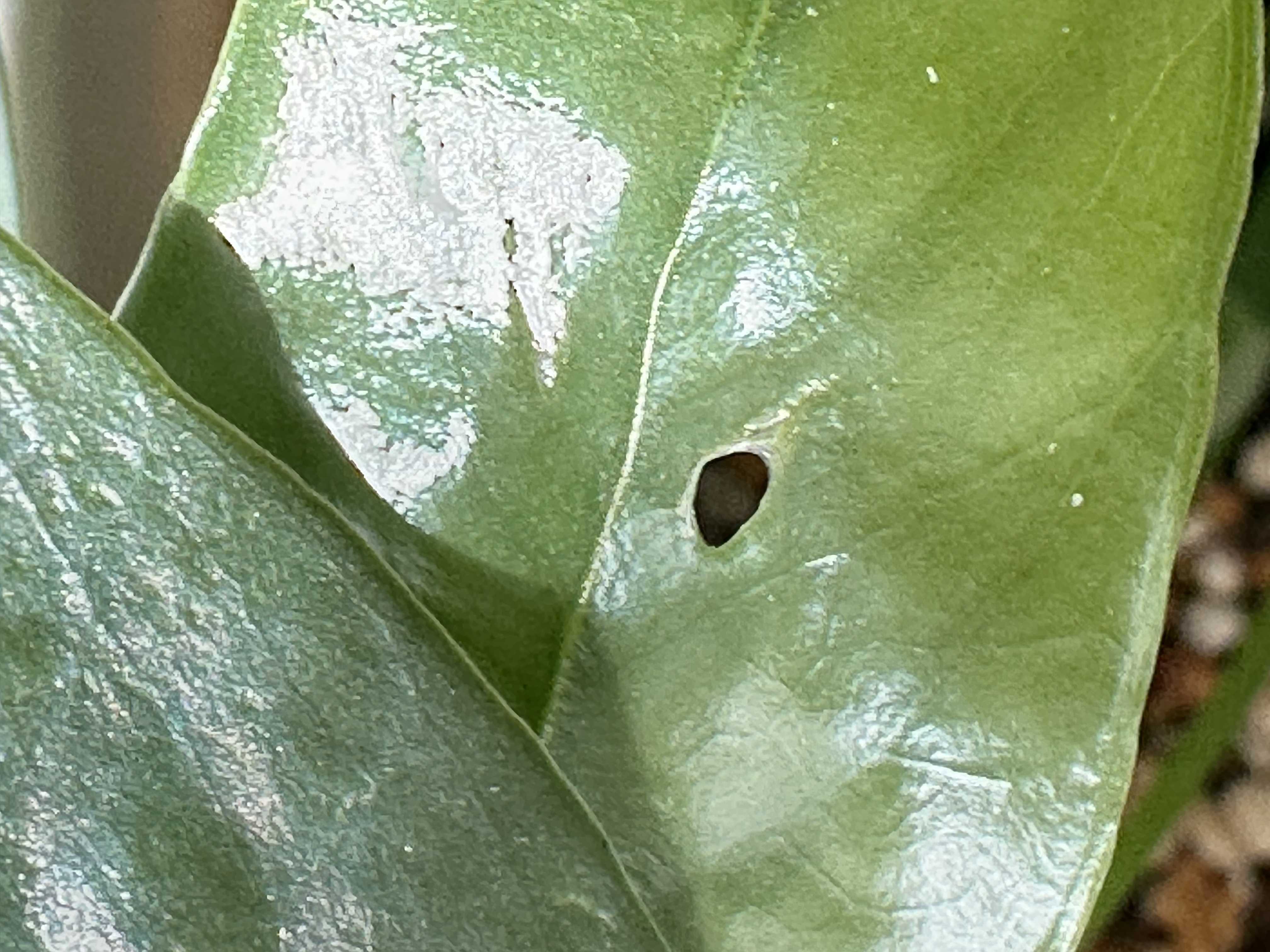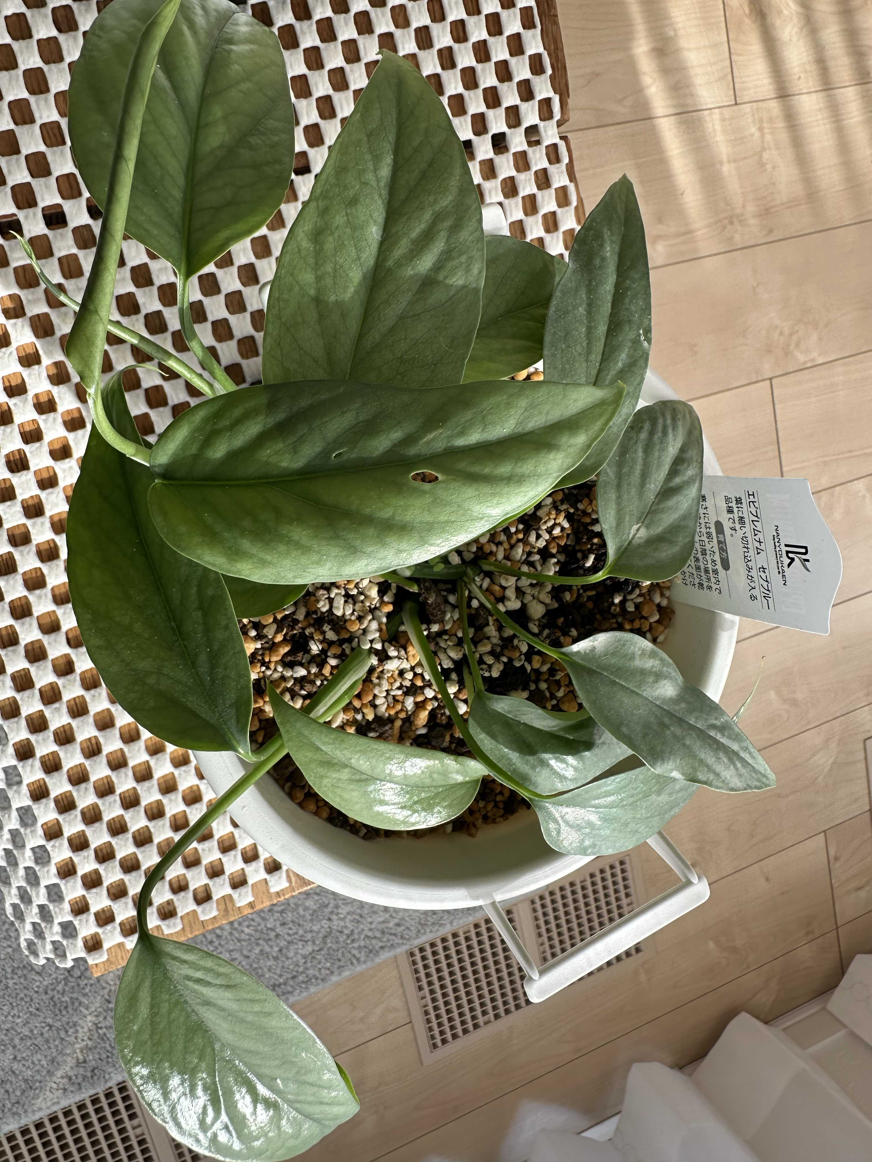 エピプレムナム•セブブルーの葉をよーく見ると、青みがかった緑色の真ん中に、ポツンと穴が空いている。
