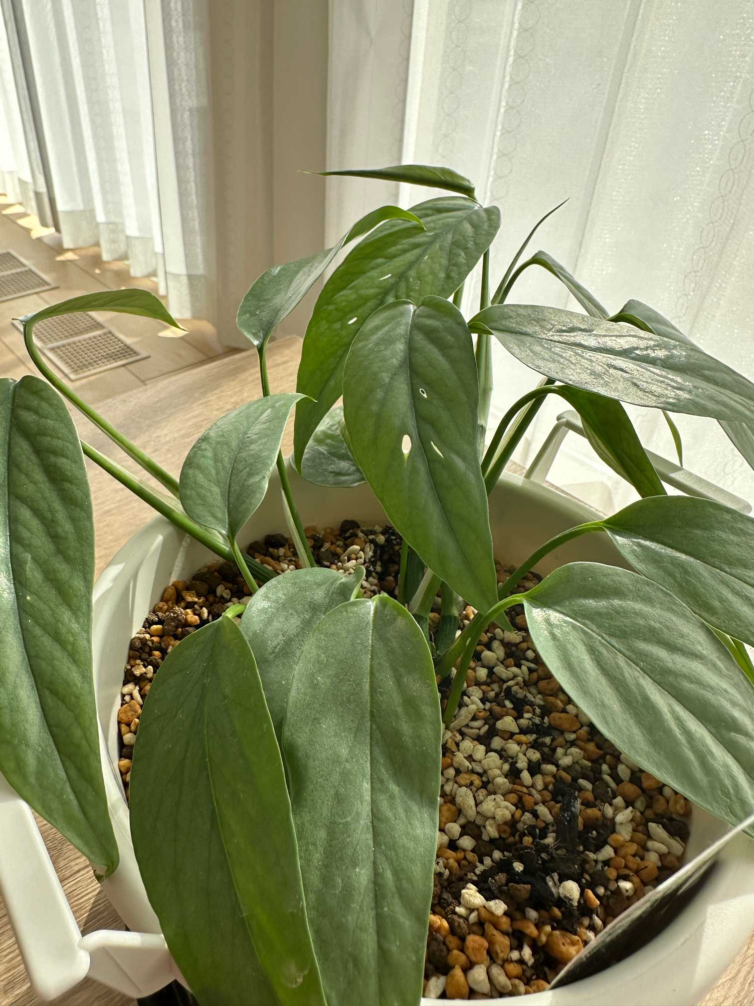 エピプレムナム•セブブルーがレース越しに自然光を浴びている。その奥には、モンステラ•アダンソニー がある。そんなリビングで、私は寛ぐ。