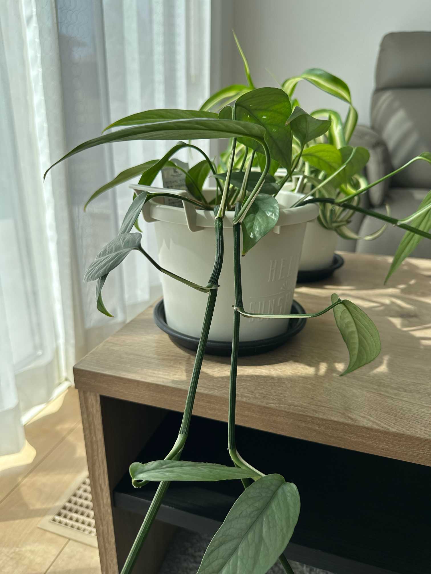 エピプレムナム•セブブルー(奥)&オリヅルラン•ボニー(手前)の葉っぱに、レース越しの太陽光が当たる。