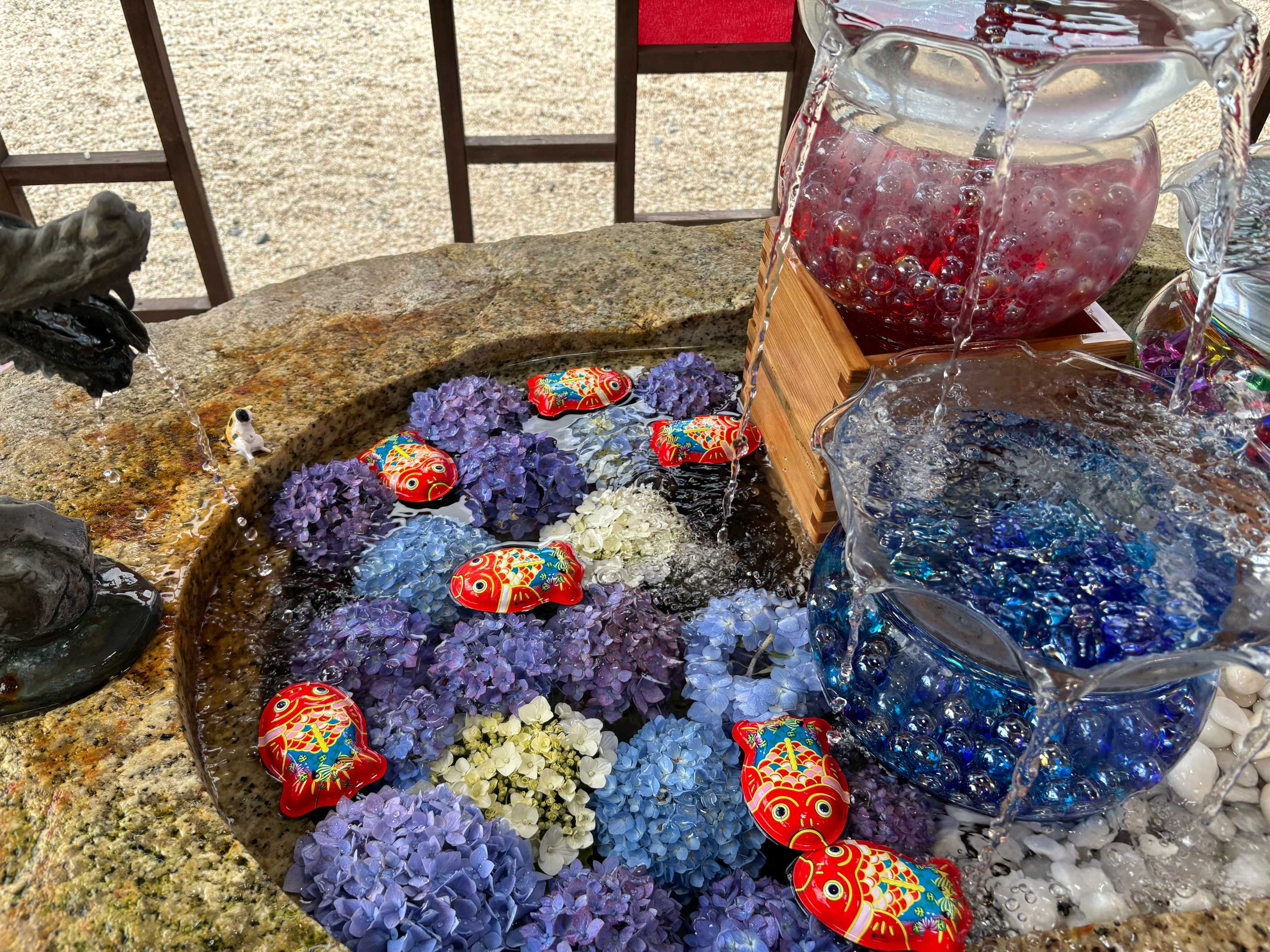 この日の花手水はカラフルなビー玉と紫陽花