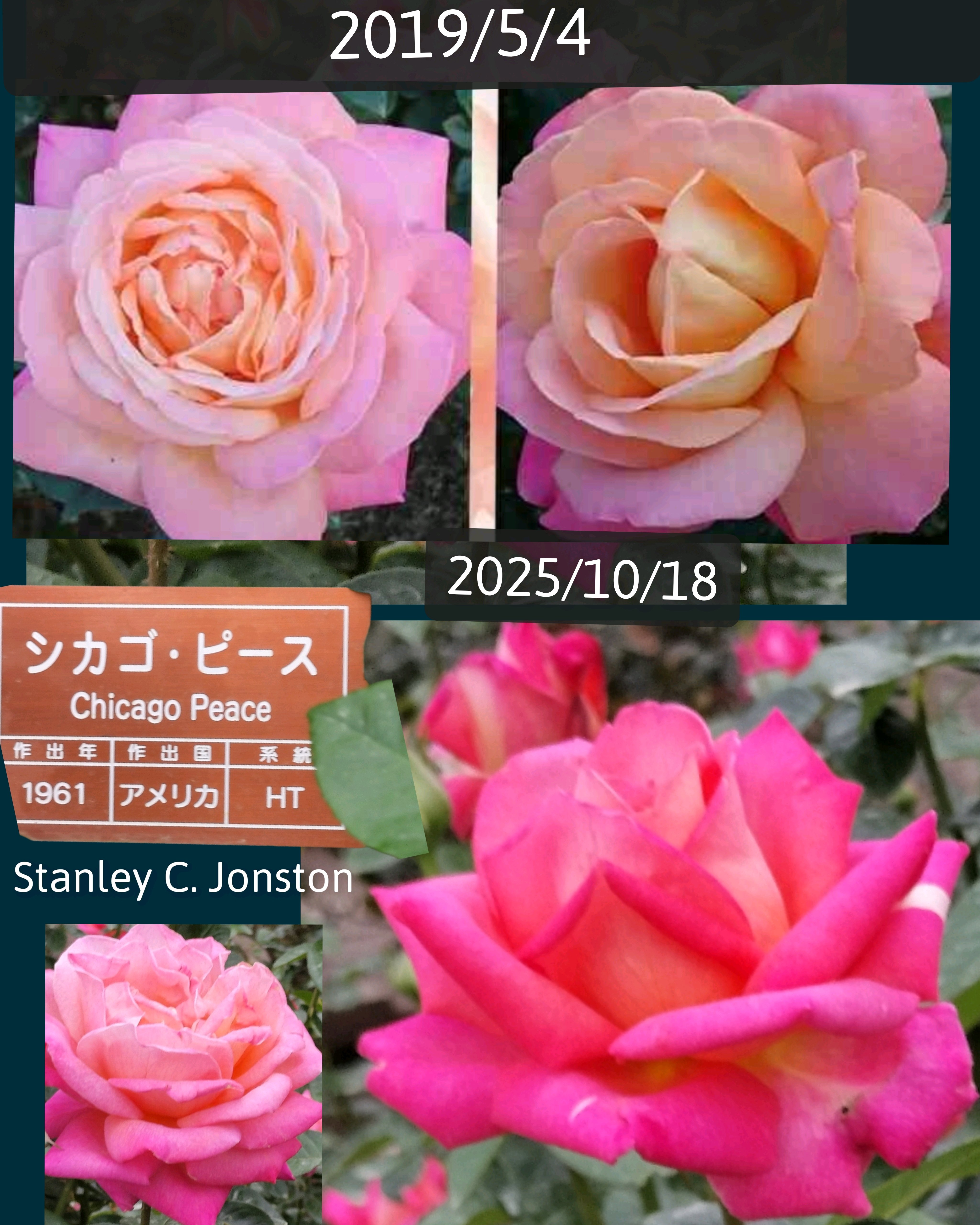 2019/5/4…春には淡いピンクとクリーム色の薔薇という印象でしたが、2025/10/18…秋にはローズピンクと淡いオレンジ色の薔薇になって、同じ品種とは思えない感じでビックリしました!