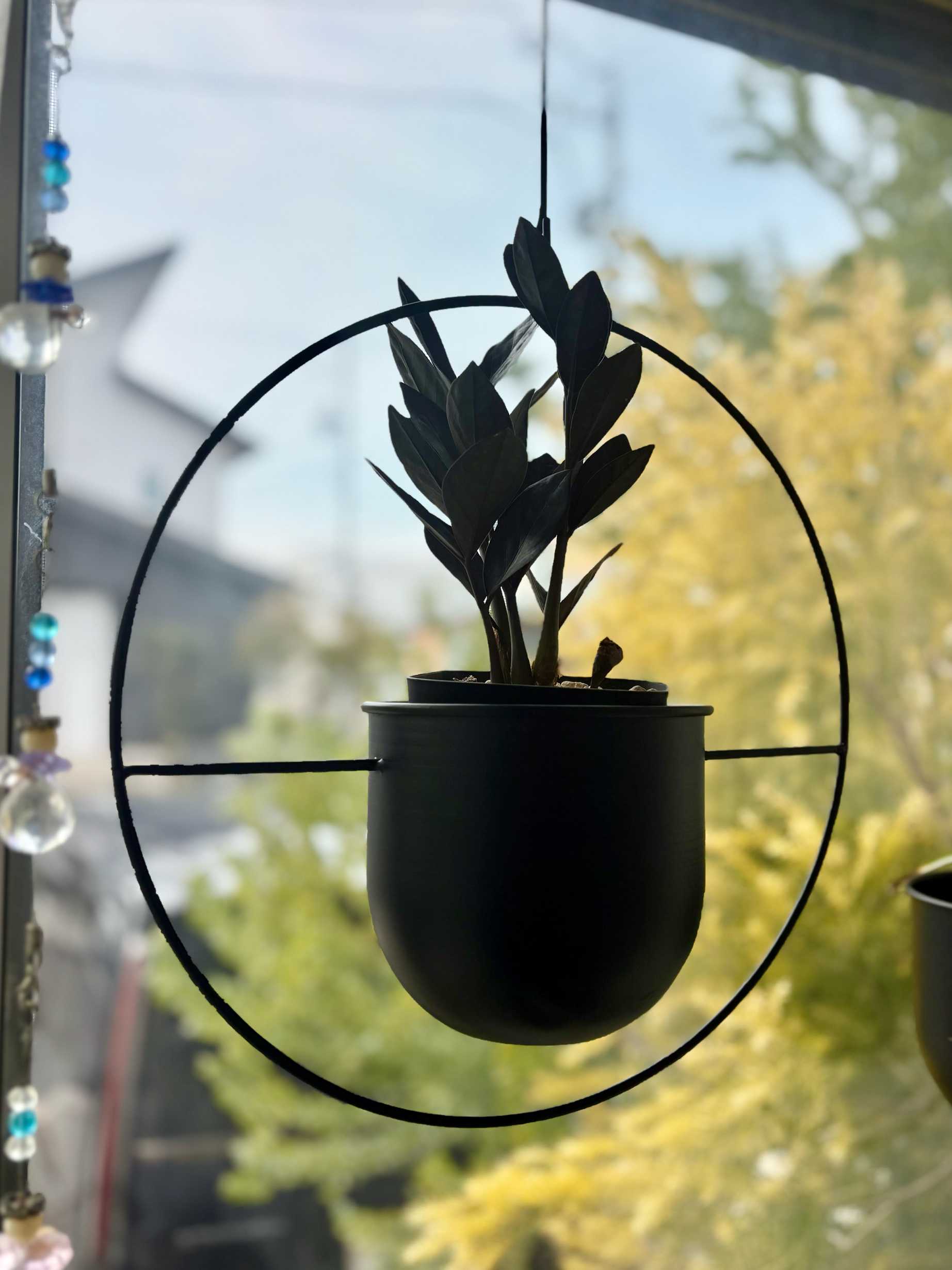 せっかく黒い葉なので、黒い鉢カバーに入れて窓辺でハンギングすることにしました