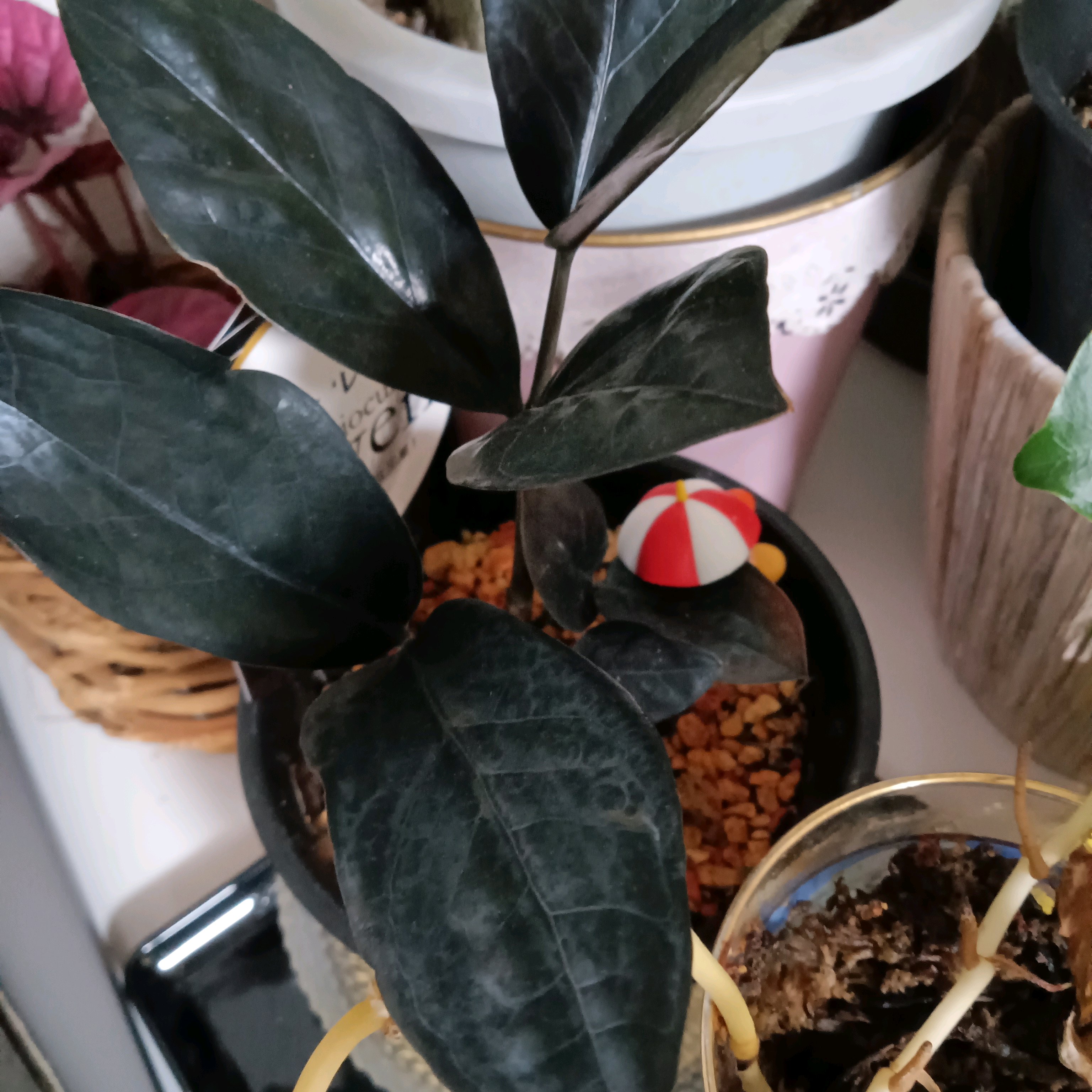 こうやって飾ると他の観葉植物と違って葉っぱの黒さがわかりやすい😵💫