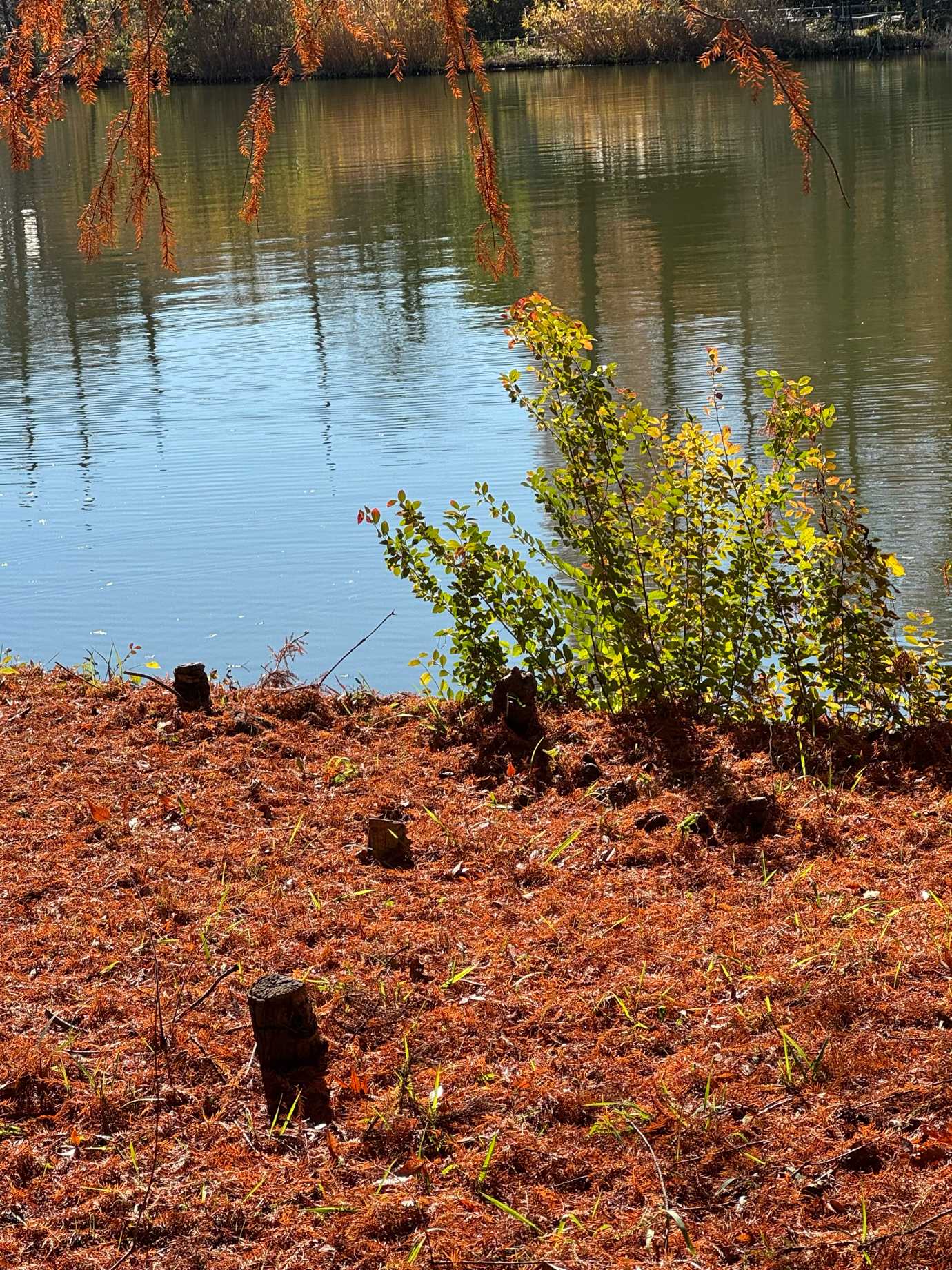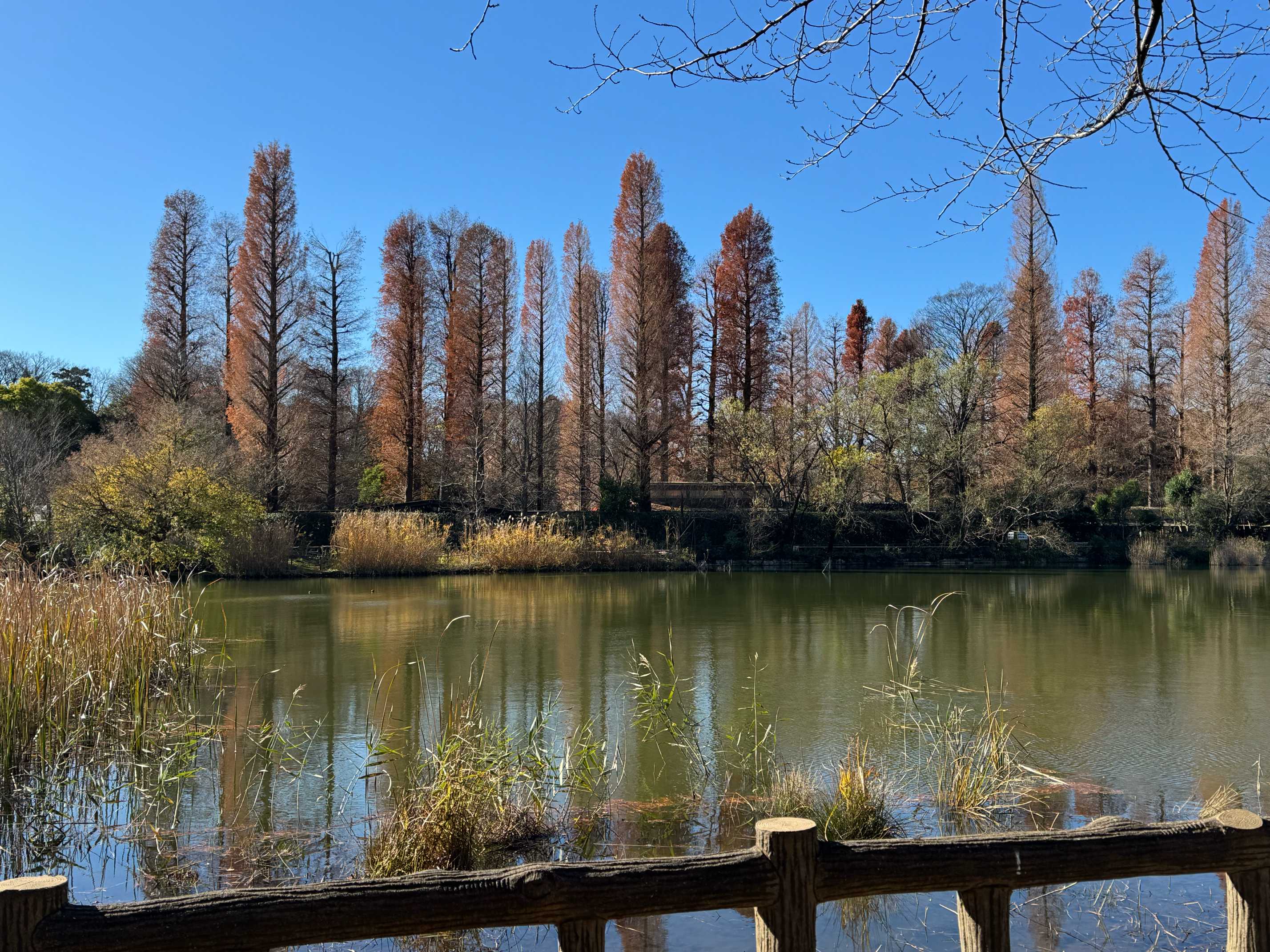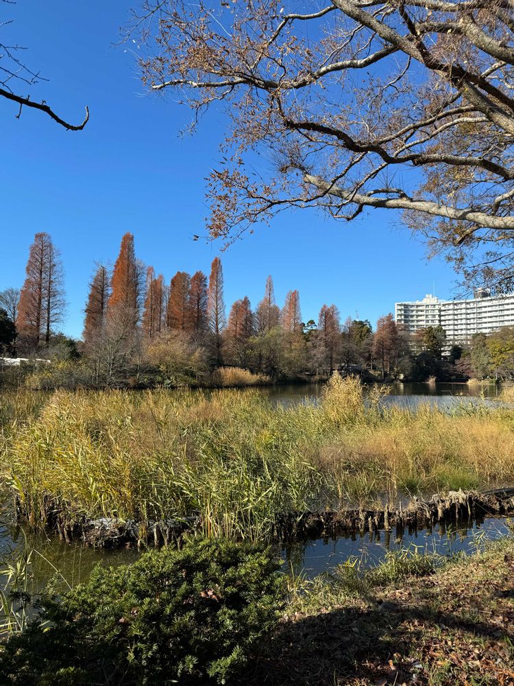 都会の中にある冬の公園。池にカモ、オオバンなどが。池の周りのところどころにあるベンチに座ってくつろぐ。