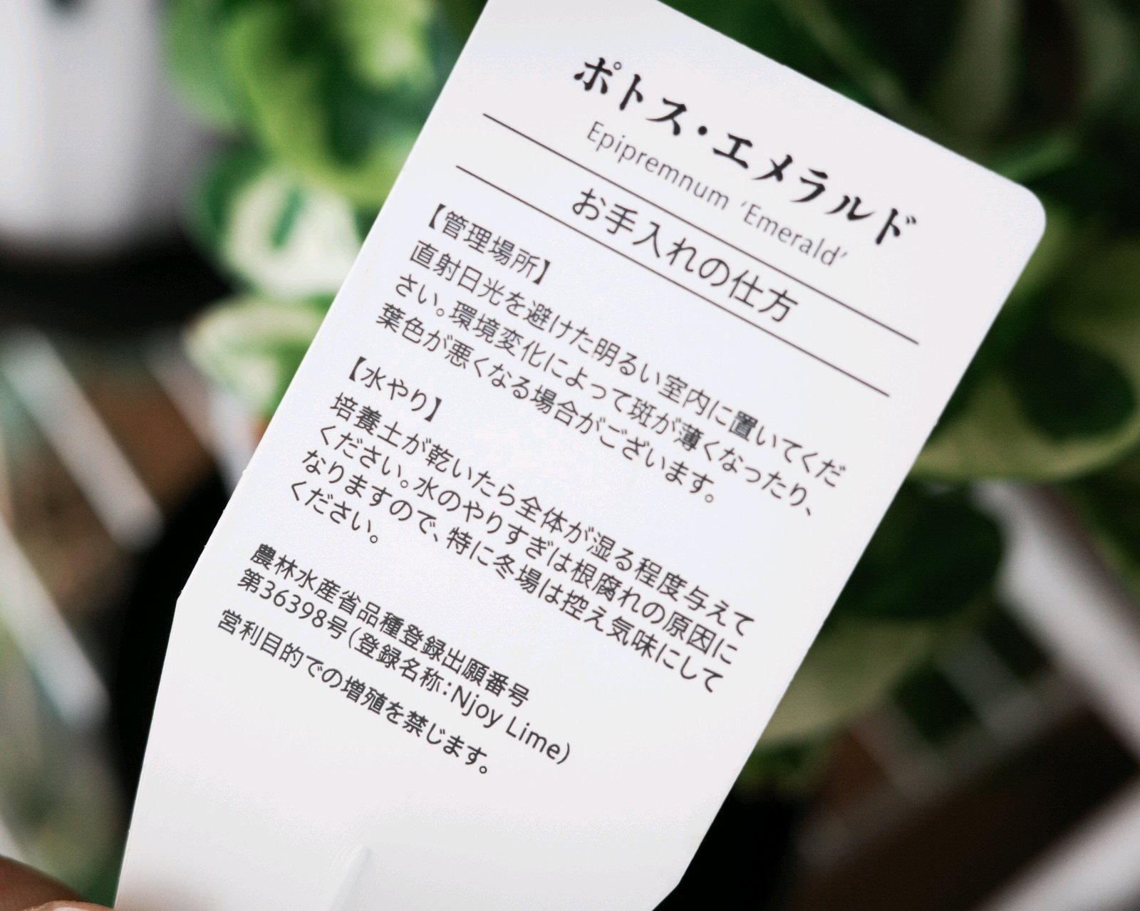 ポトス・エメラルドは、ポトス「エンジョイ」の枝変わりとして育成されたもので、正式な登録名称はN’Joy Lime(エンジョイライム)と言うそうです。