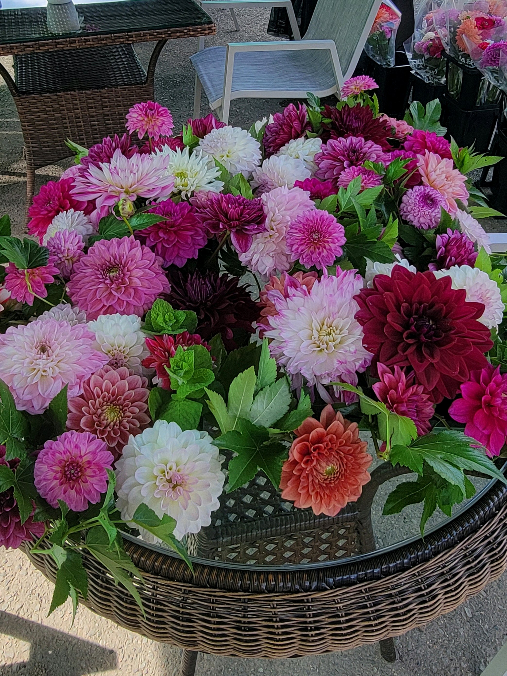 アフタヌーンティーにアレンジしたダリアのお迎えや、テーブルフラワーどれも😍