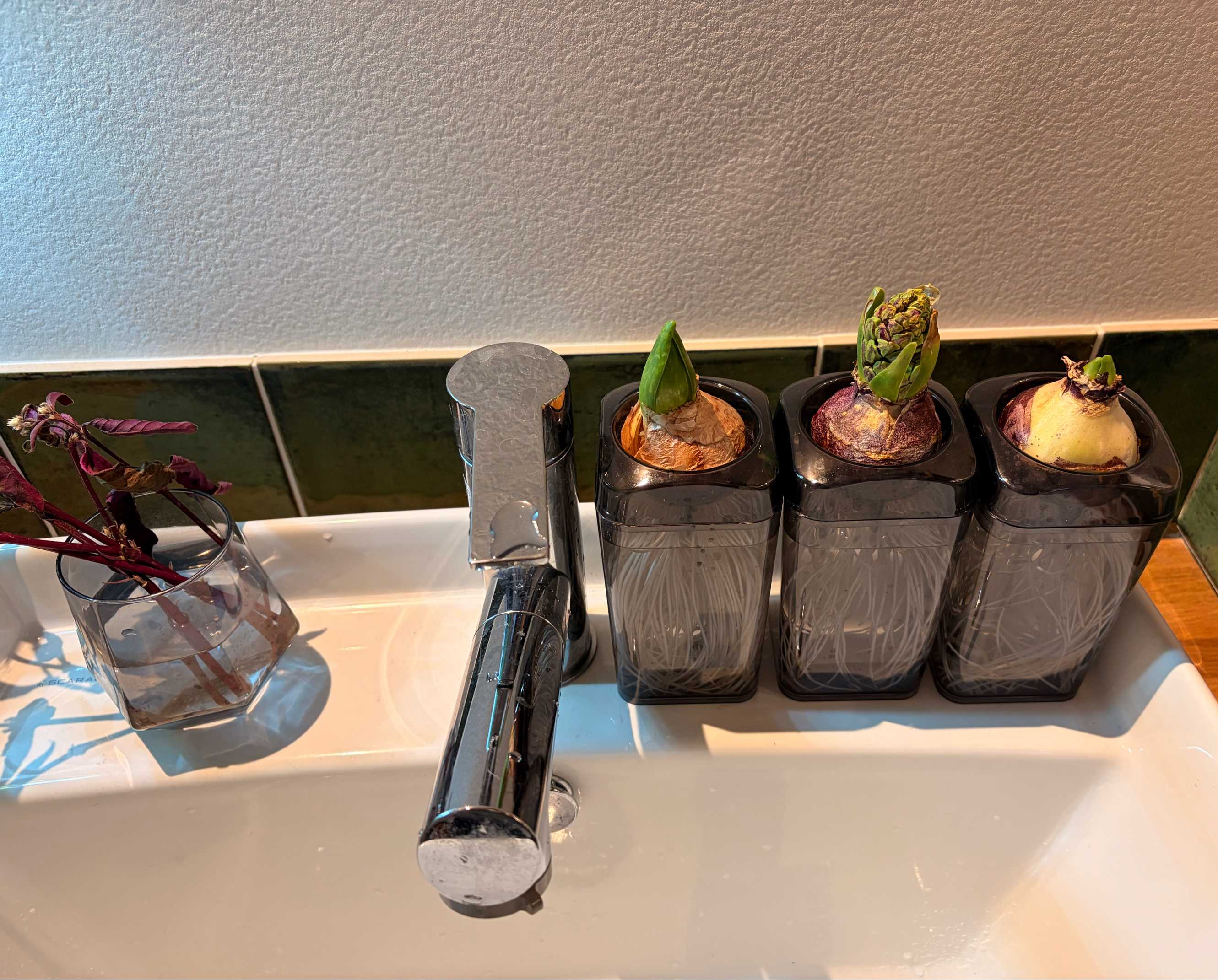 なぜか真ん中のヒヤシンスは始めから花芽がモリモリでてます。