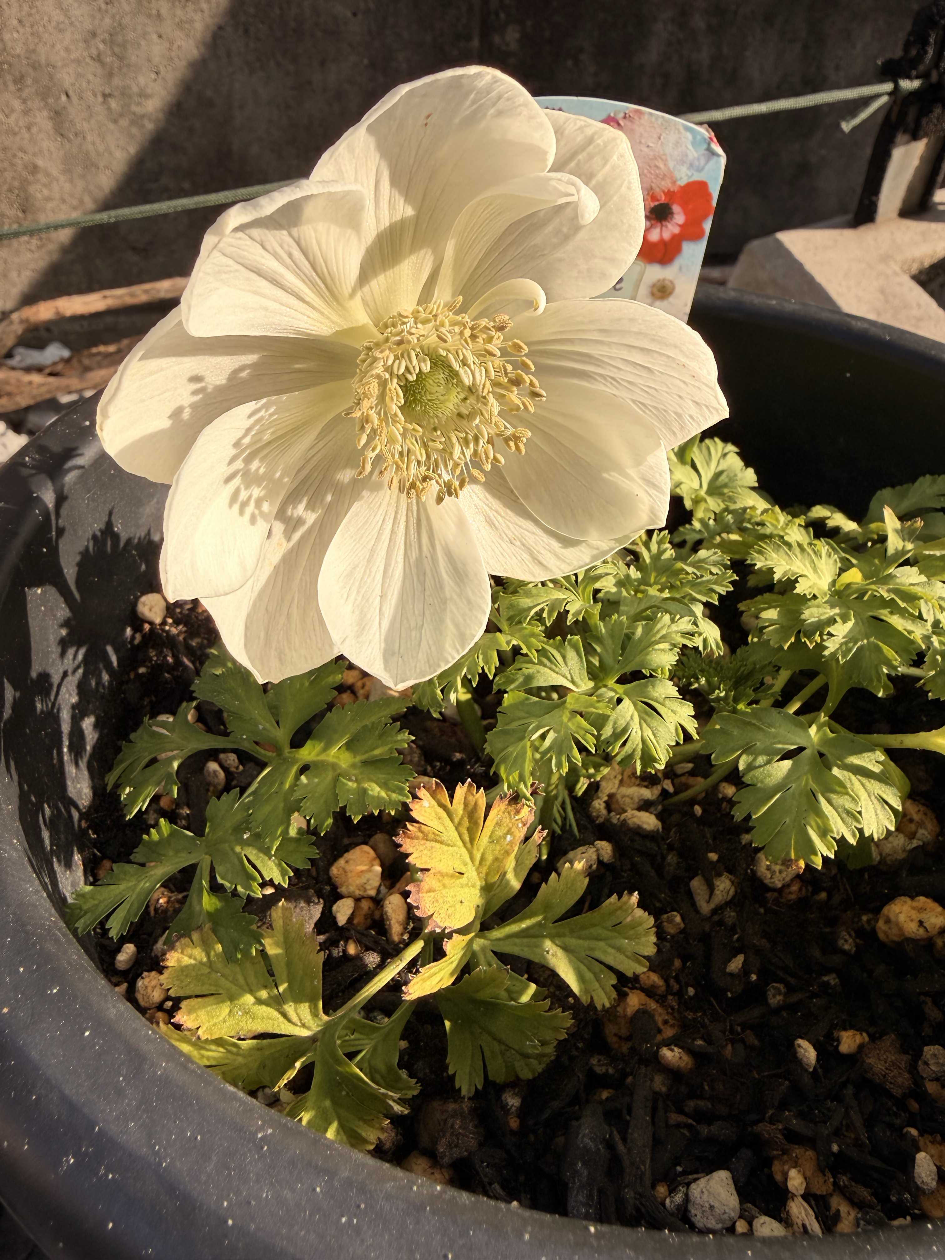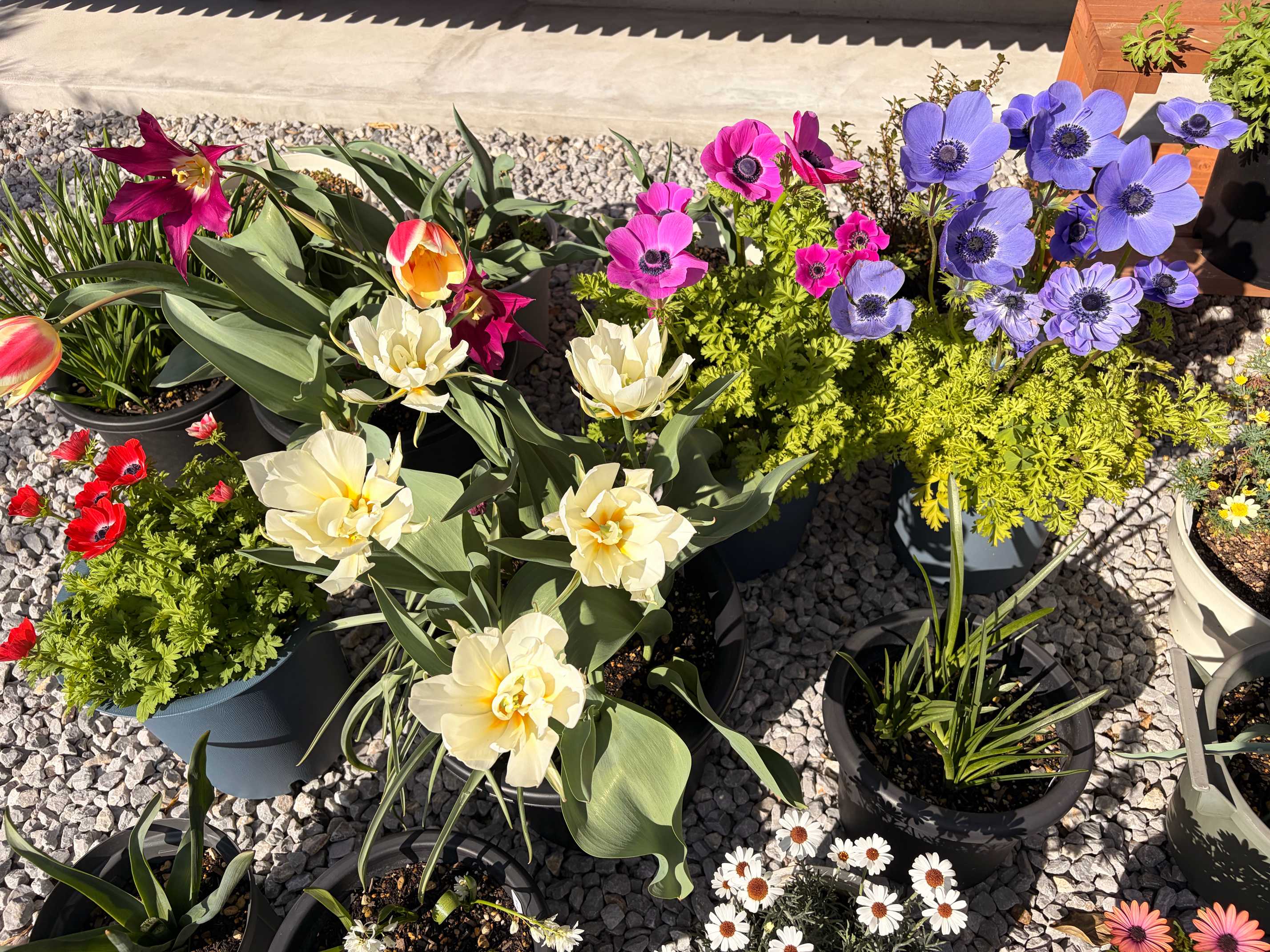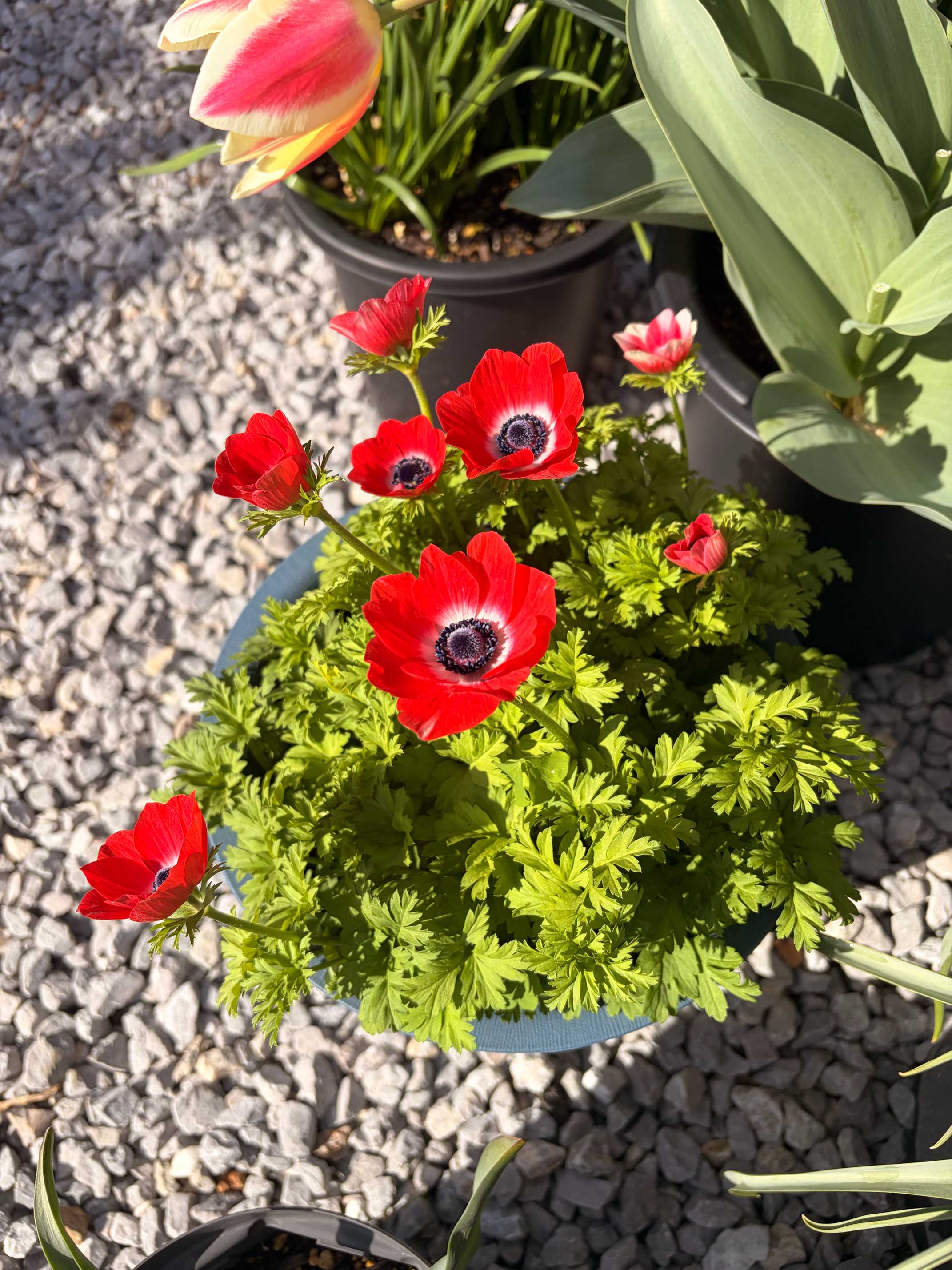 赤はまだ葉のみ。おつとめで買った白アネモネがちらほら咲いてます。