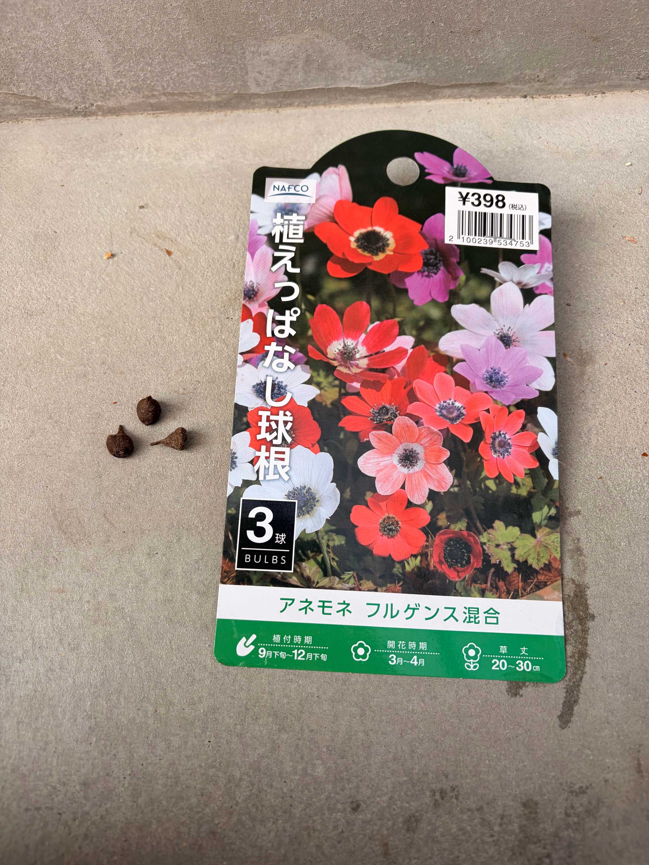アネモネ フルゲンスこんな小さな球根3つ。148円ならあり。アネモネは本来は吸水処理してから植えるけどまぁええか。原種に近いアネモネっぽいから強いでしょう??