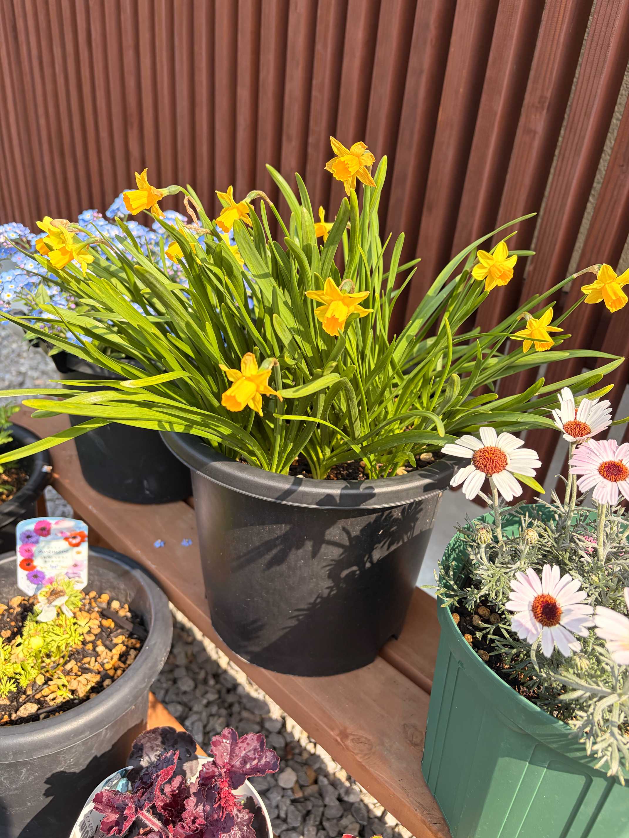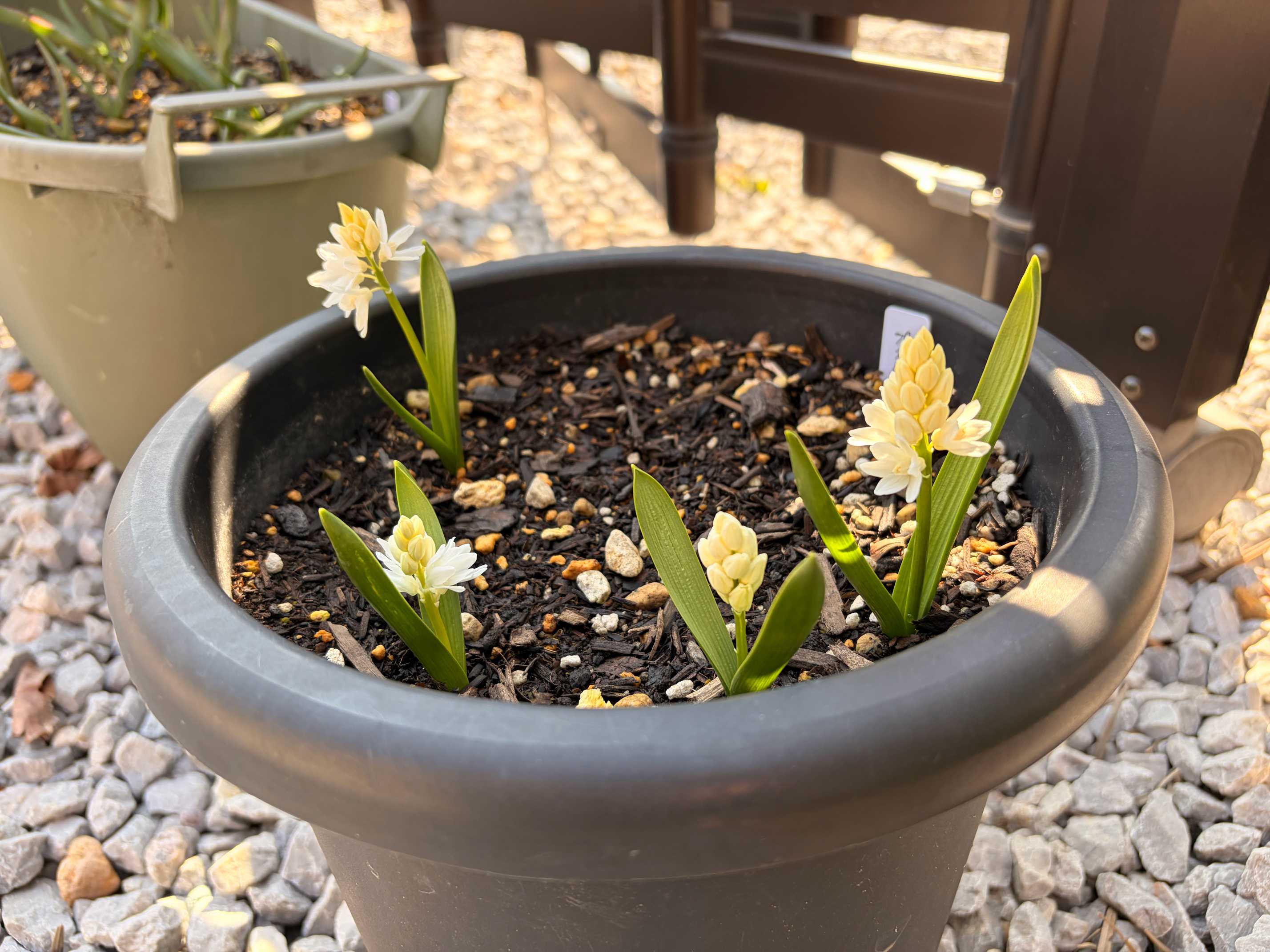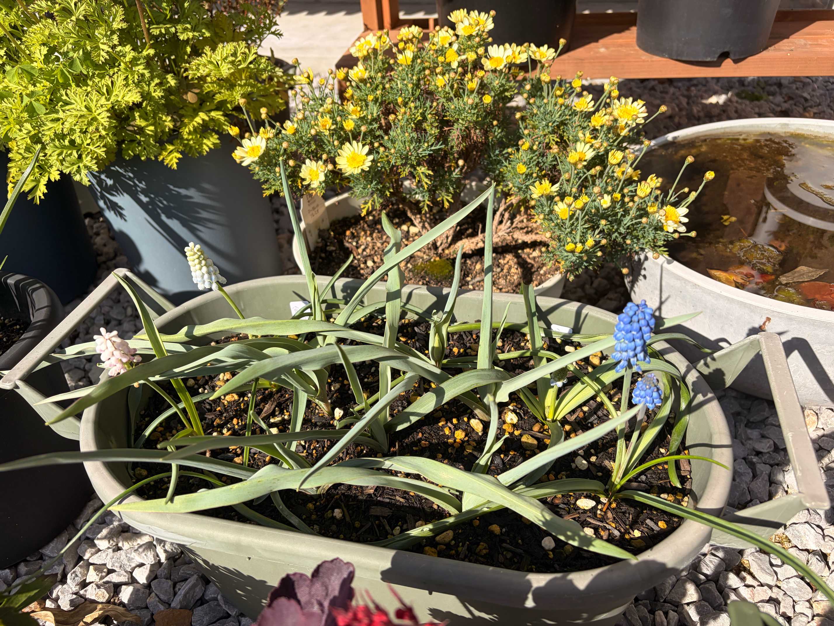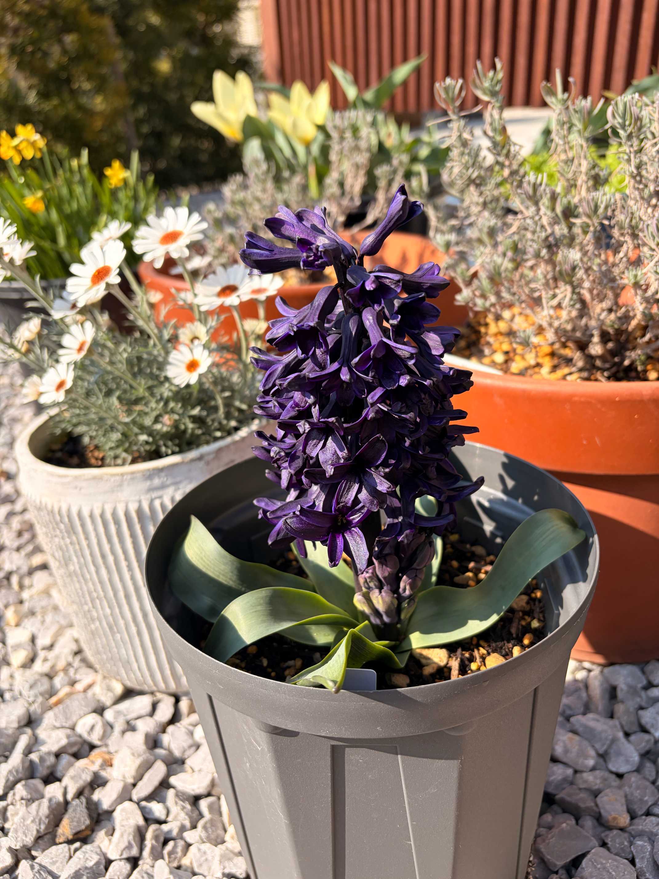1番華やかな時かもしれないのでまとめた写真。ヒヤシンソイデスはまだまだ葉っぱですが。