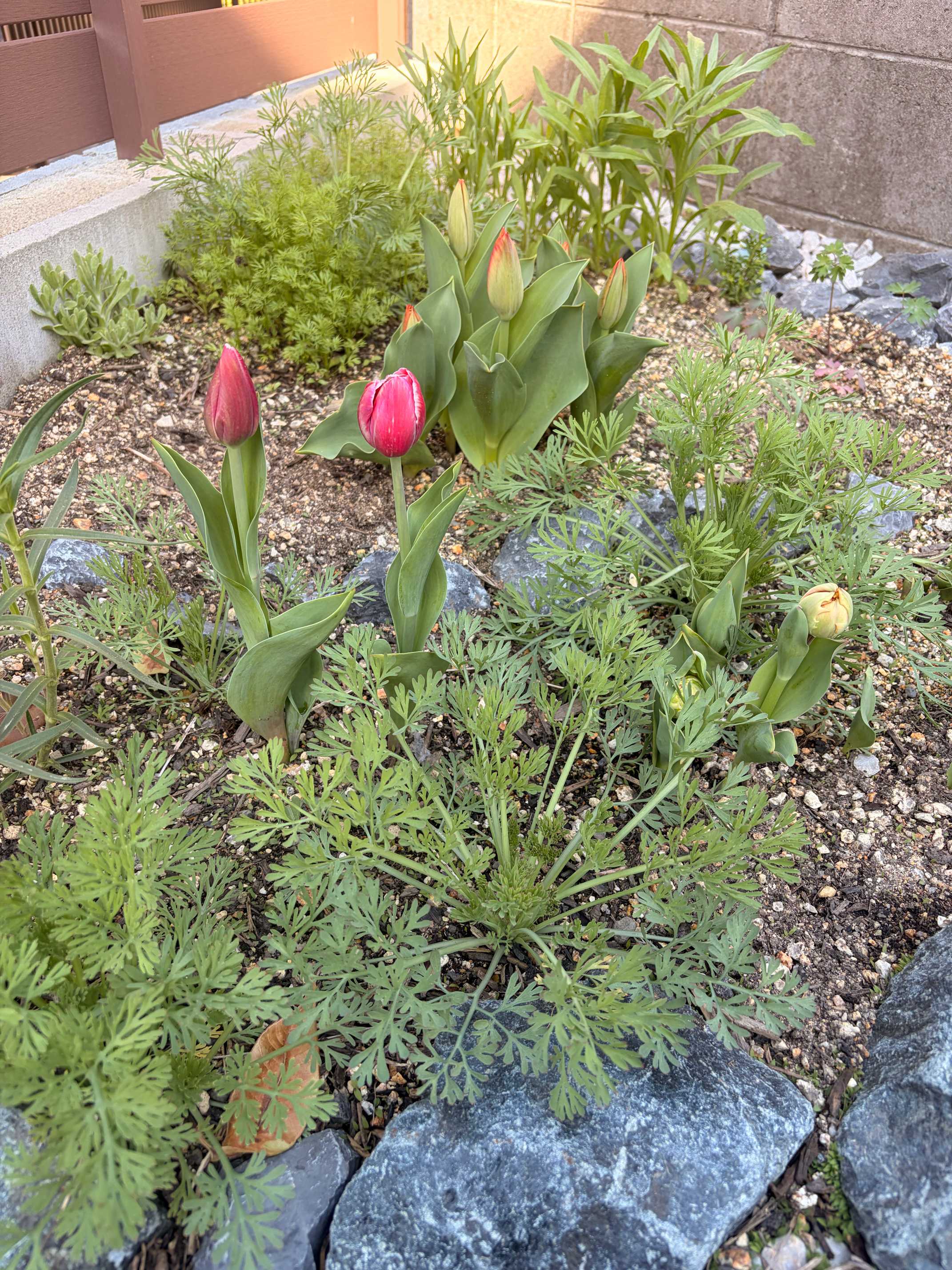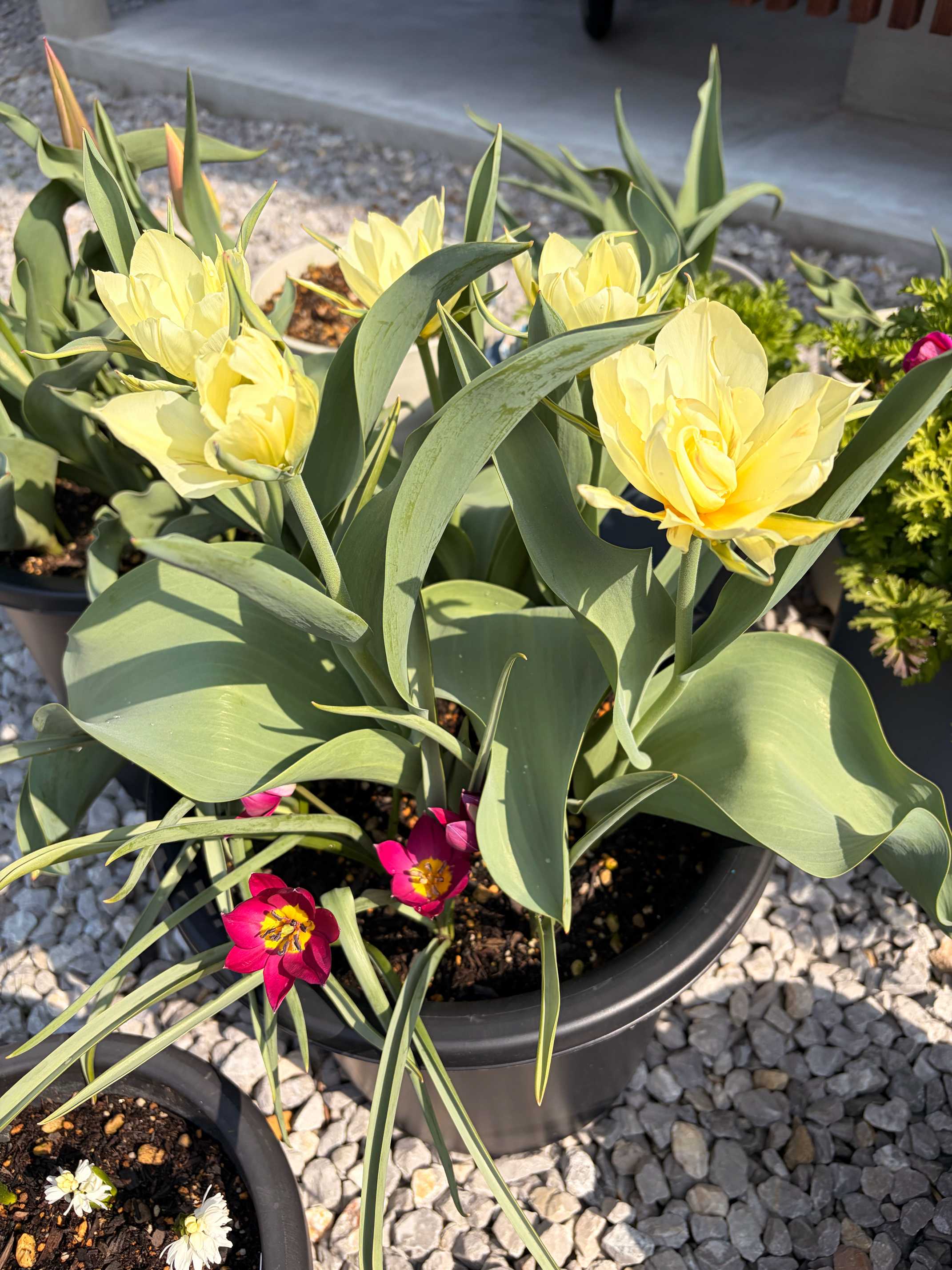 原種チューリップが非常に窮屈そうですが一緒に咲いてくれました。真っ赤だと思ってたら上品な赤紫なペルシャンパールでした。