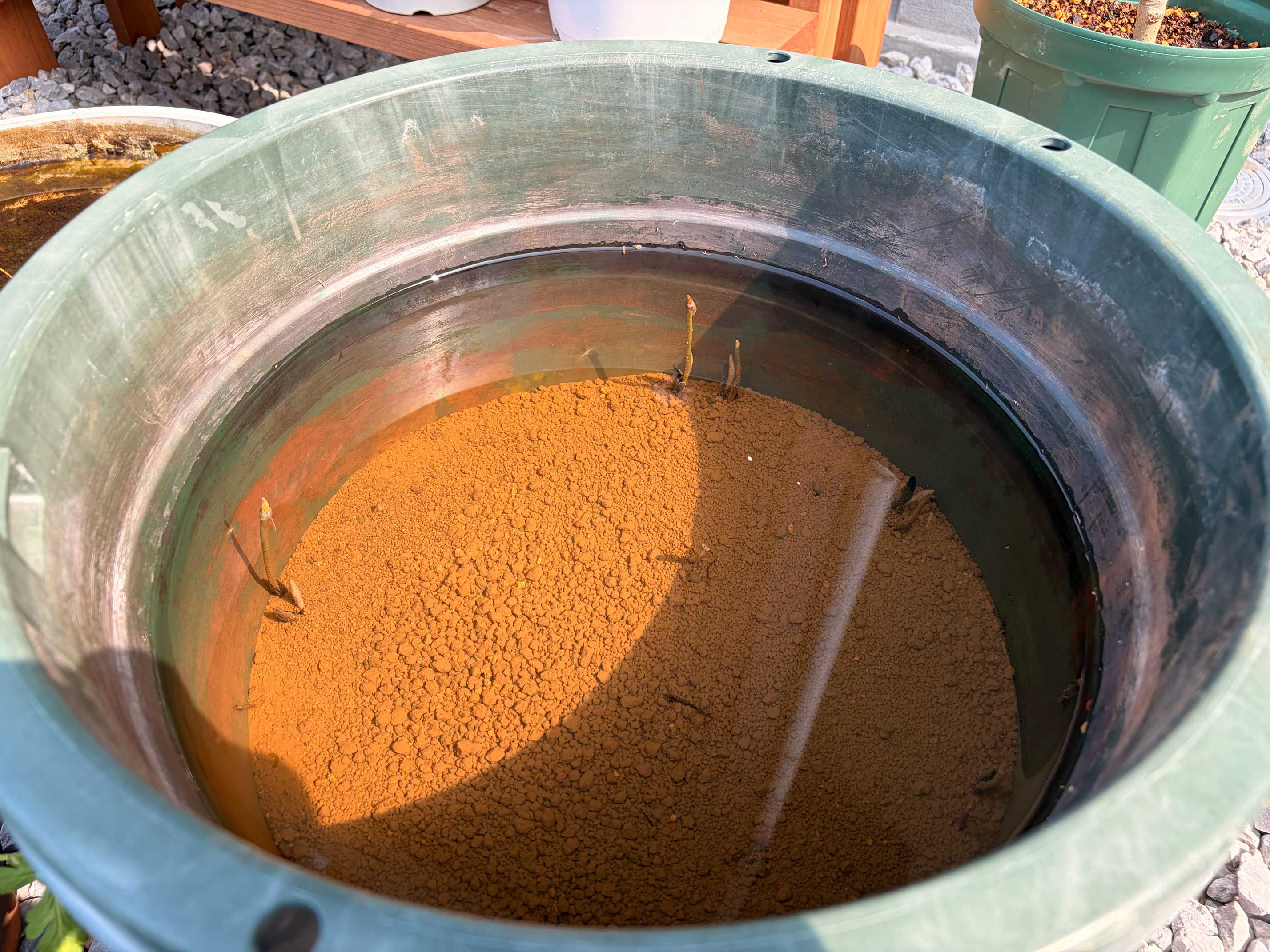 ハス…も球根でいいのか…?宿根?数日前にタライをひっくり返してリセットしましたが新芽がニョロニョロしてきました。去年は咲いてくれなかったので毎年のリセットが必須なんだと痛感しました。