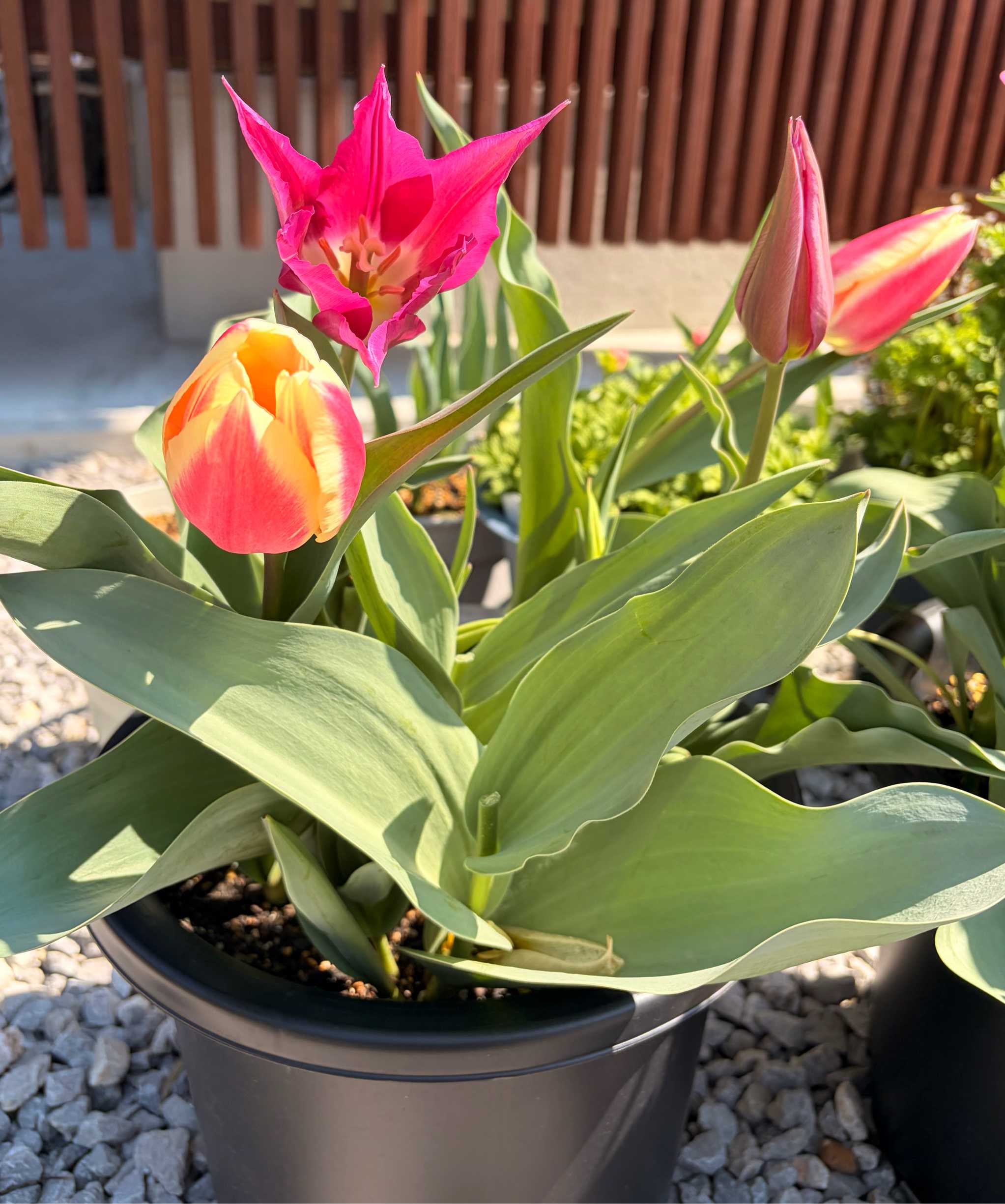 単球チューリップ紫と桃白が咲いてくれました。単球のチューリップはやはり安心の咲っぷり。大きな球根が大正解ですね。