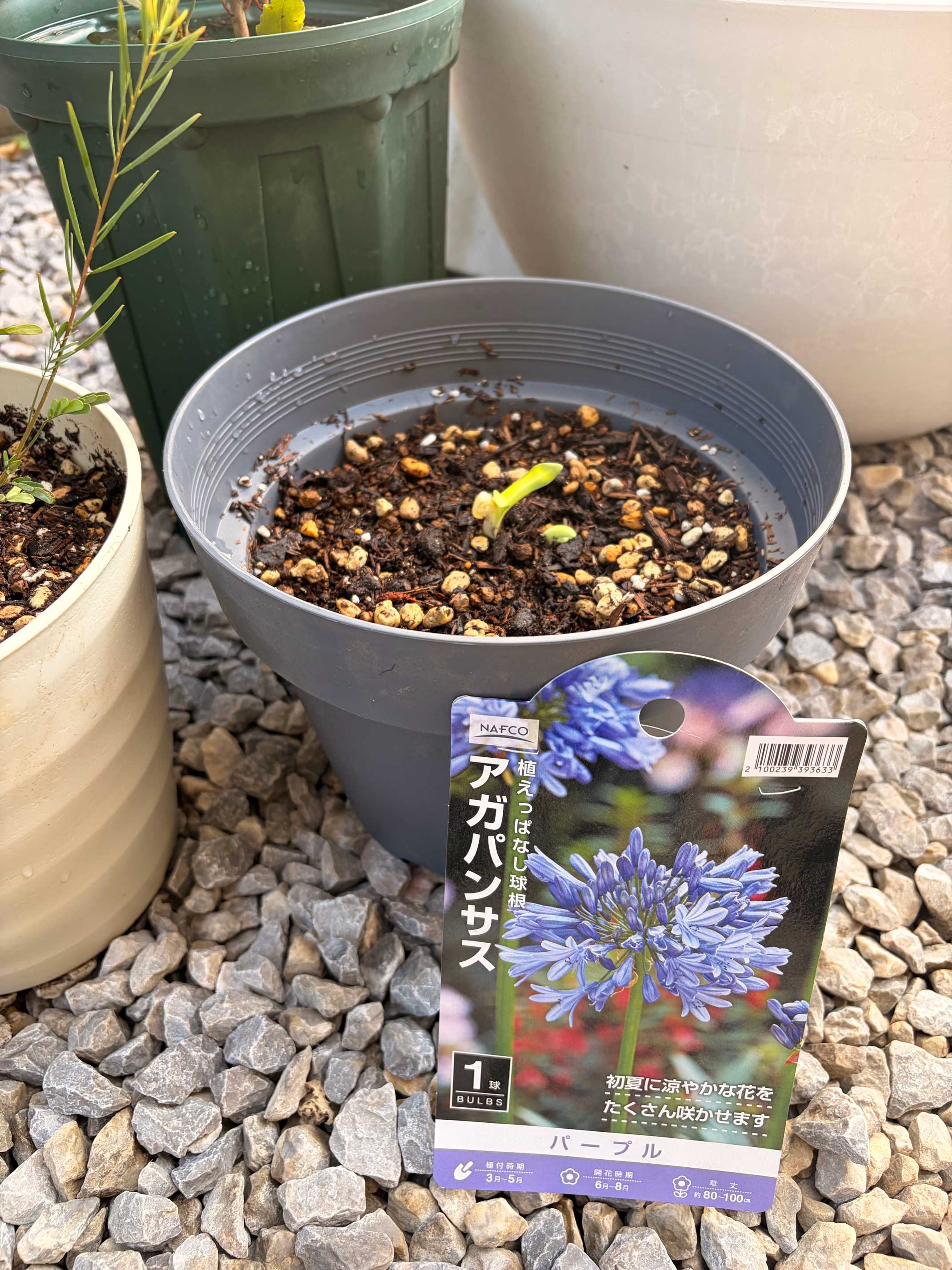 無名アガパンサスの球根を見つけました!アガパンサス売ってるの初めて見ました。しかも400円とお安い。タグをみると国華園さんのお花みたいです。無名の方が大抵強いので安心です。初めから芽が出てたので芽は出して浅植えにしました。