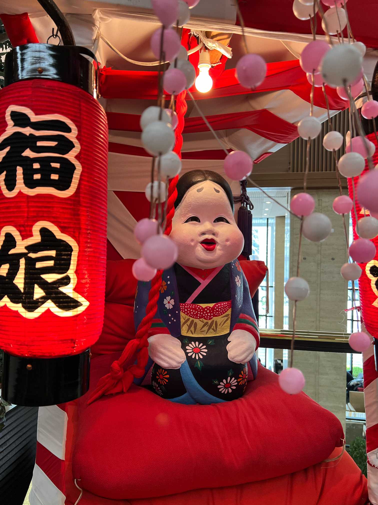 まだ松の内ですもん。ロビーだってお正月。福娘が迎えてくれました