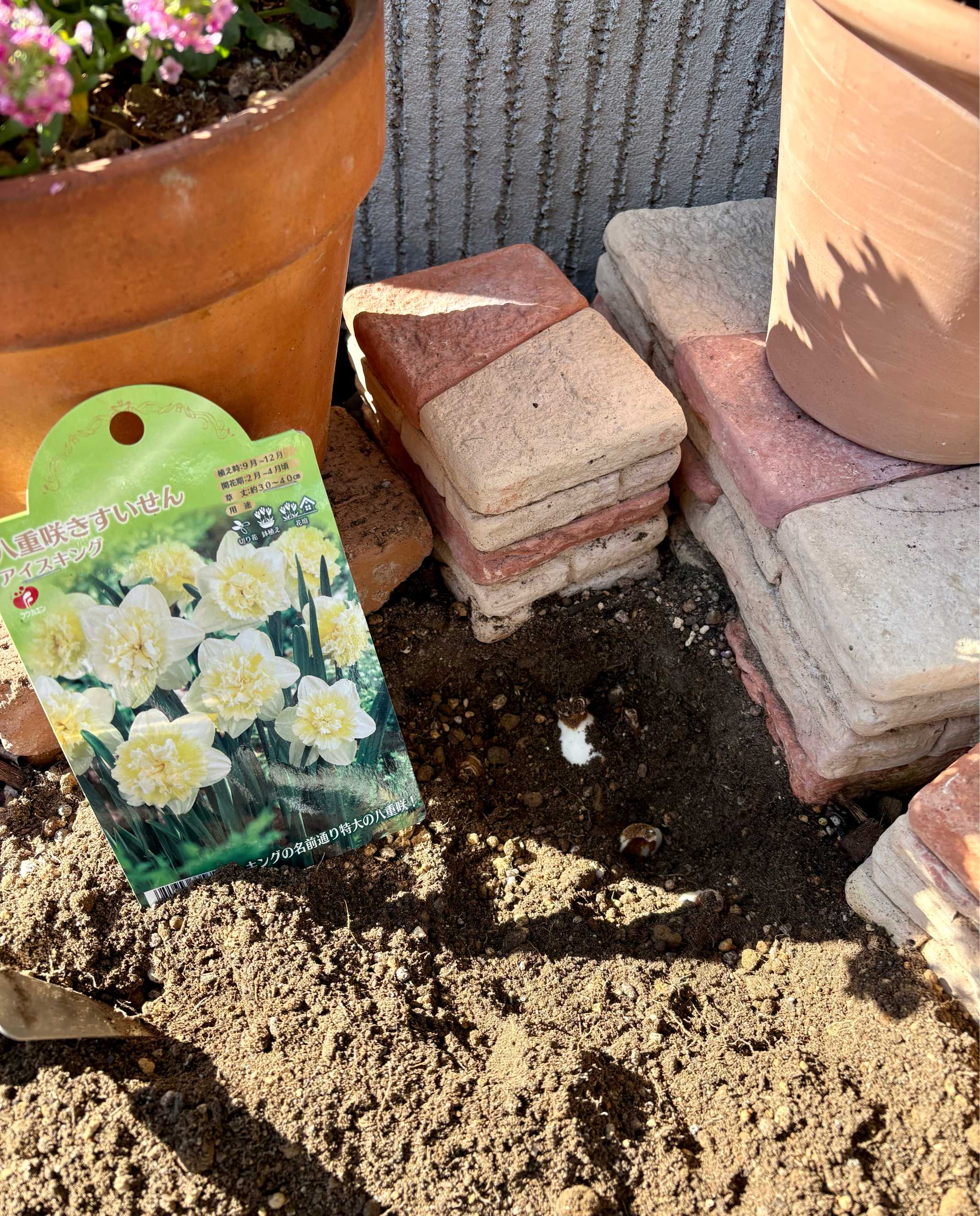 プリムラの奥には先ほどのスイセンを植えています。