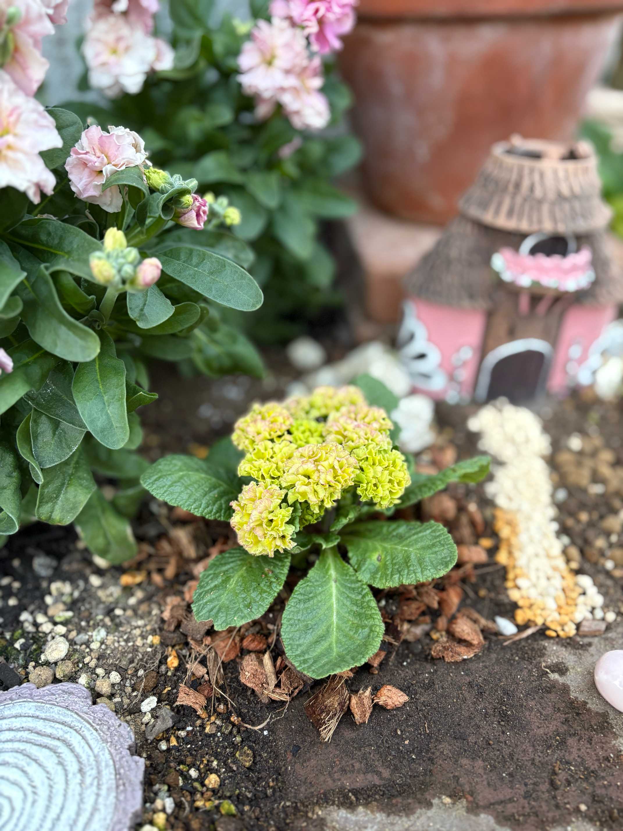 早速買ってきたプリムラ クラシカルラパンを植え付けて、隙間を少しだけなくしました。植物が植えてあったり、置物がある場所は荒らさないので、ガーデン雑貨などの配置も変え、完成✨