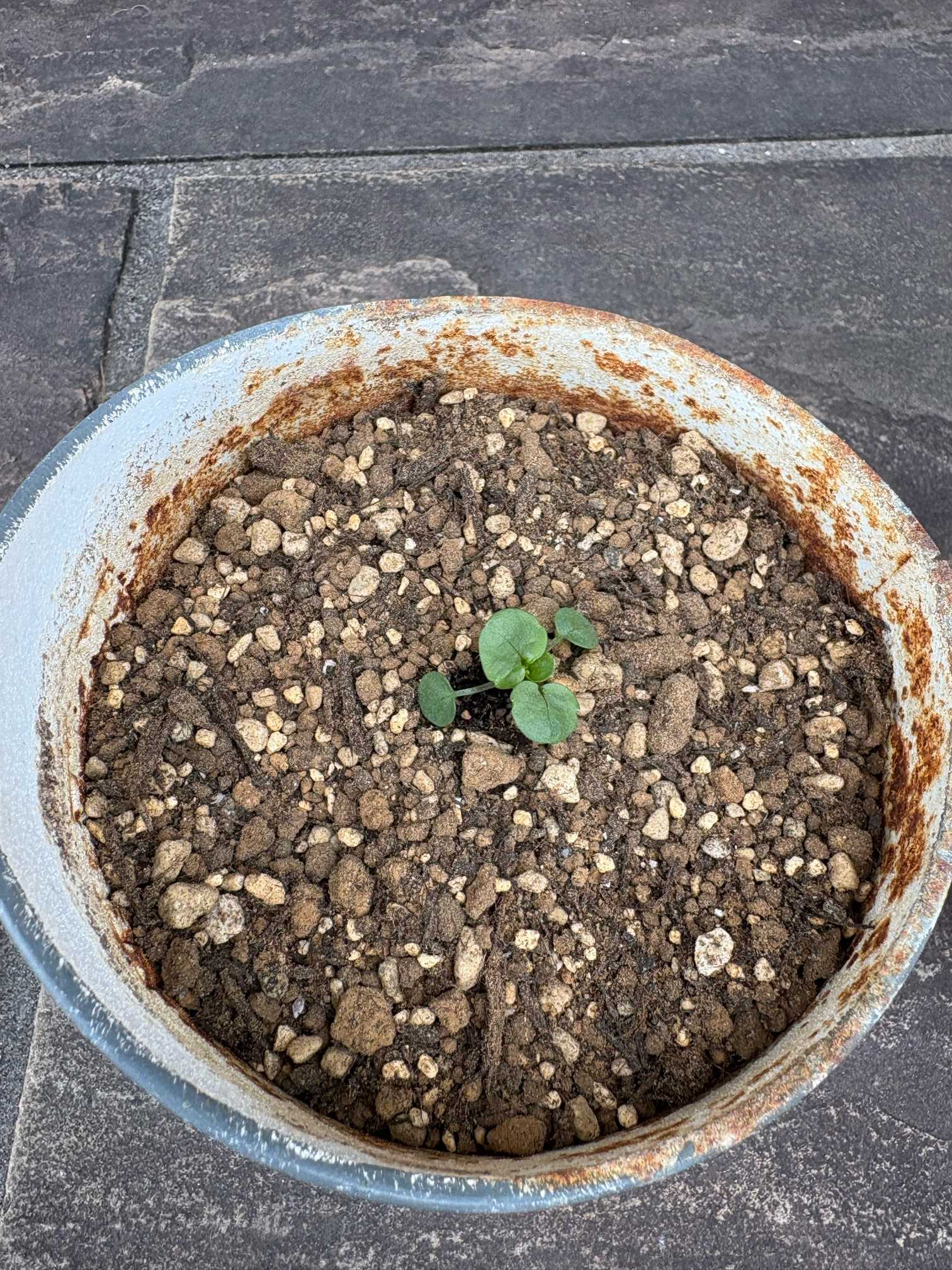 小さめのブリキ鉢に植え付け。