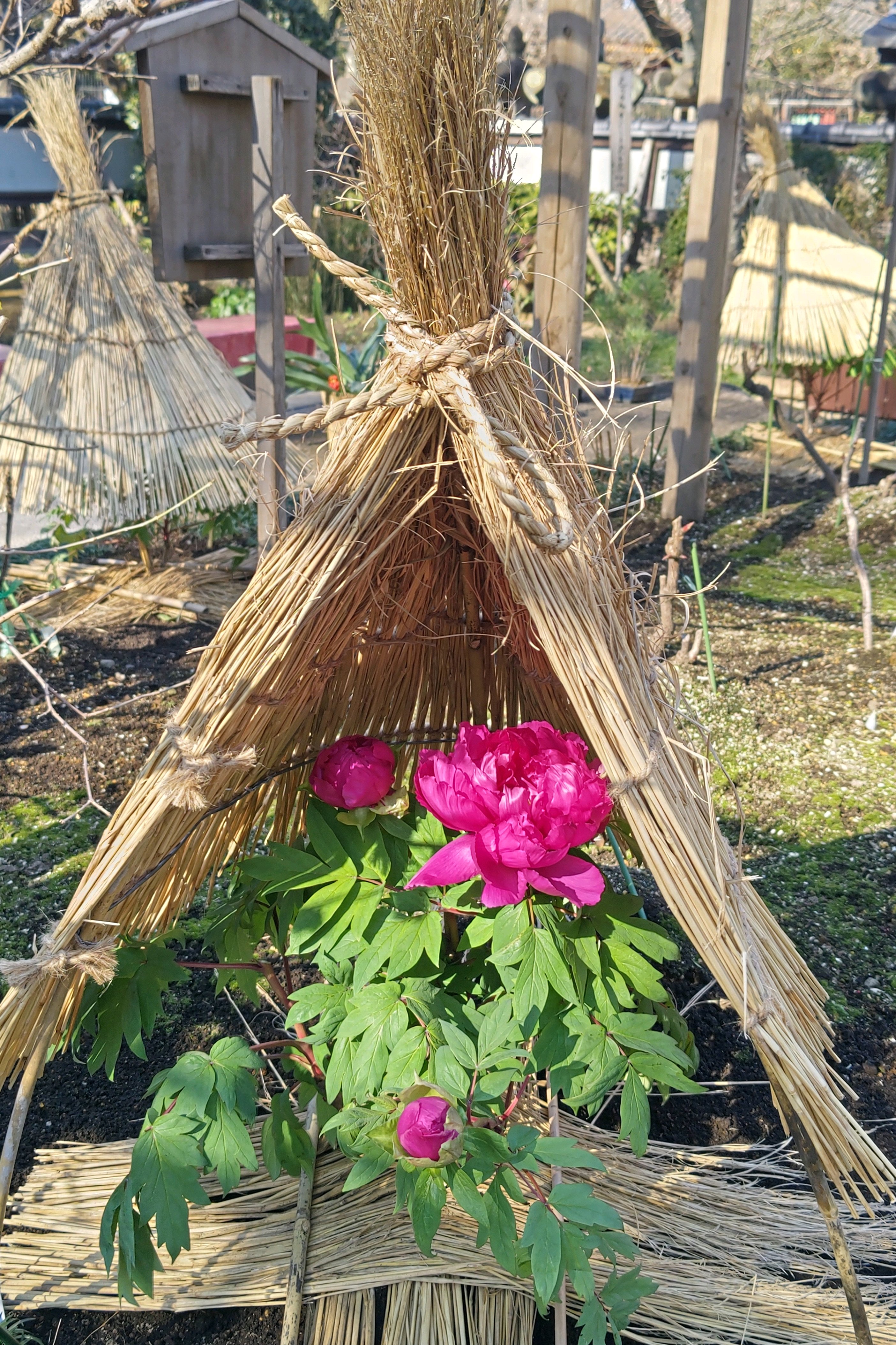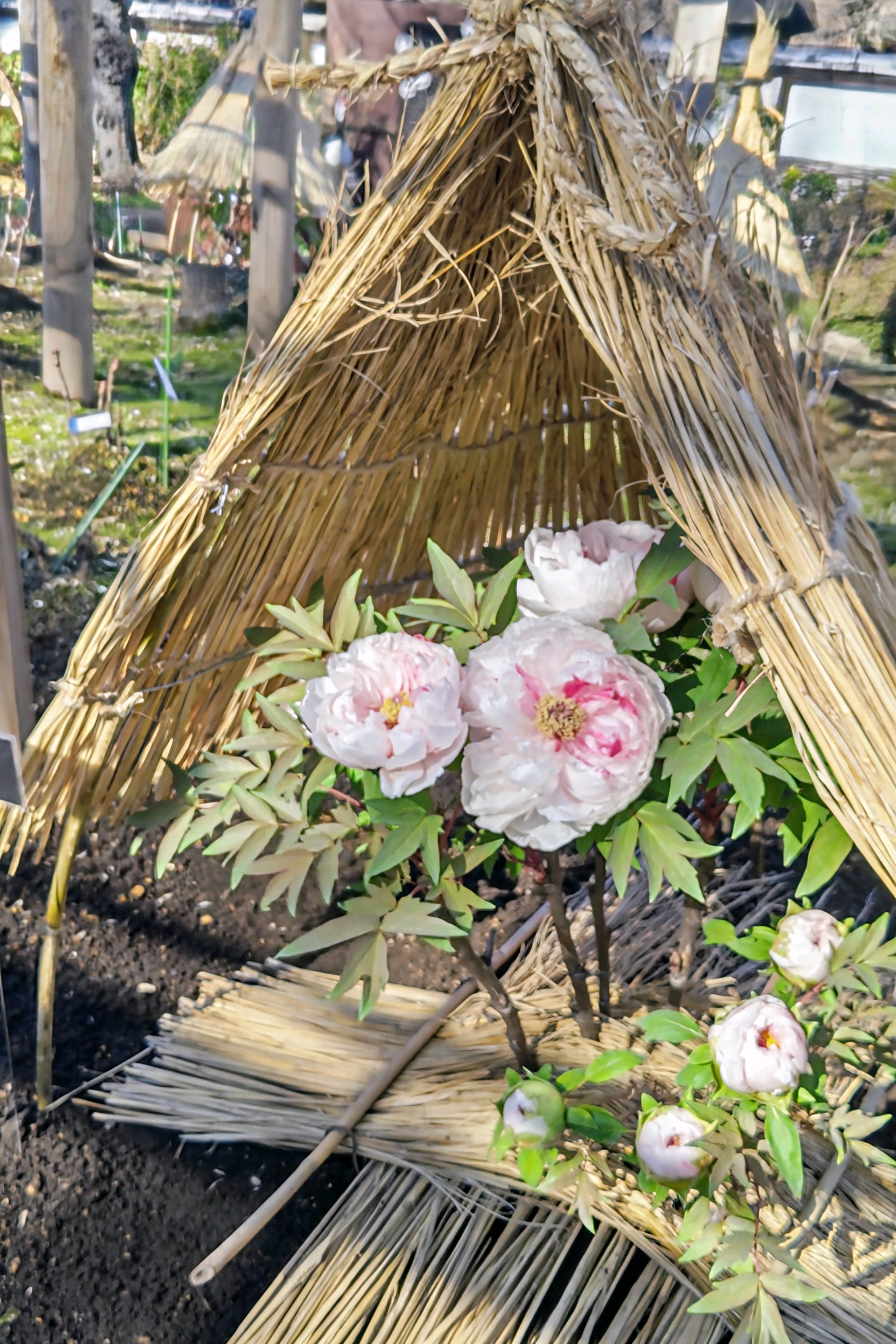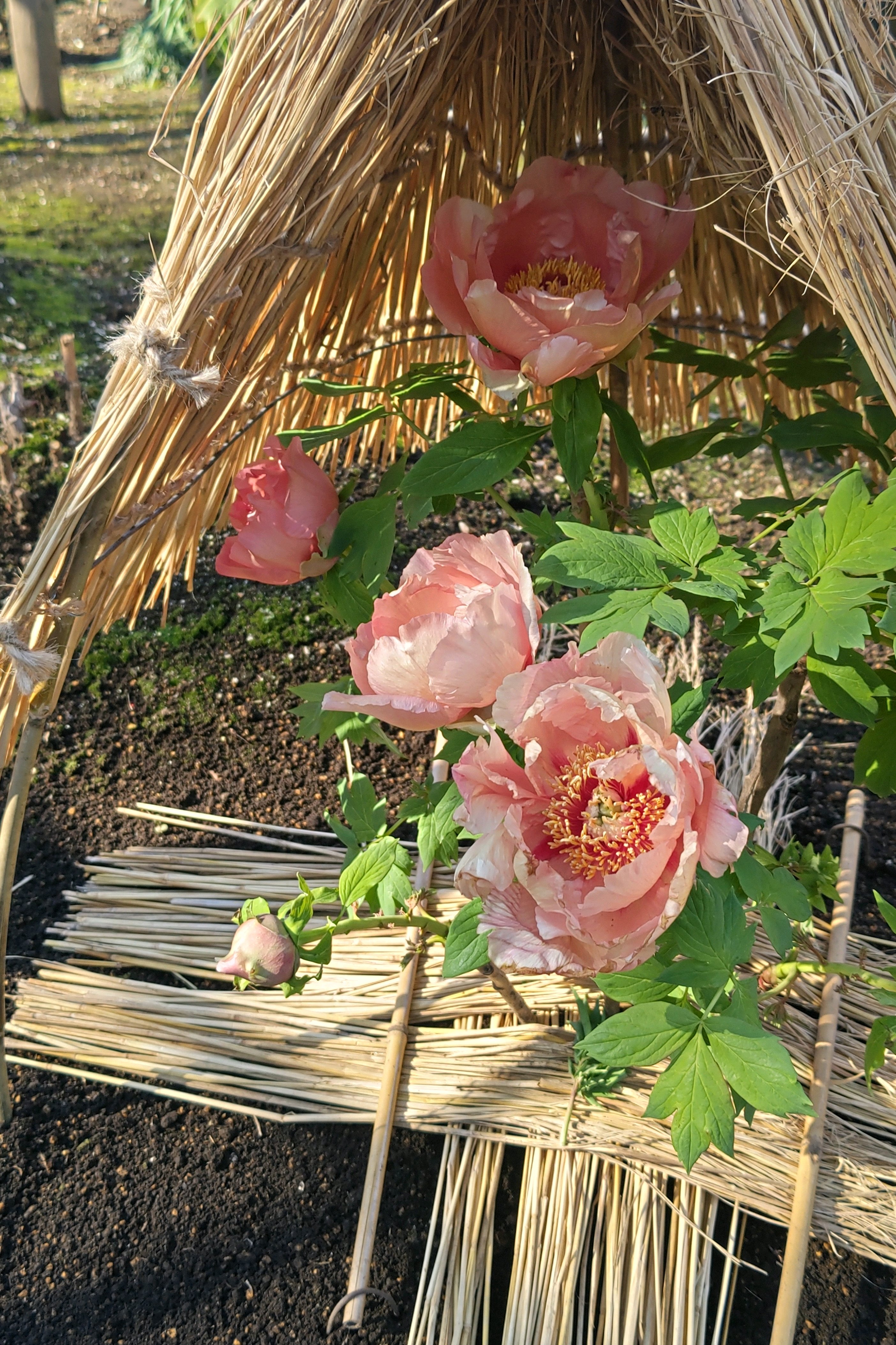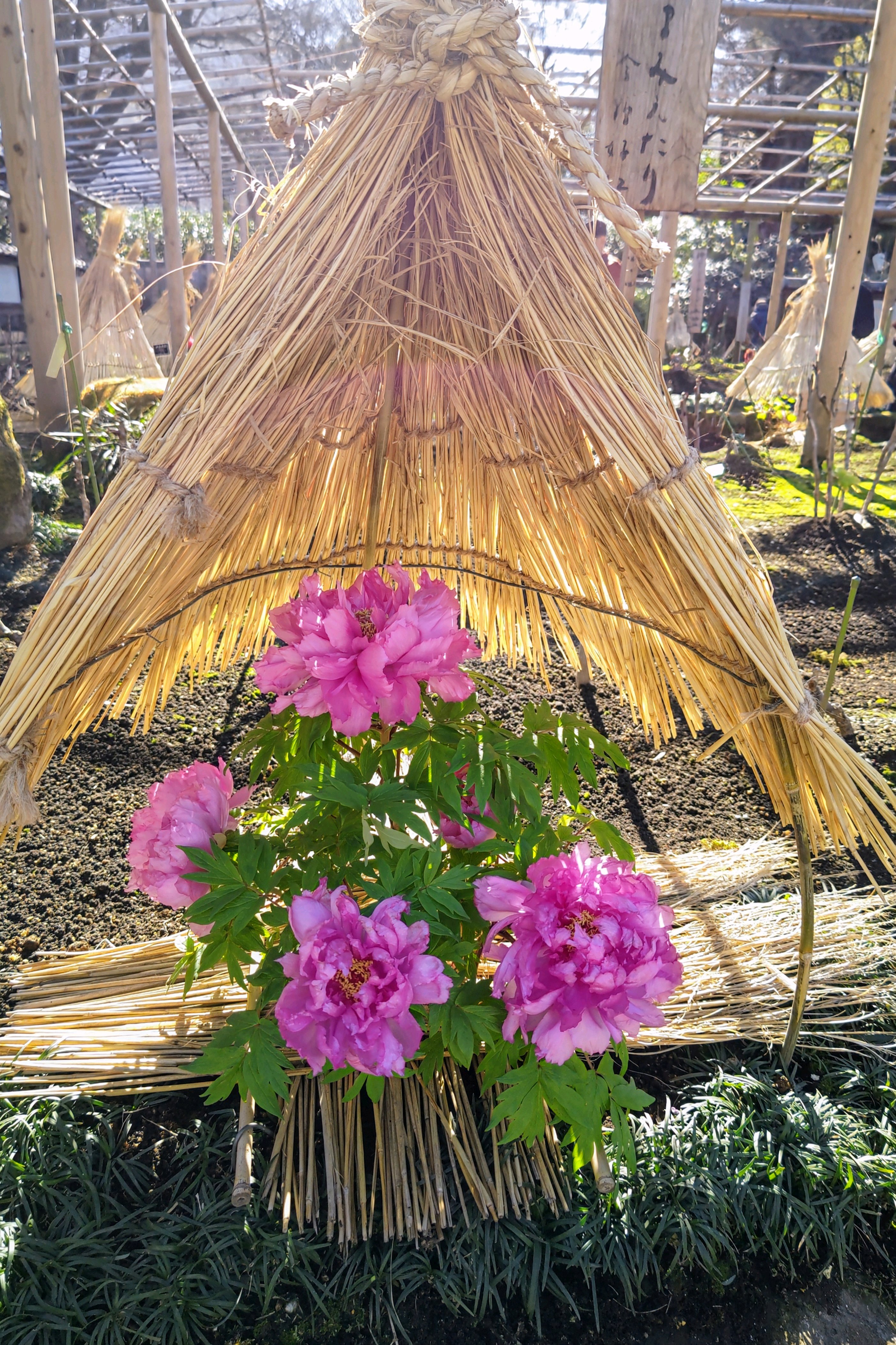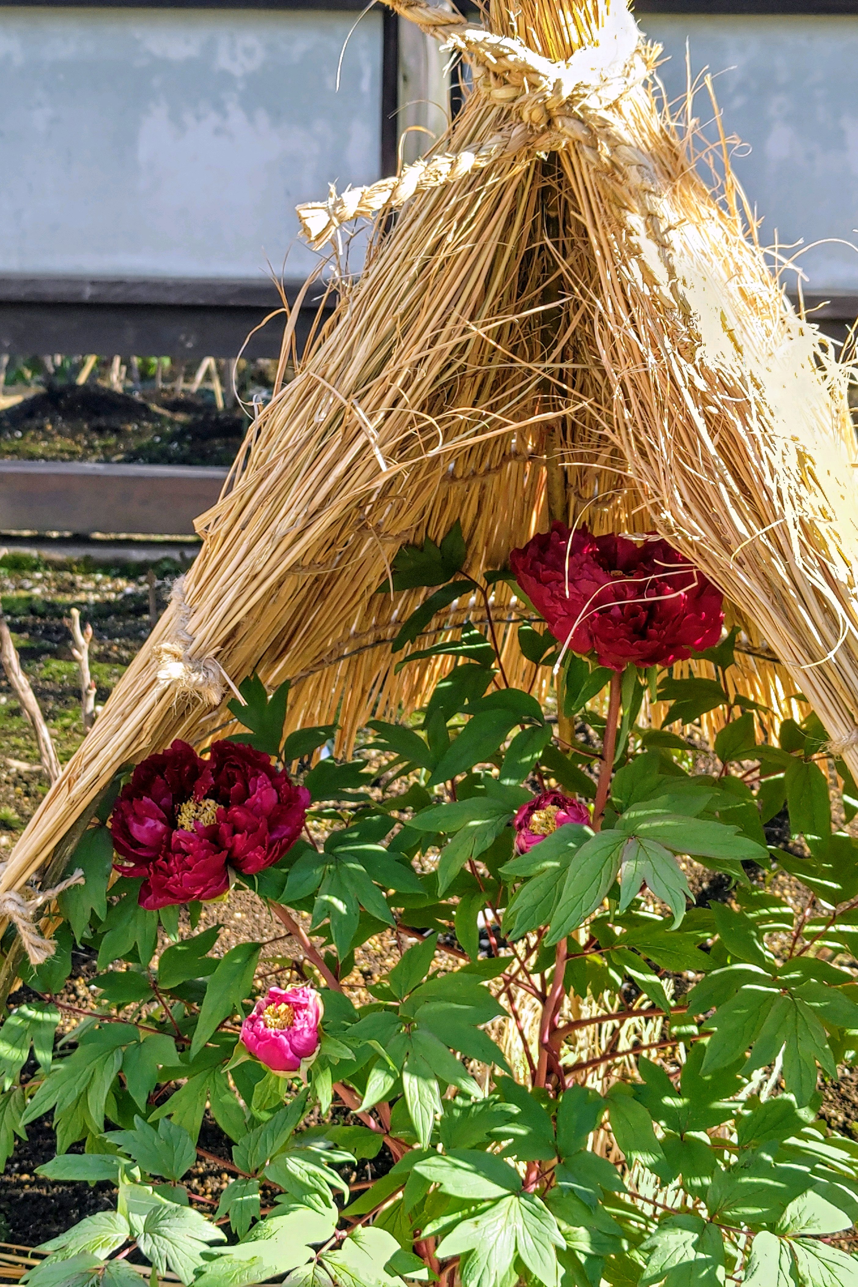 冬牡丹の着花率の低さに😳こうして花開くまでに、色々な困難乗り越えてるんだろなぁ。藁ボッチに守られた冬牡丹の姿。風情ありますね。