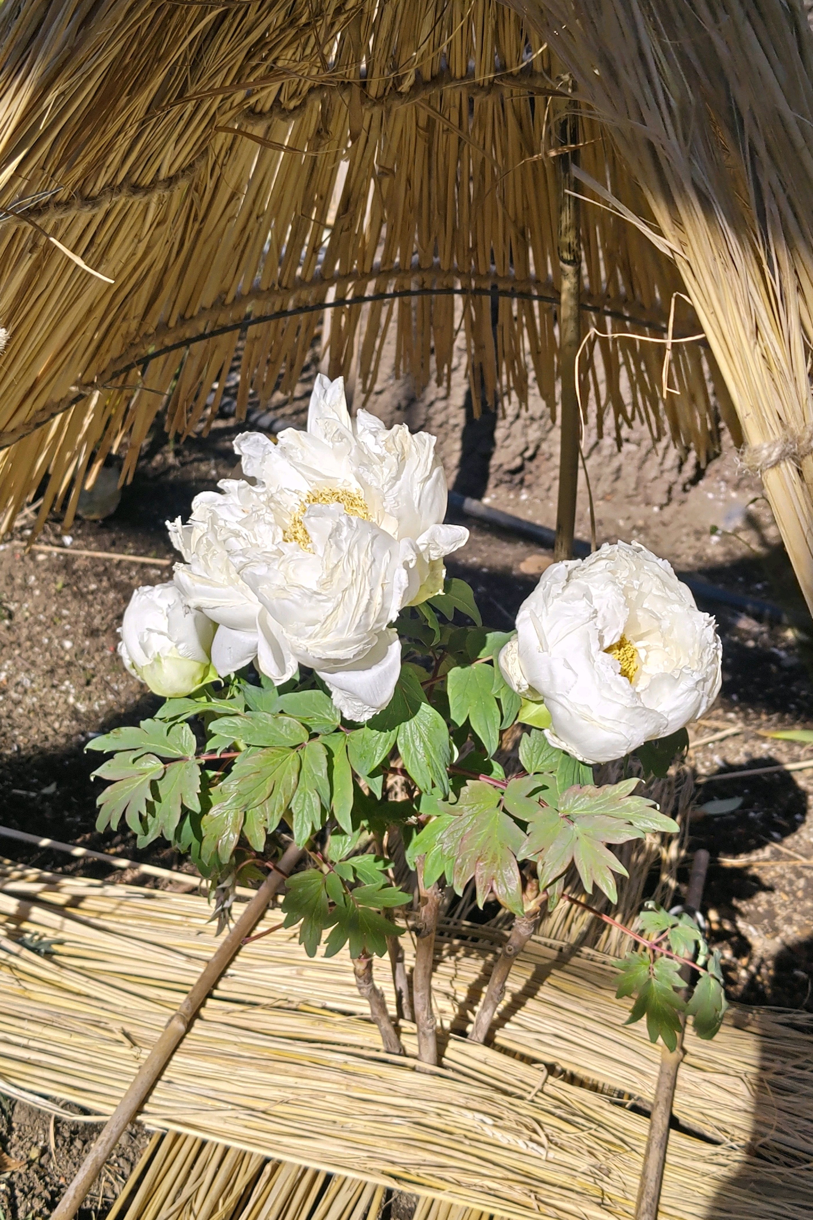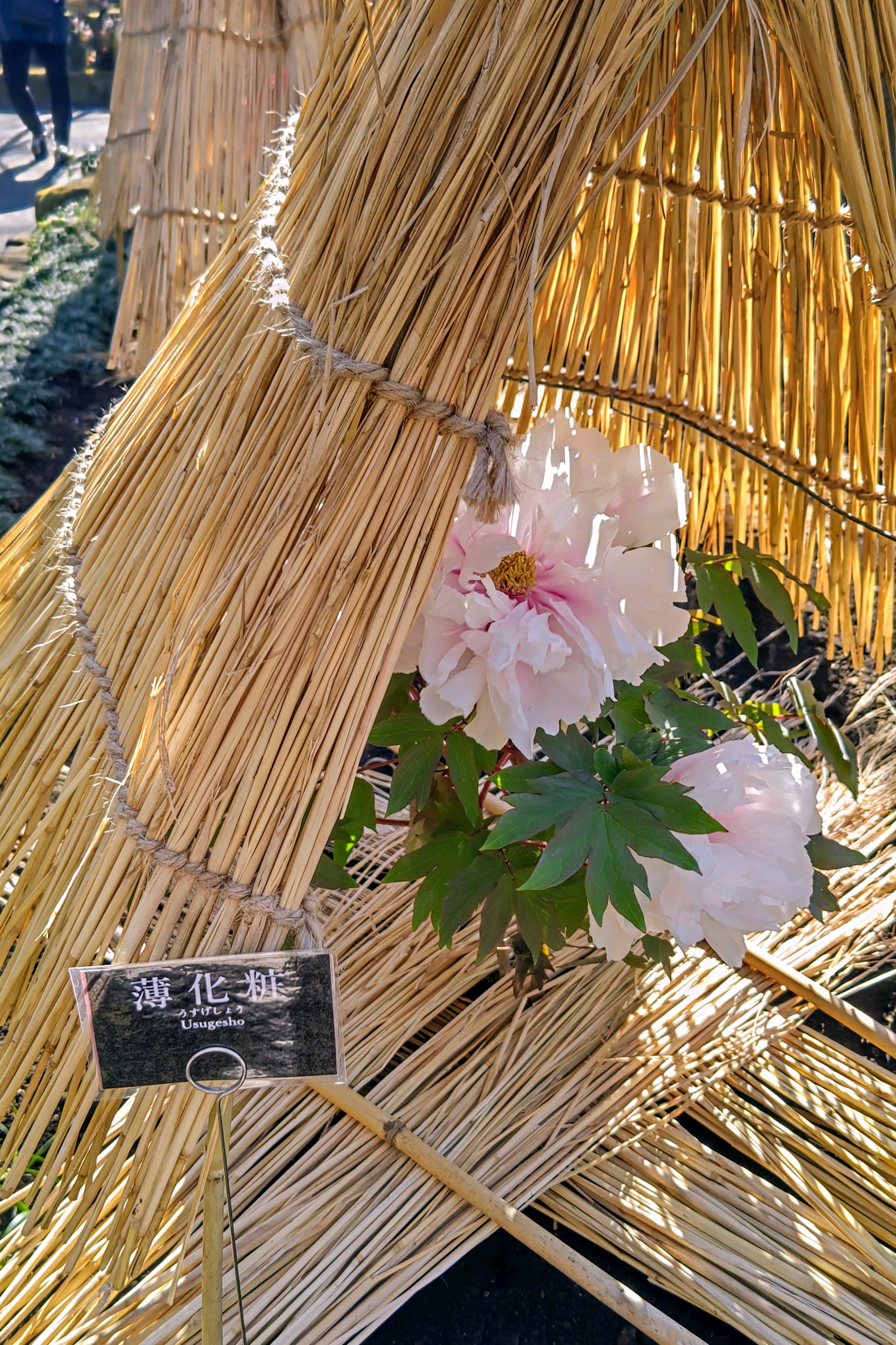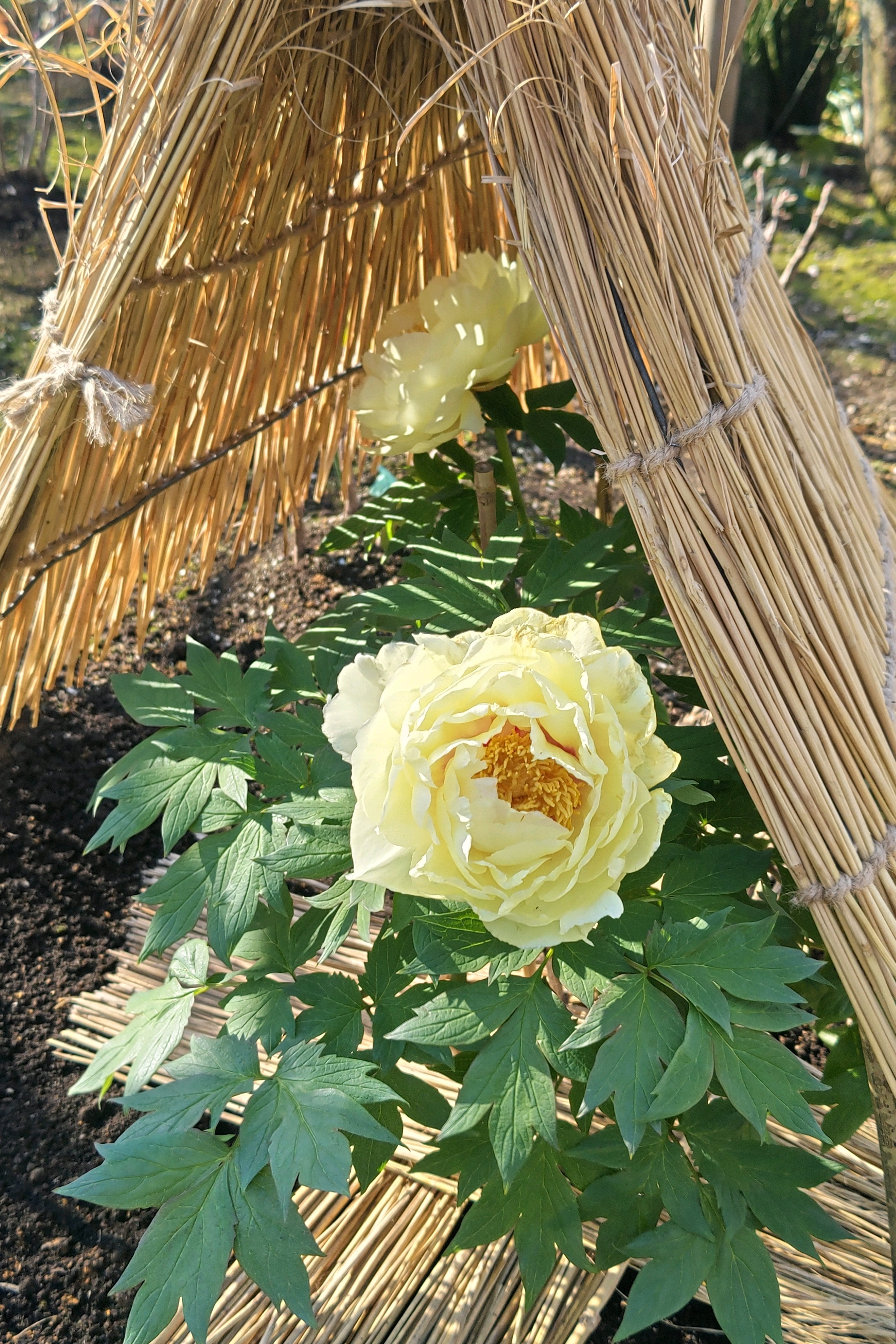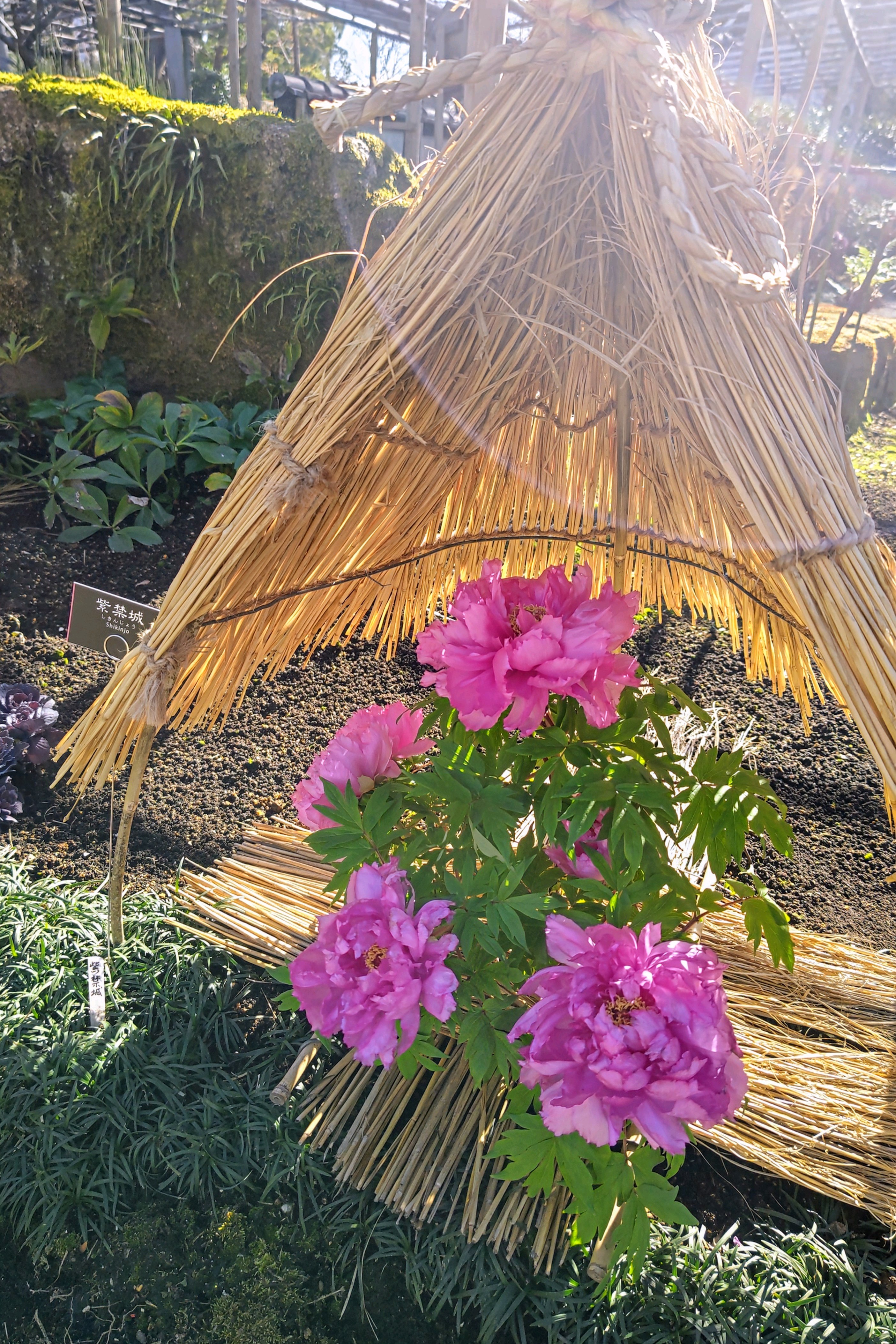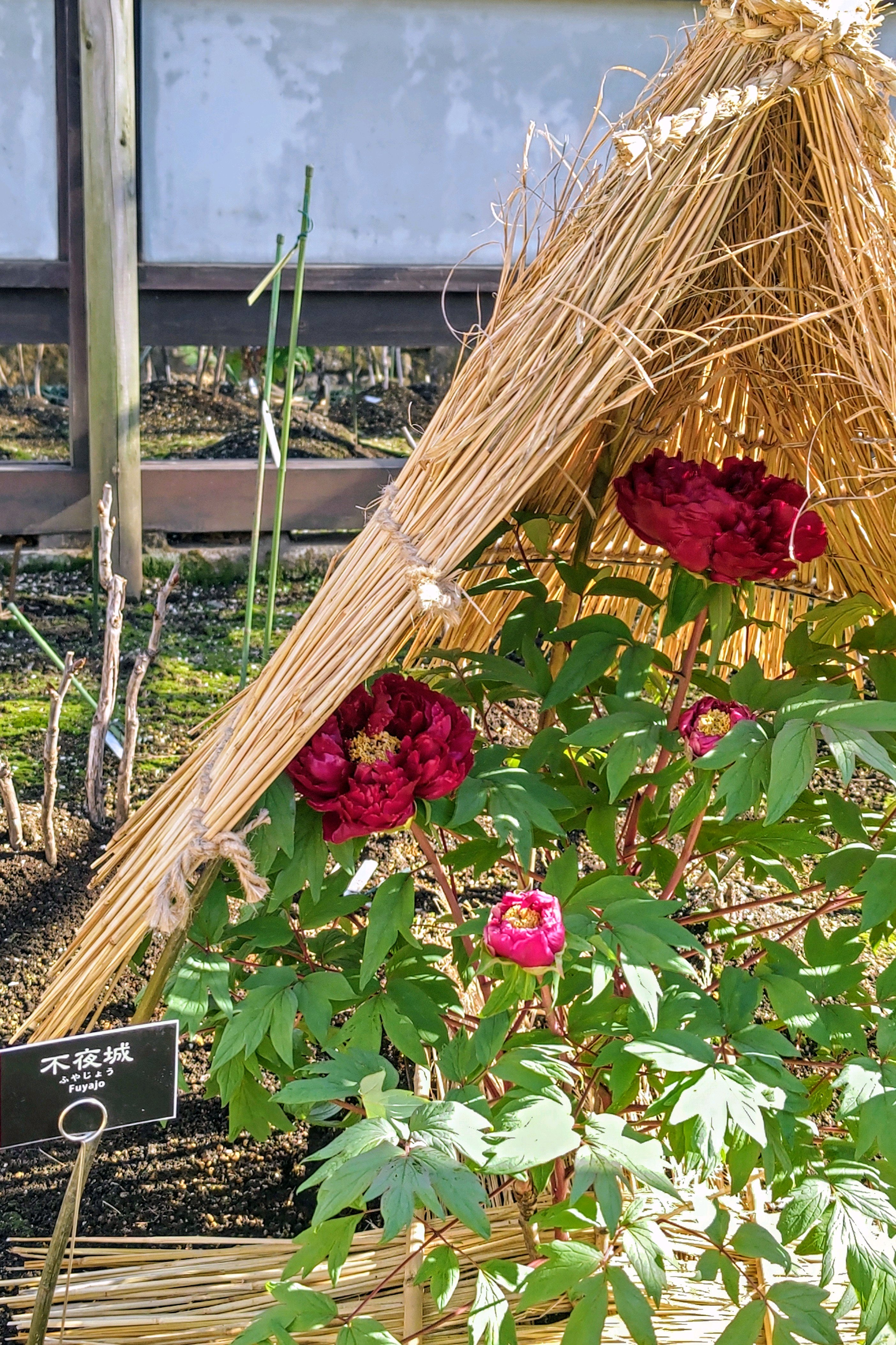 冬牡丹の着花率の低さに😳こうして花開くまでに、色々な困難乗り越えてるんだろなぁ。藁ボッチに守られた冬牡丹の姿。風情ありますね。