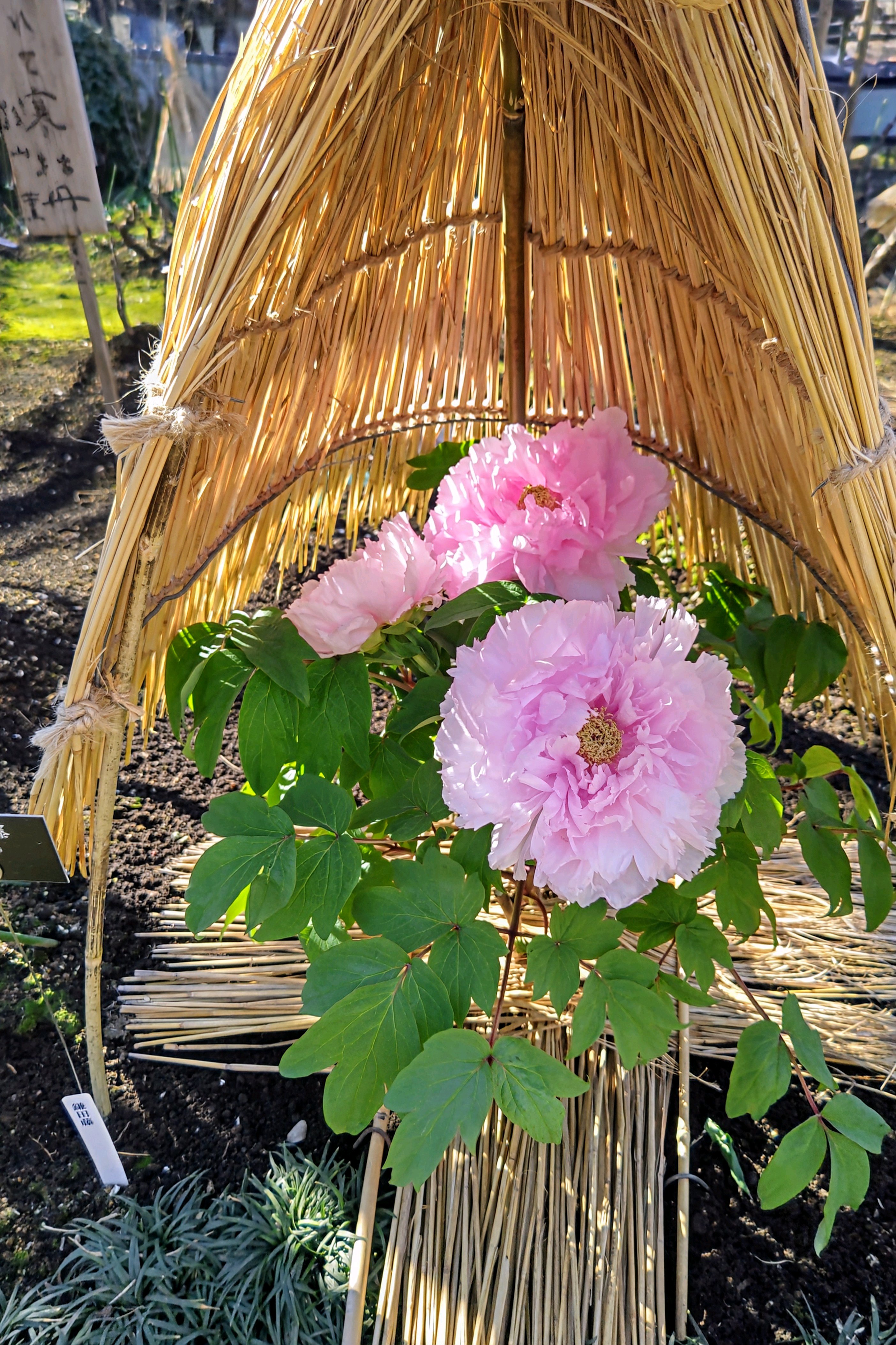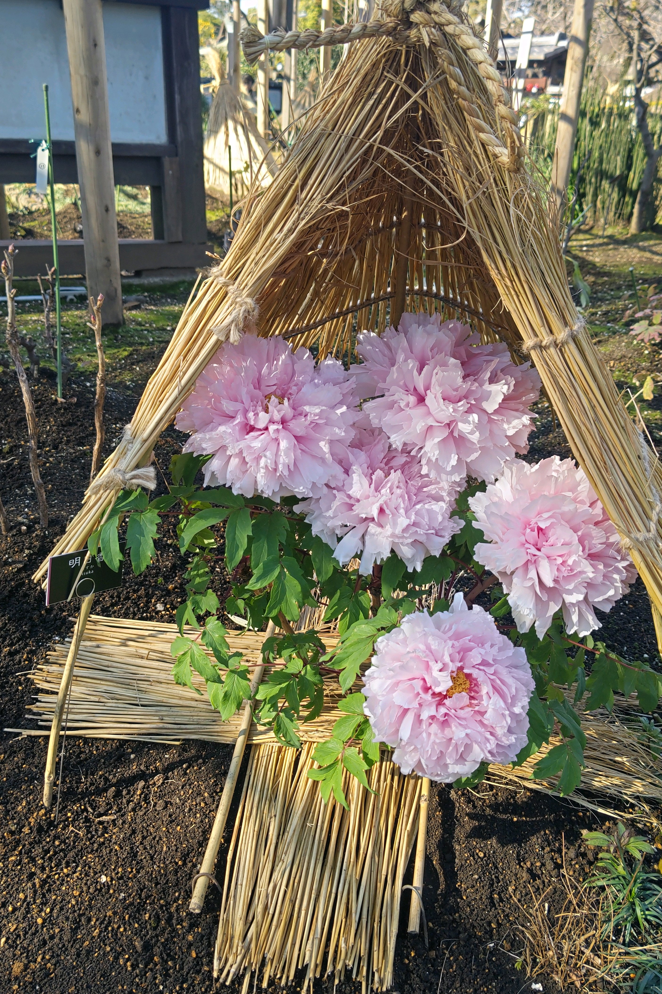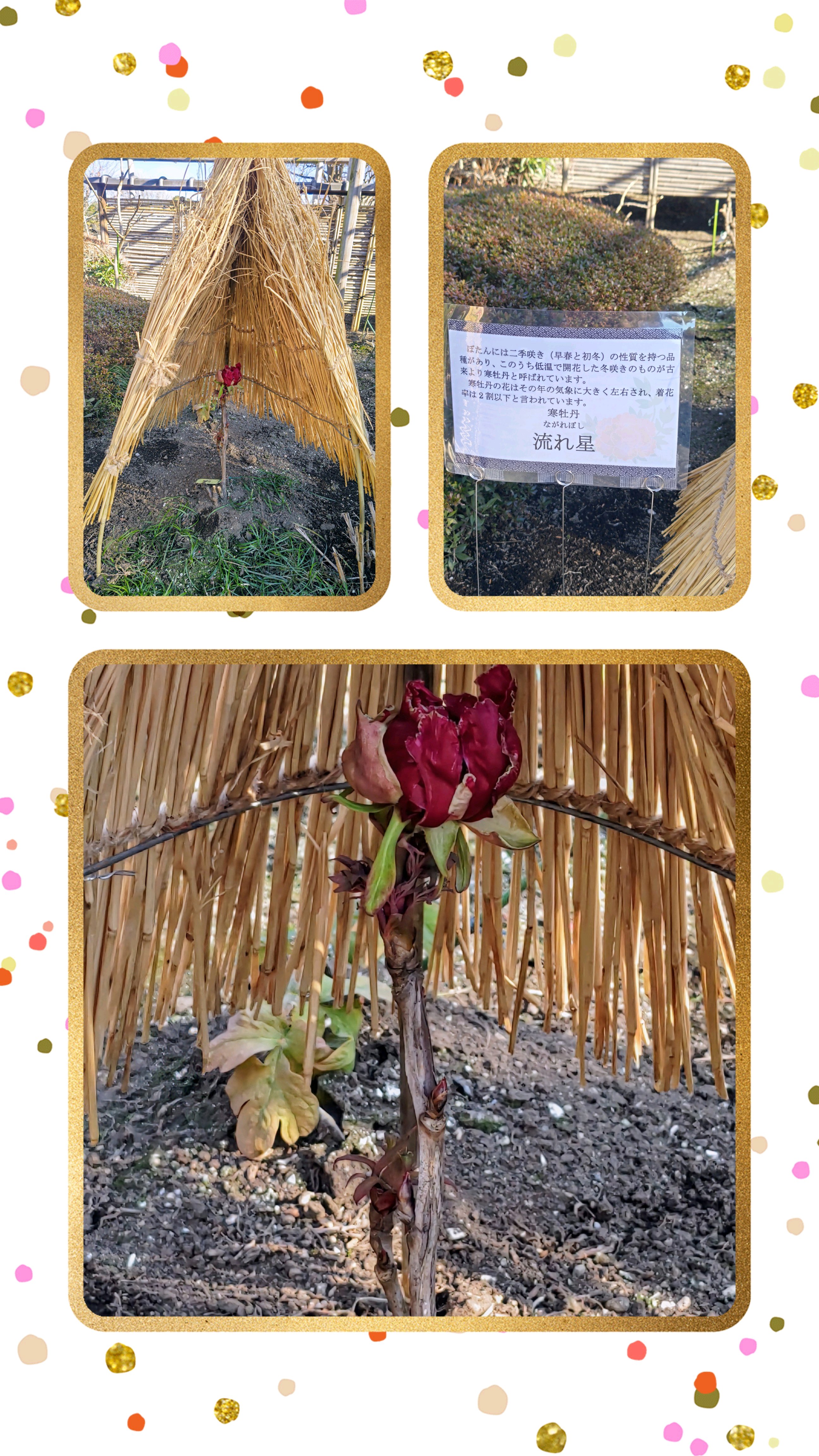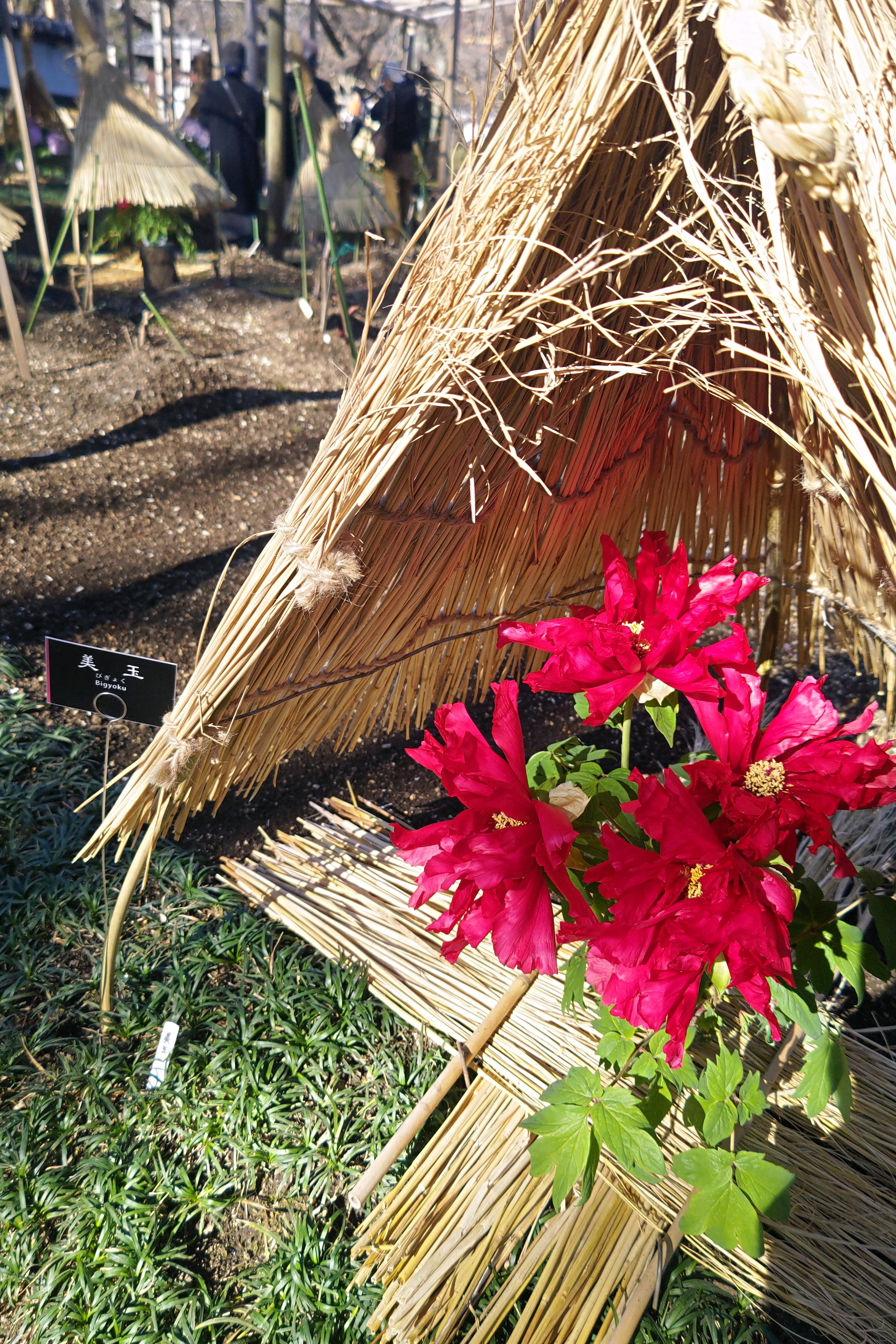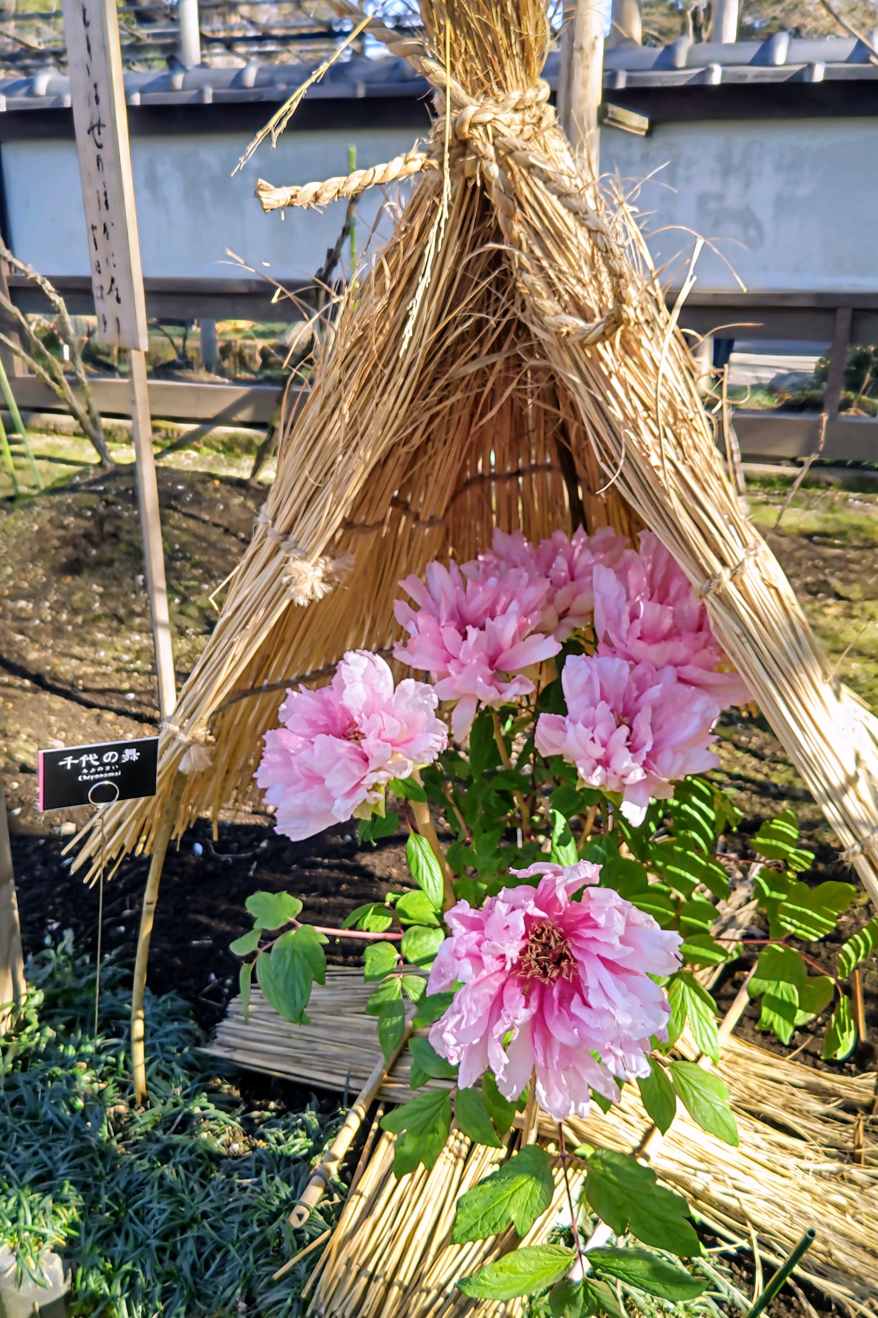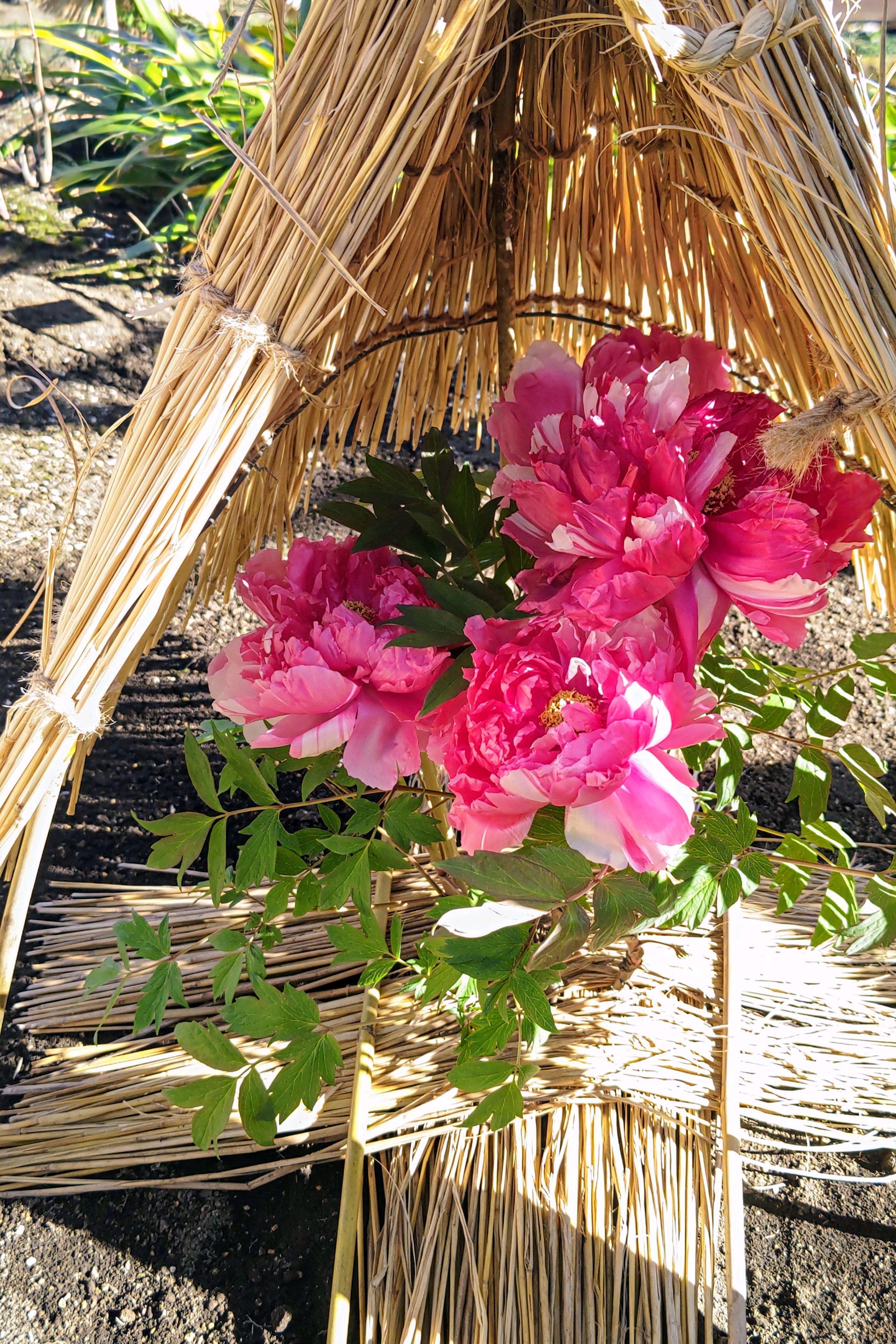 冬牡丹の着花率の低さに😳こうして花開くまでに、色々な困難乗り越えてるんだろなぁ。藁ボッチに守られた冬牡丹の姿。風情ありますね。