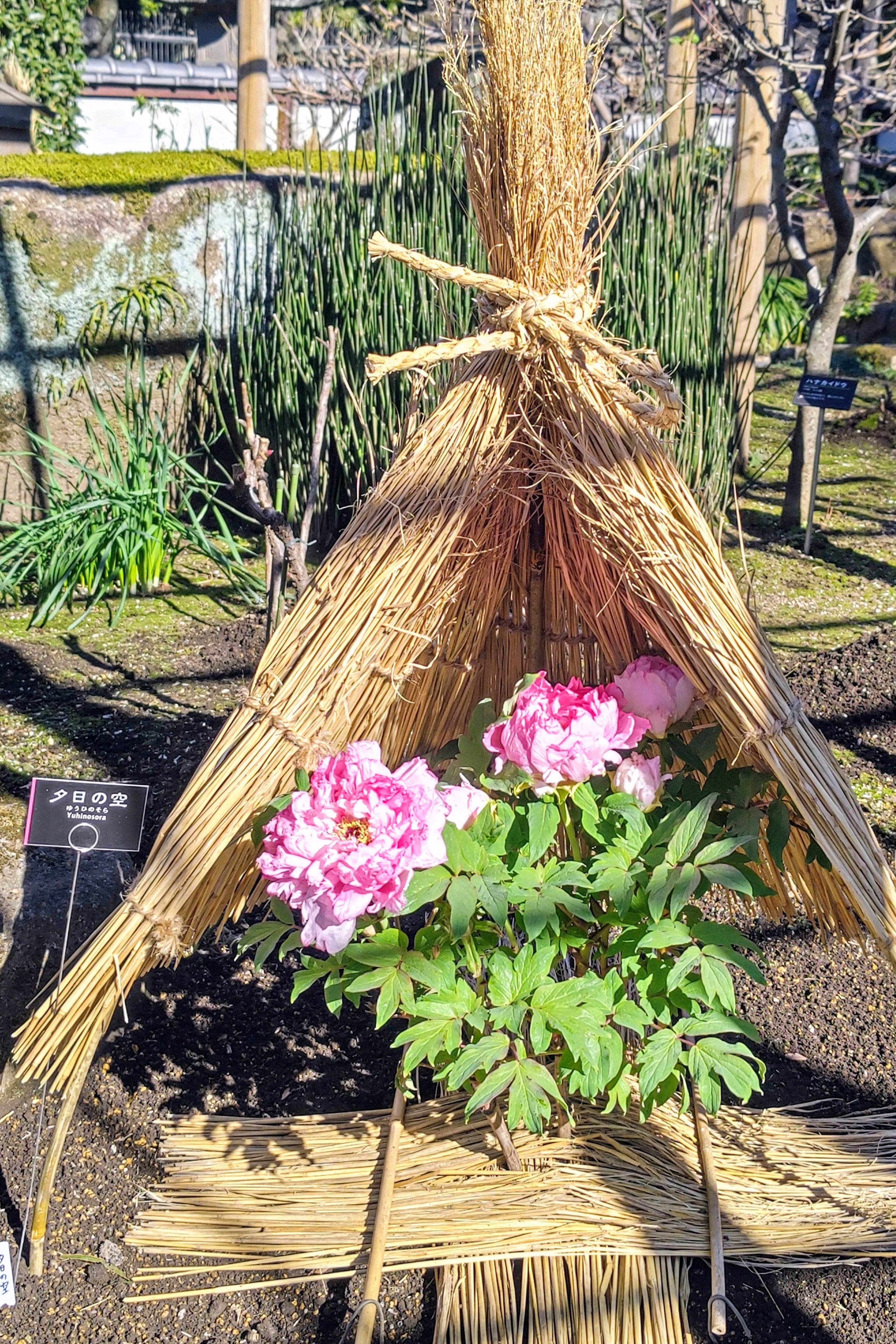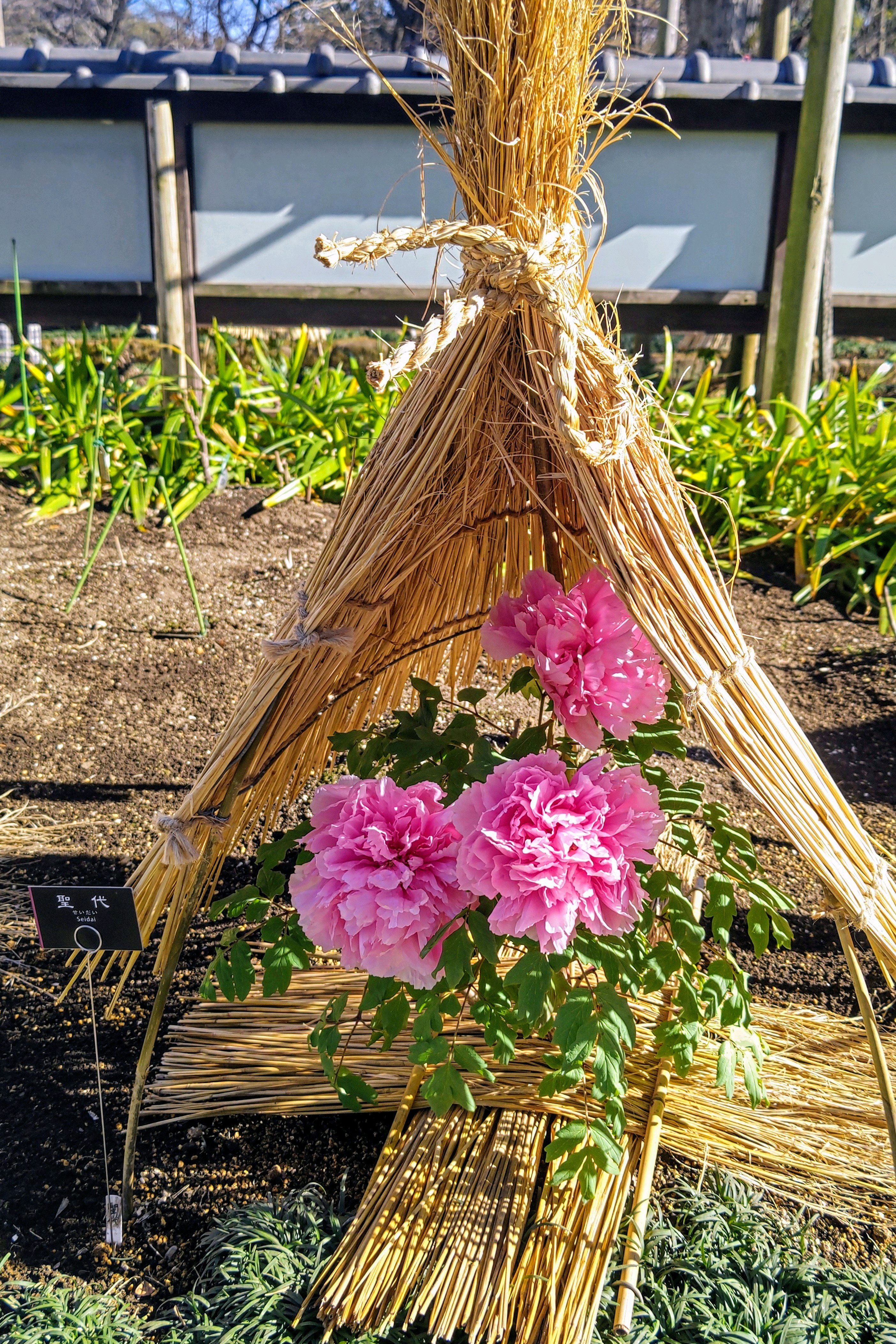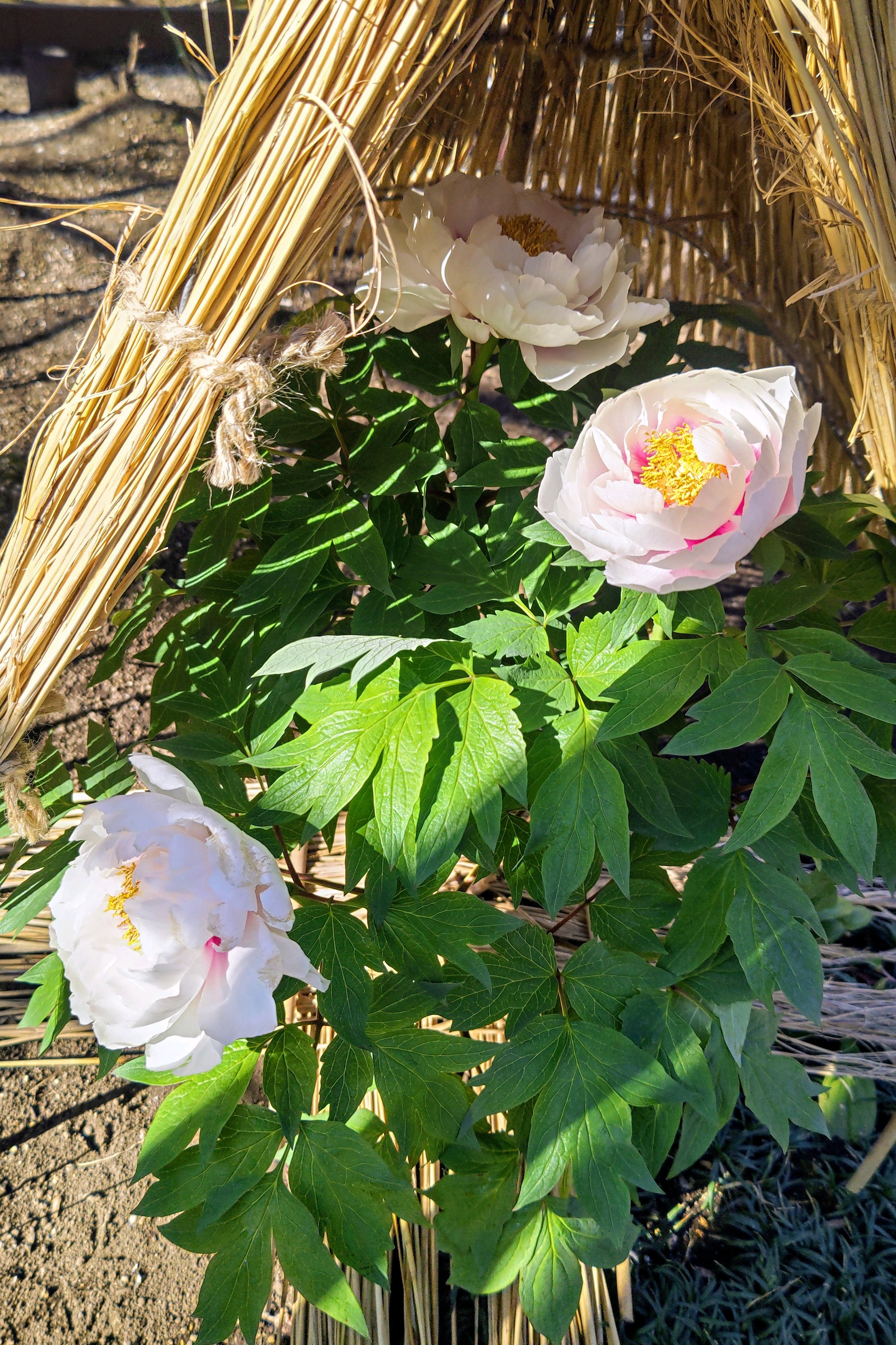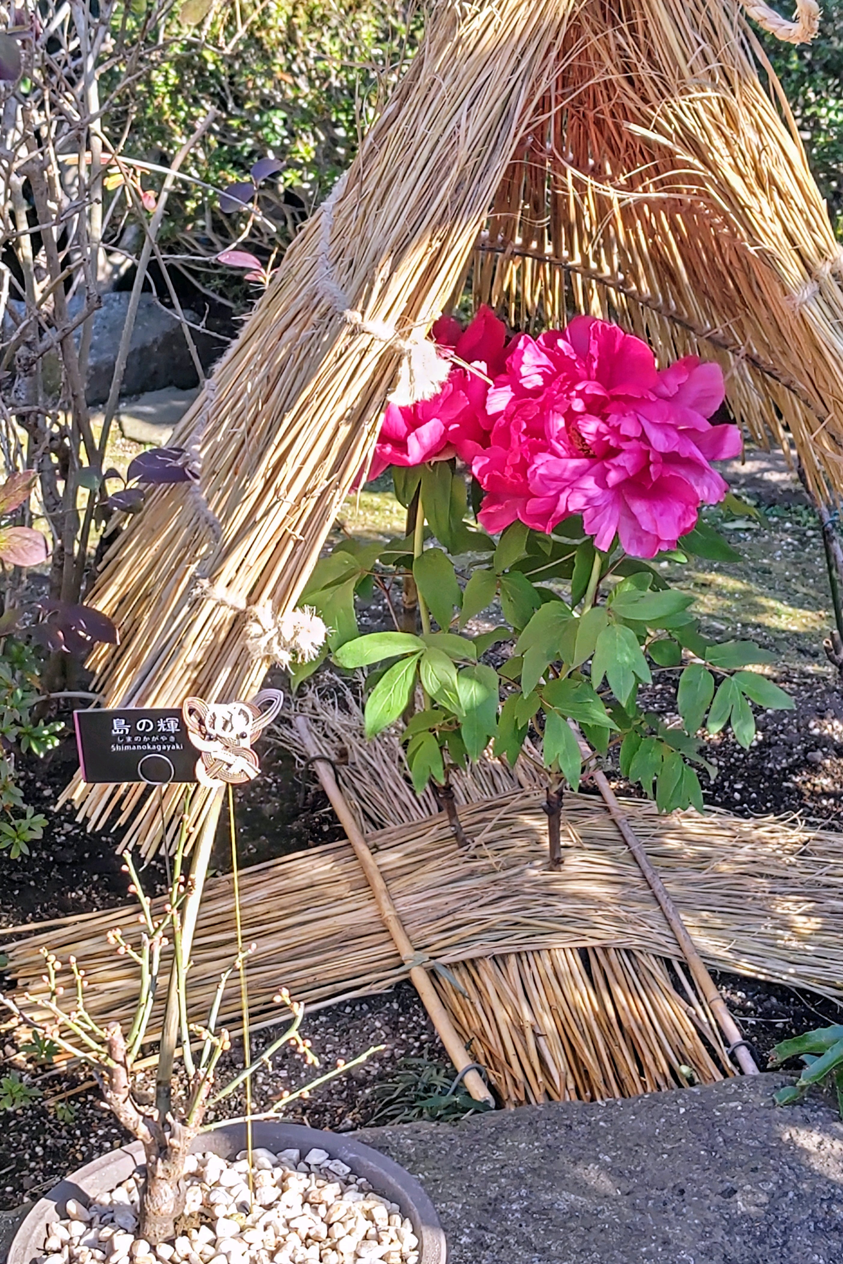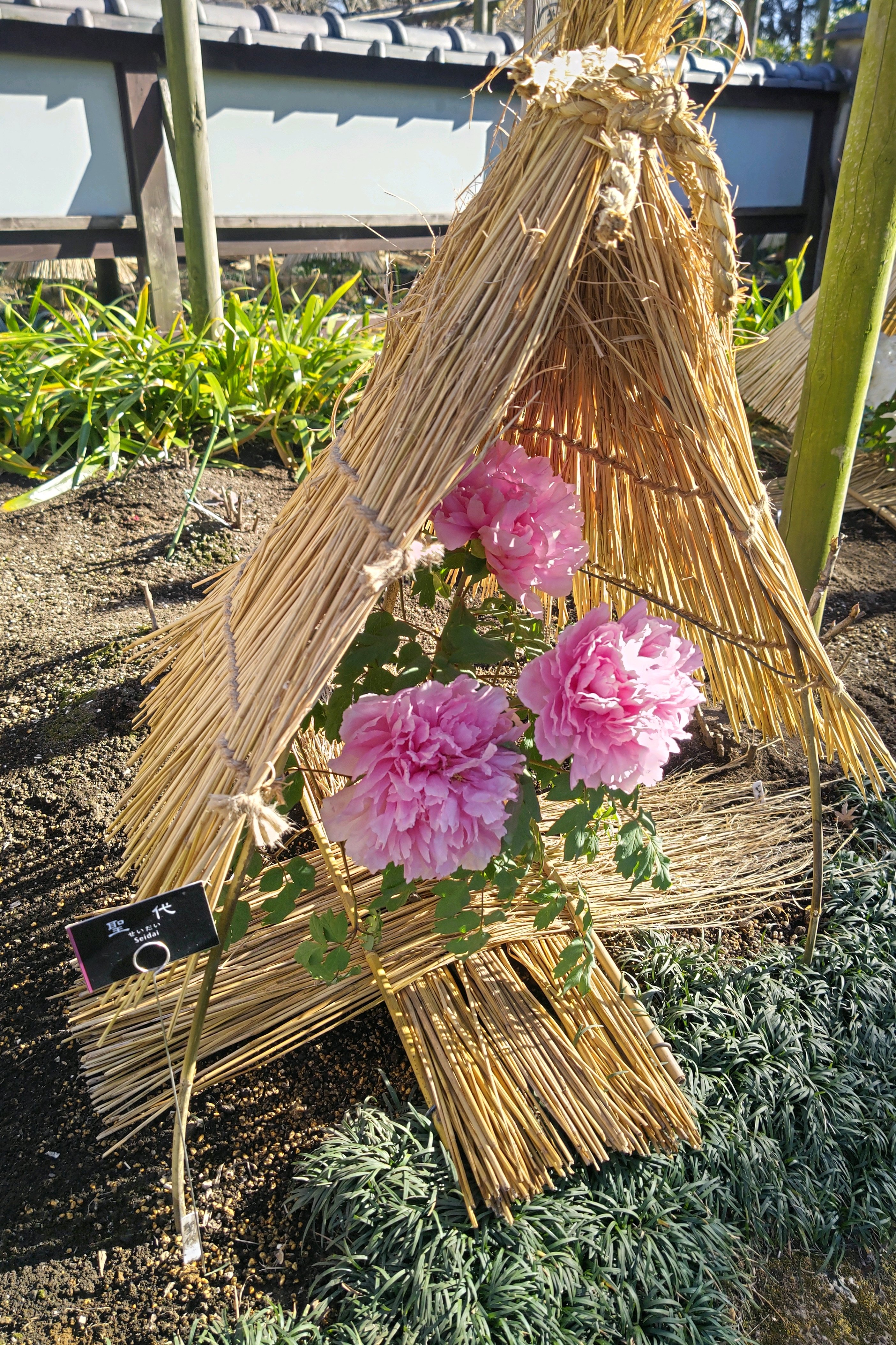 冬牡丹の着花率の低さに😳こうして花開くまでに、色々な困難乗り越えてるんだろなぁ。藁ボッチに守られた冬牡丹の姿。風情ありますね。