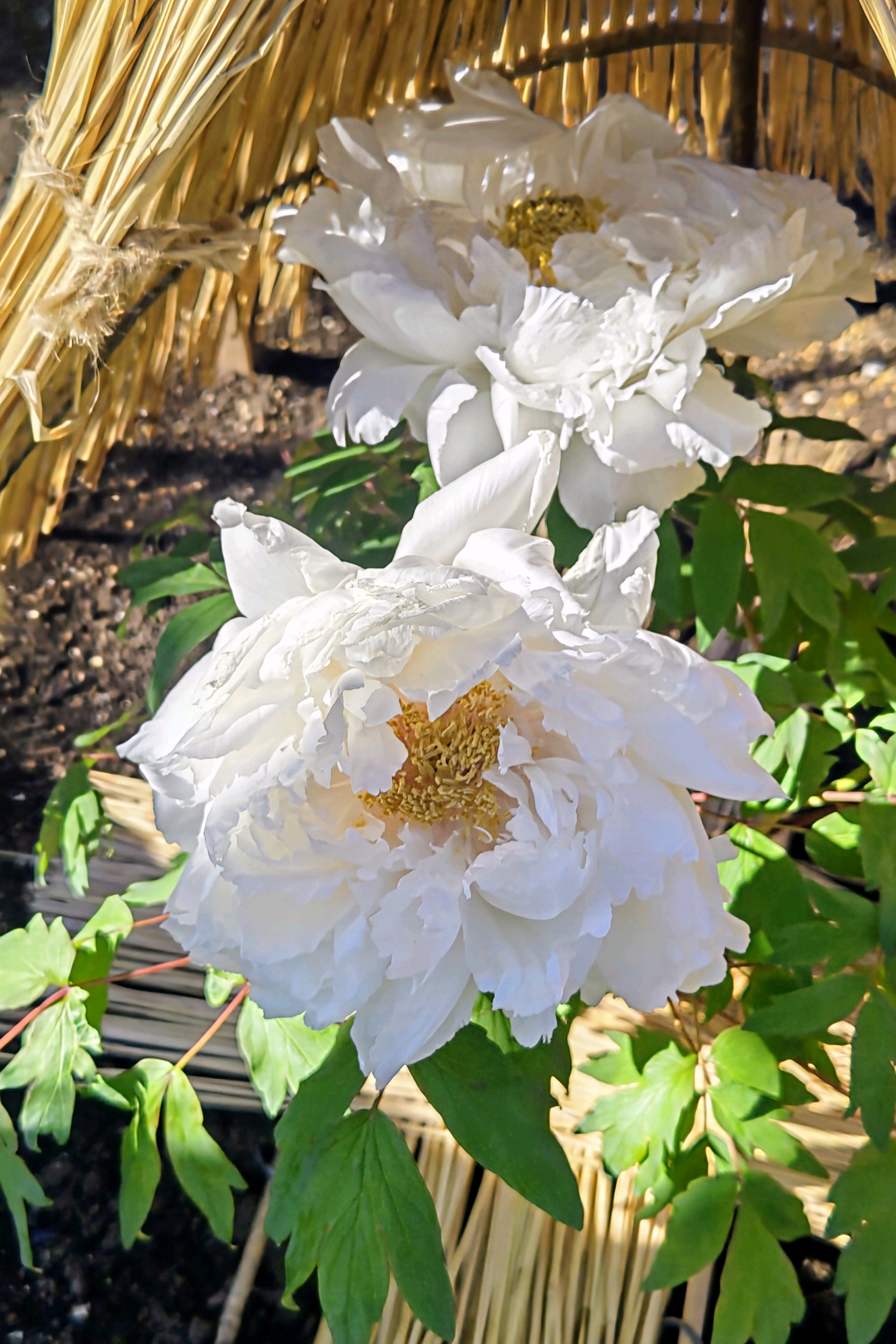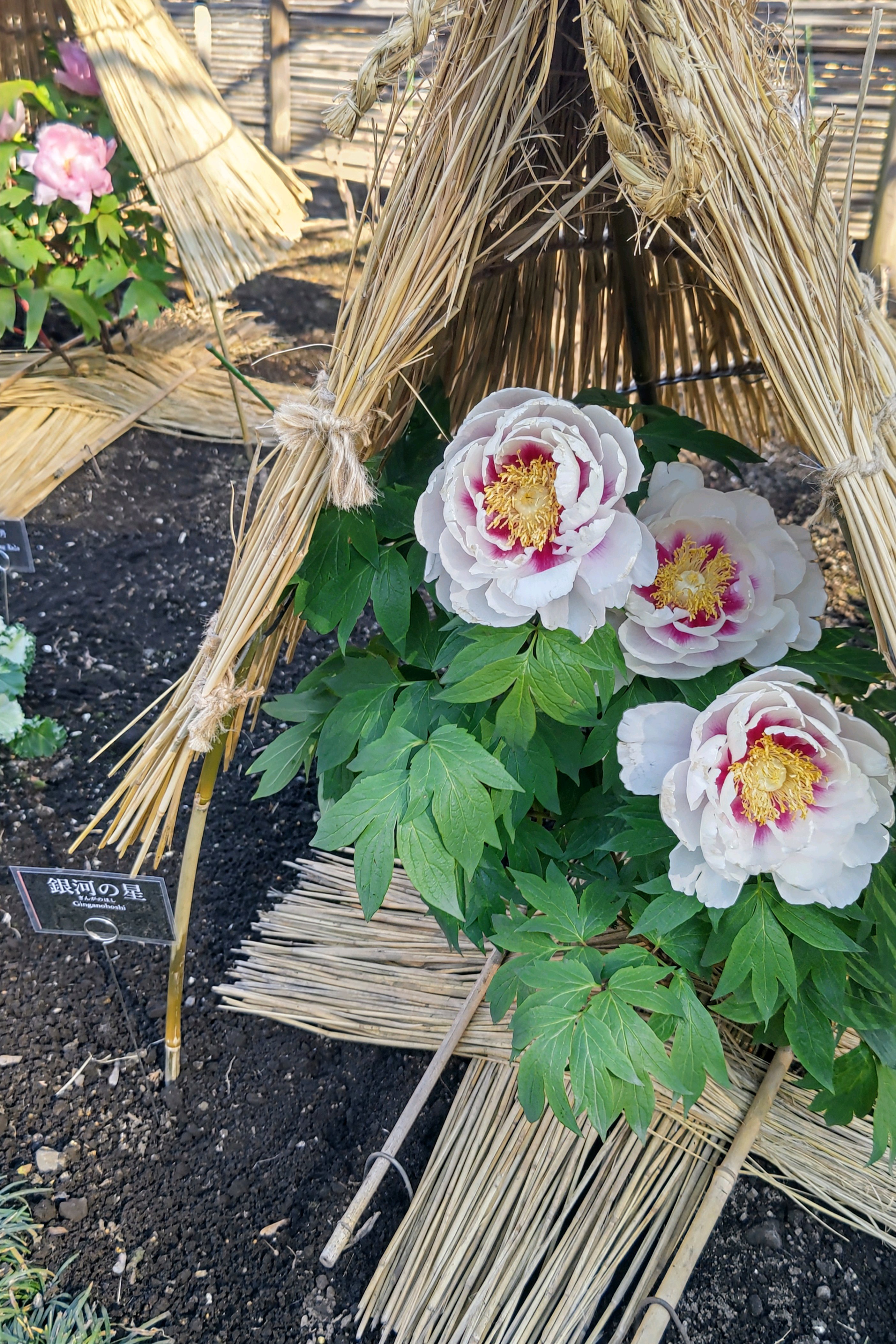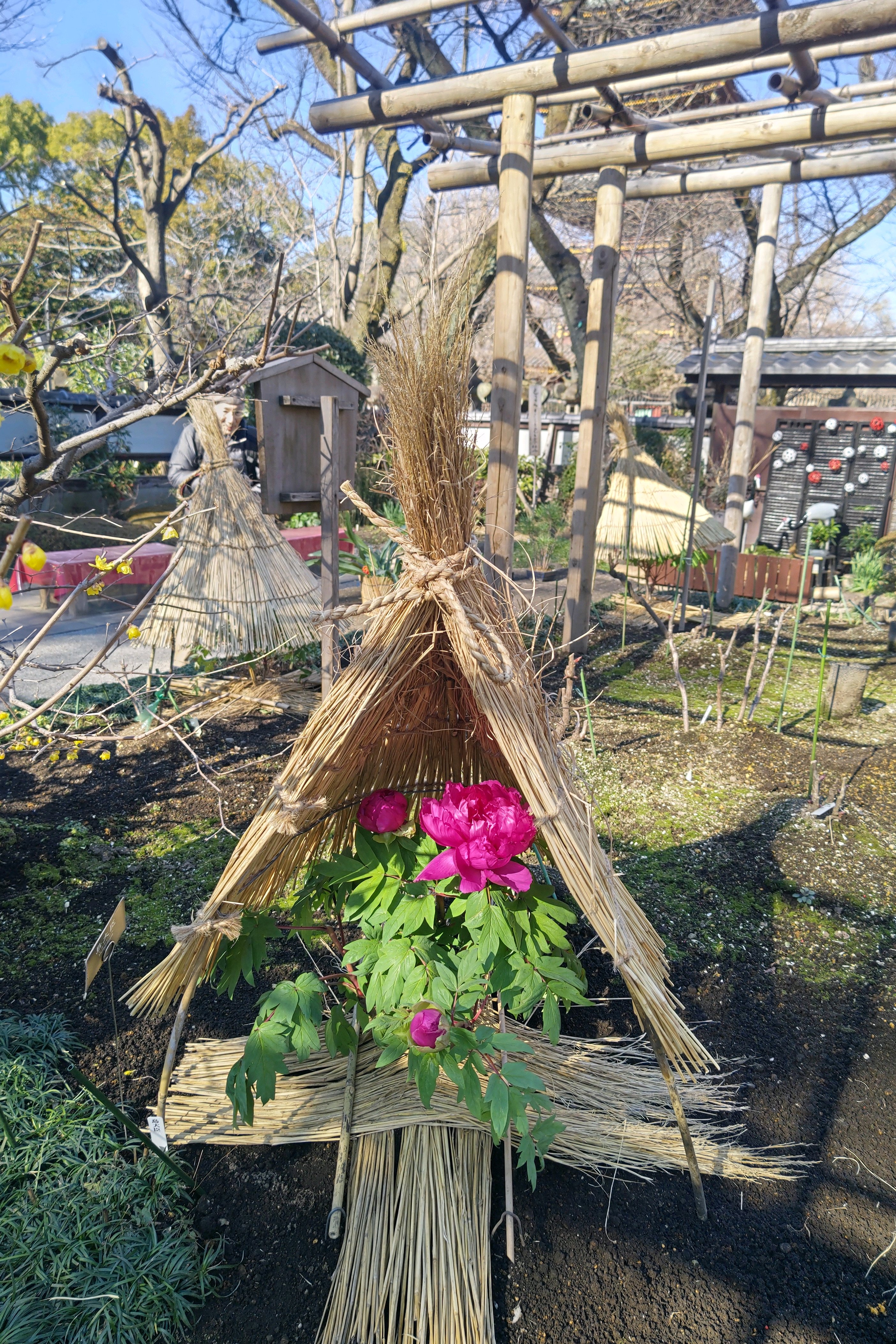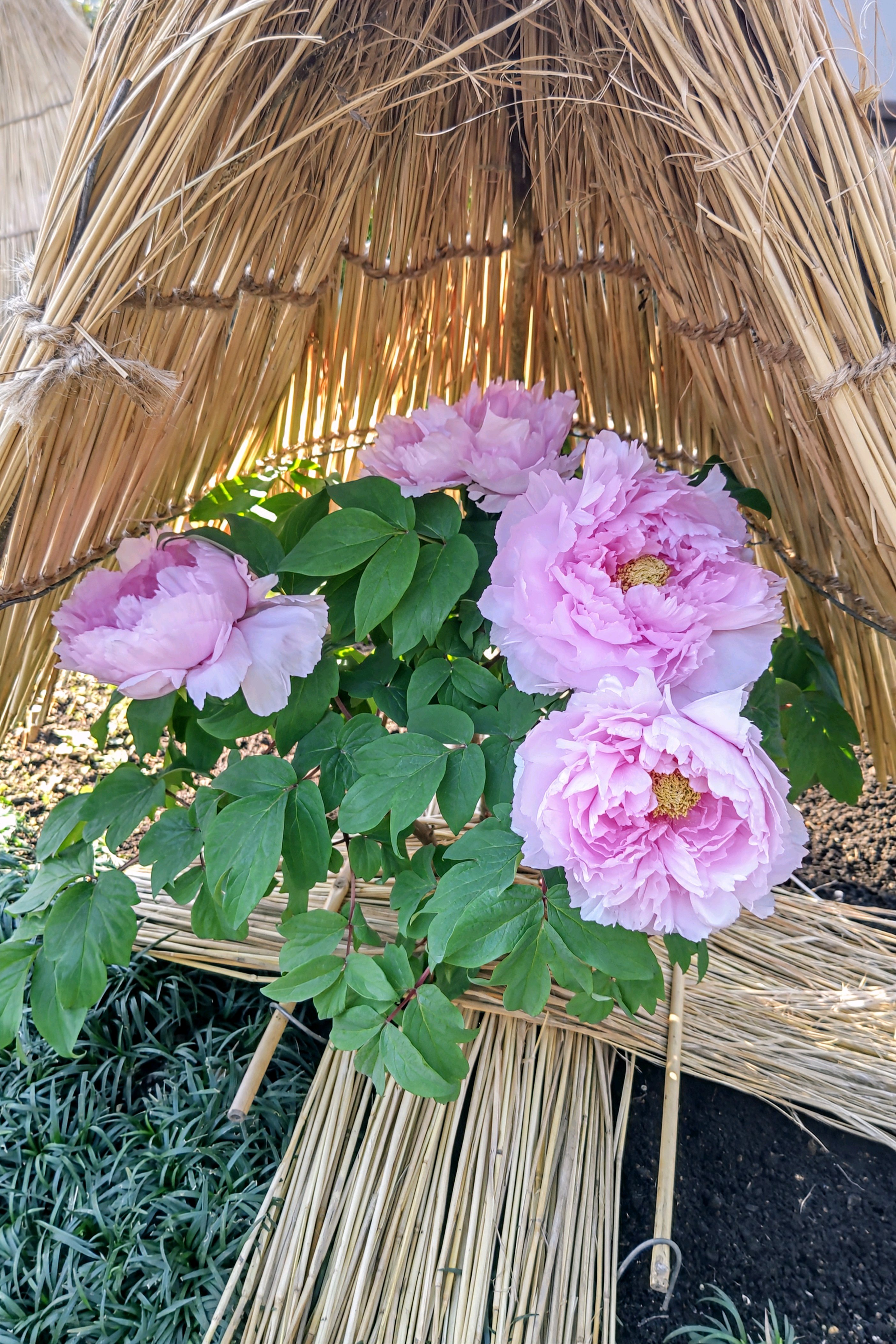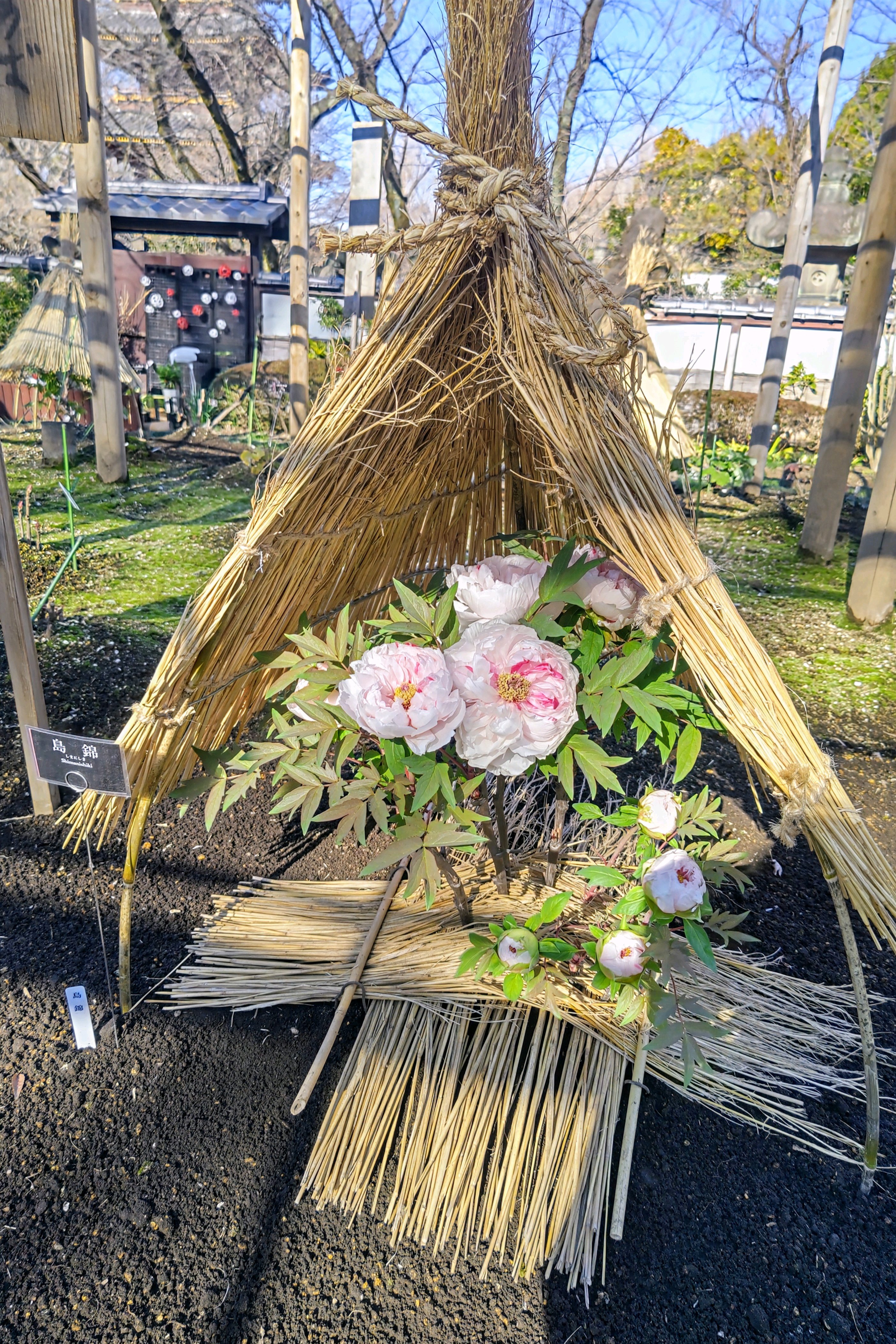 冬牡丹の着花率の低さに😳こうして花開くまでに、色々な困難乗り越えてるんだろなぁ。藁ボッチに守られた冬牡丹の姿。風情ありますね。