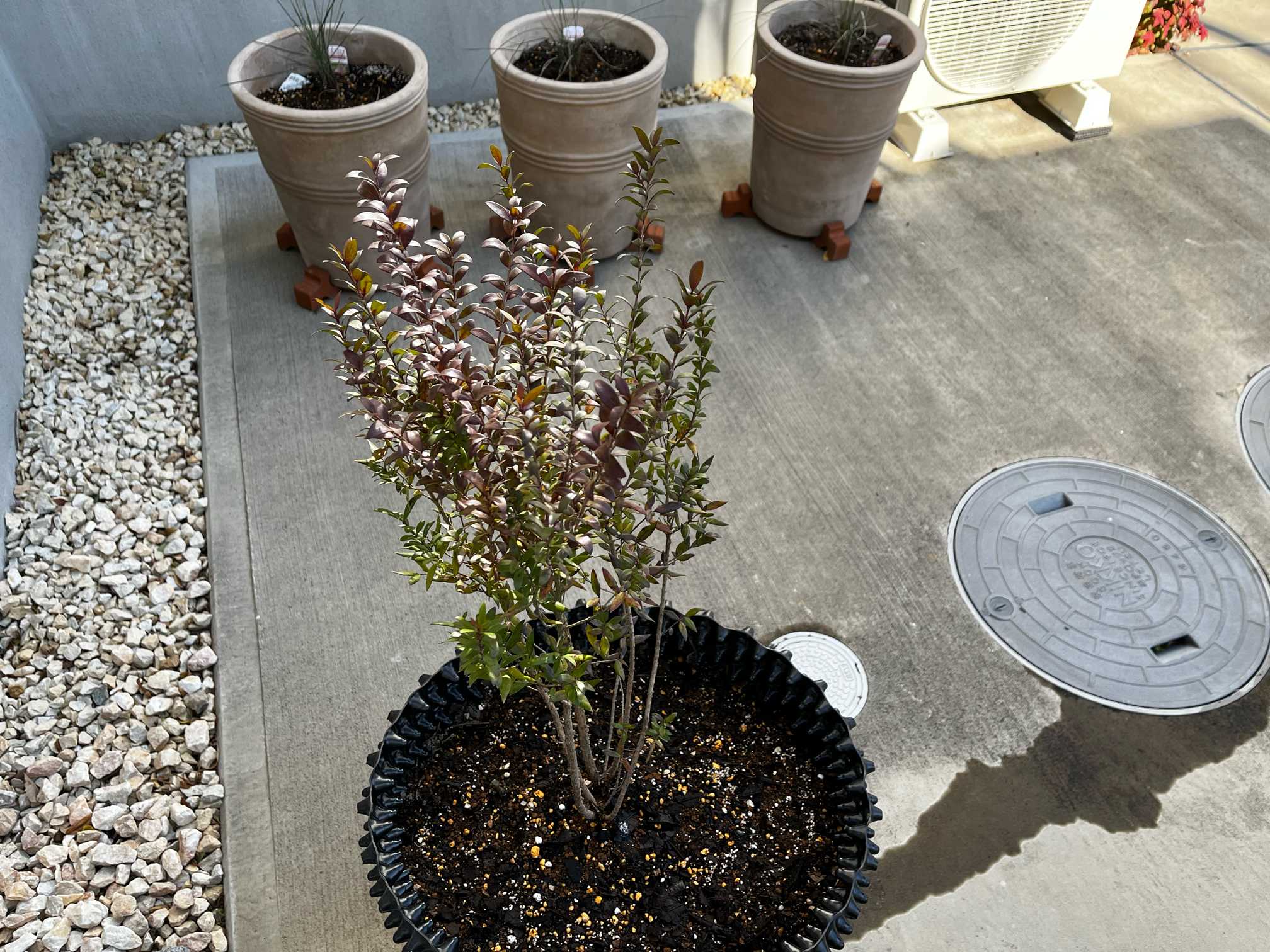 ギンバイカか届き植え付けをした。 最高気温15度、1月この時期にしては暖かかったが午後過ぎると北風が吹きぐんぐん気温が寒くなった。 葉っぱが緑ではなく銅色になっている。寒さと日照関係で常緑とはいえども葉色は変わる模様。