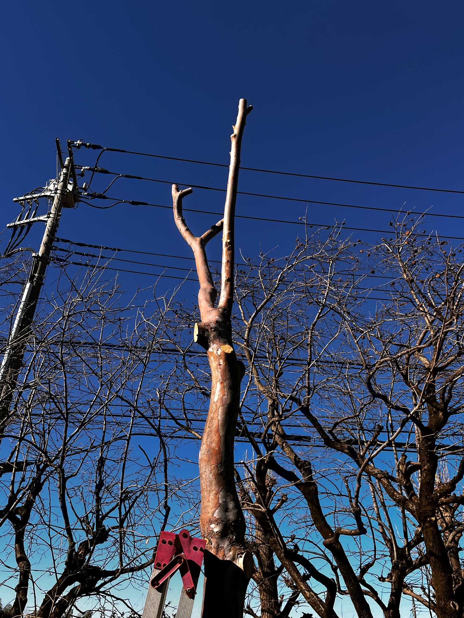 落とした枝がハシゴにぶつかり、ハシゴが弾かれた場合は、、、自分が落下してしまうので、ハシゴの位置と枝を落とす方向を定めてから刃を入れる様にします。